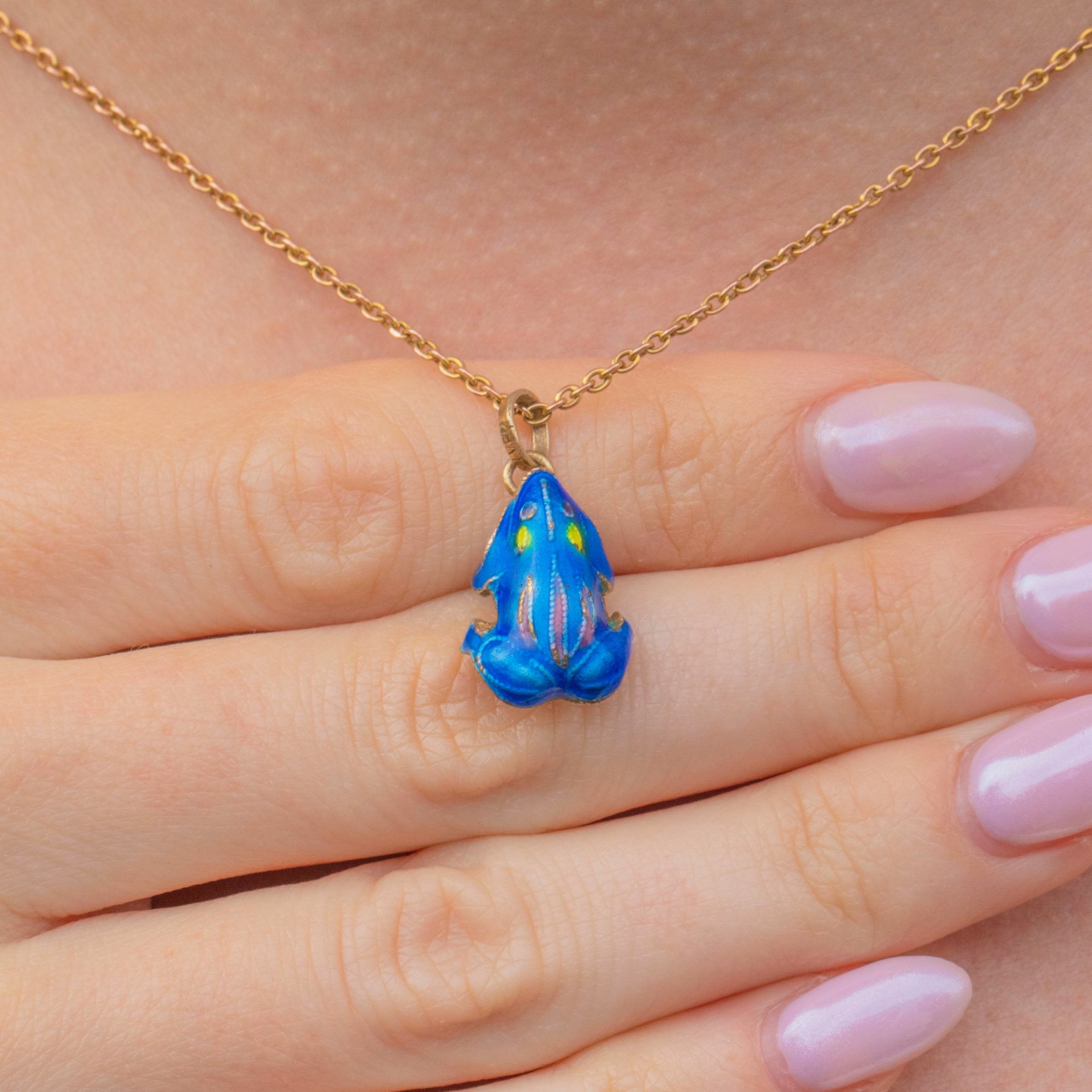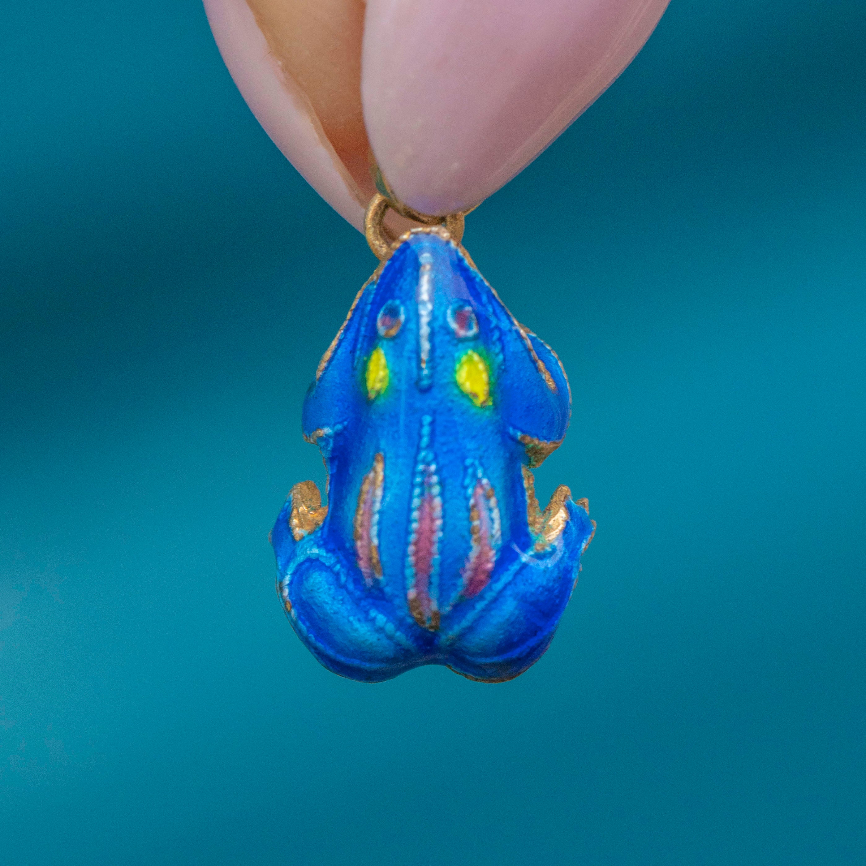 This happy little Silver Blue Enamel Frog charm is a joyful delight! Crafted in Silver and gilded with a buttery 9ct Gold, this Mid-Century frog charm boasts an exquisitely detailed blue Enamel body with realistic markings in yellows and oranges.