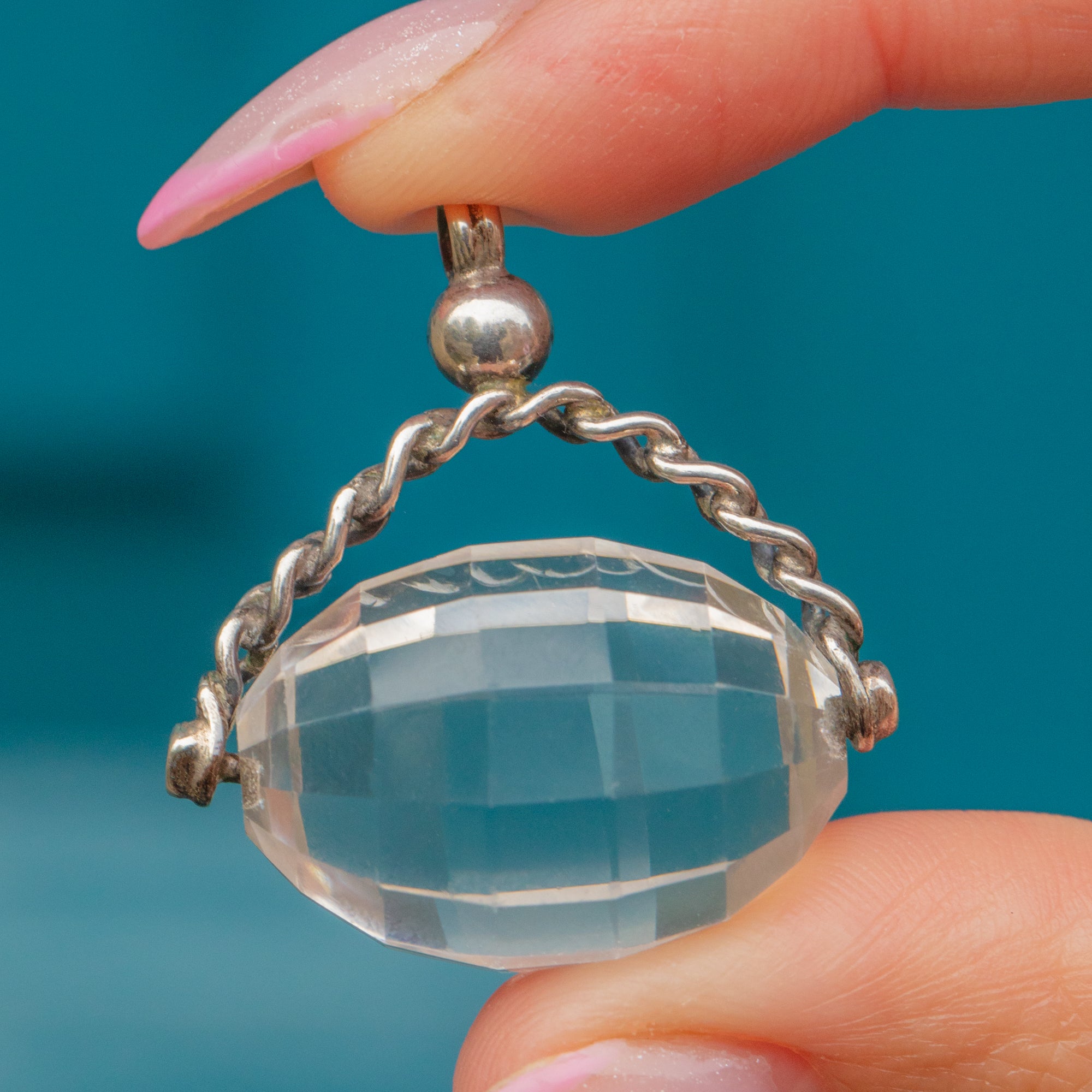 The Silver frame and twisted bar detail are typical of the hand-crafted aesthetic of the Arts & Crafts era, and the Rock Crystal spins smoothly within its setting. A wonderful statement fob or pendant, the perfect adornment for a chain.