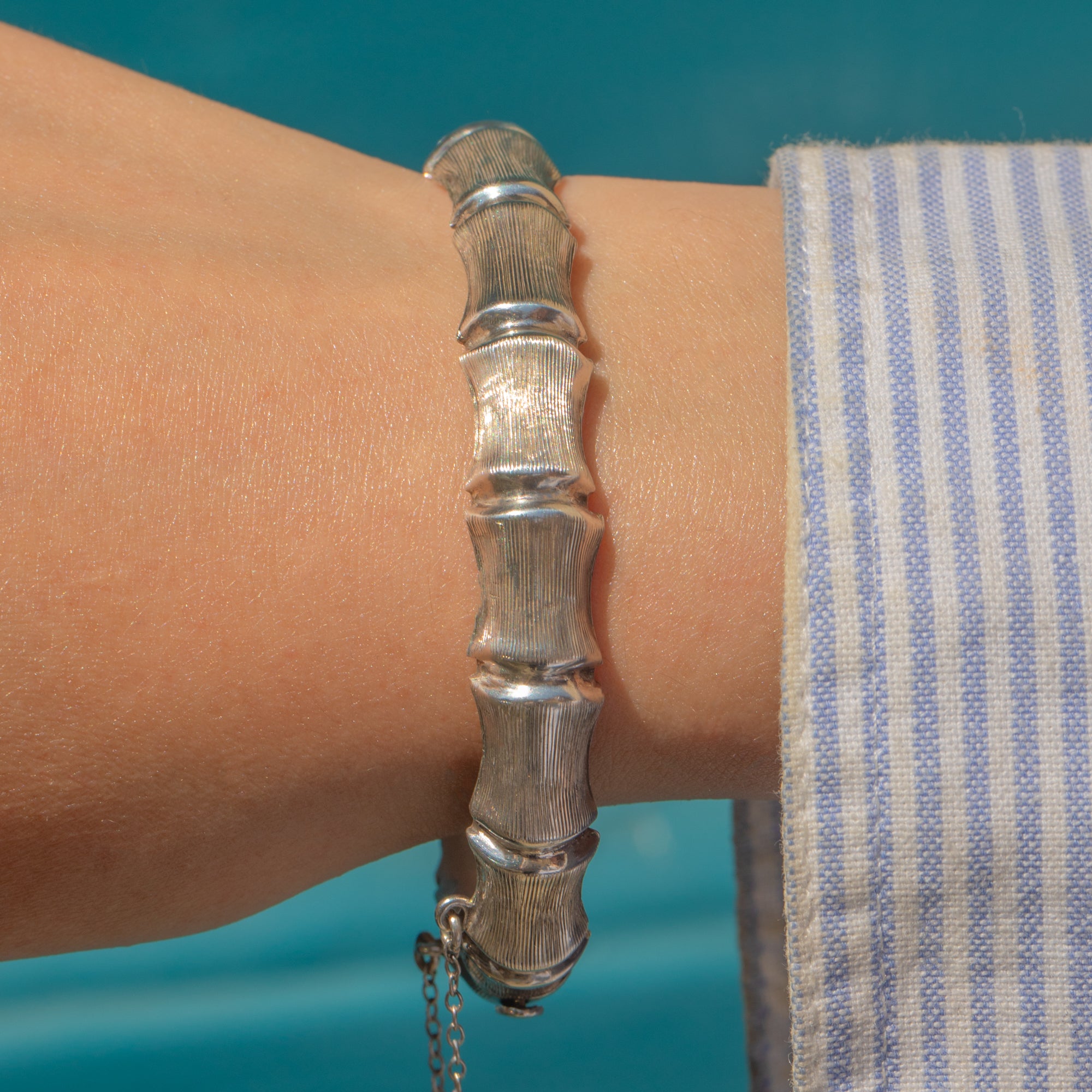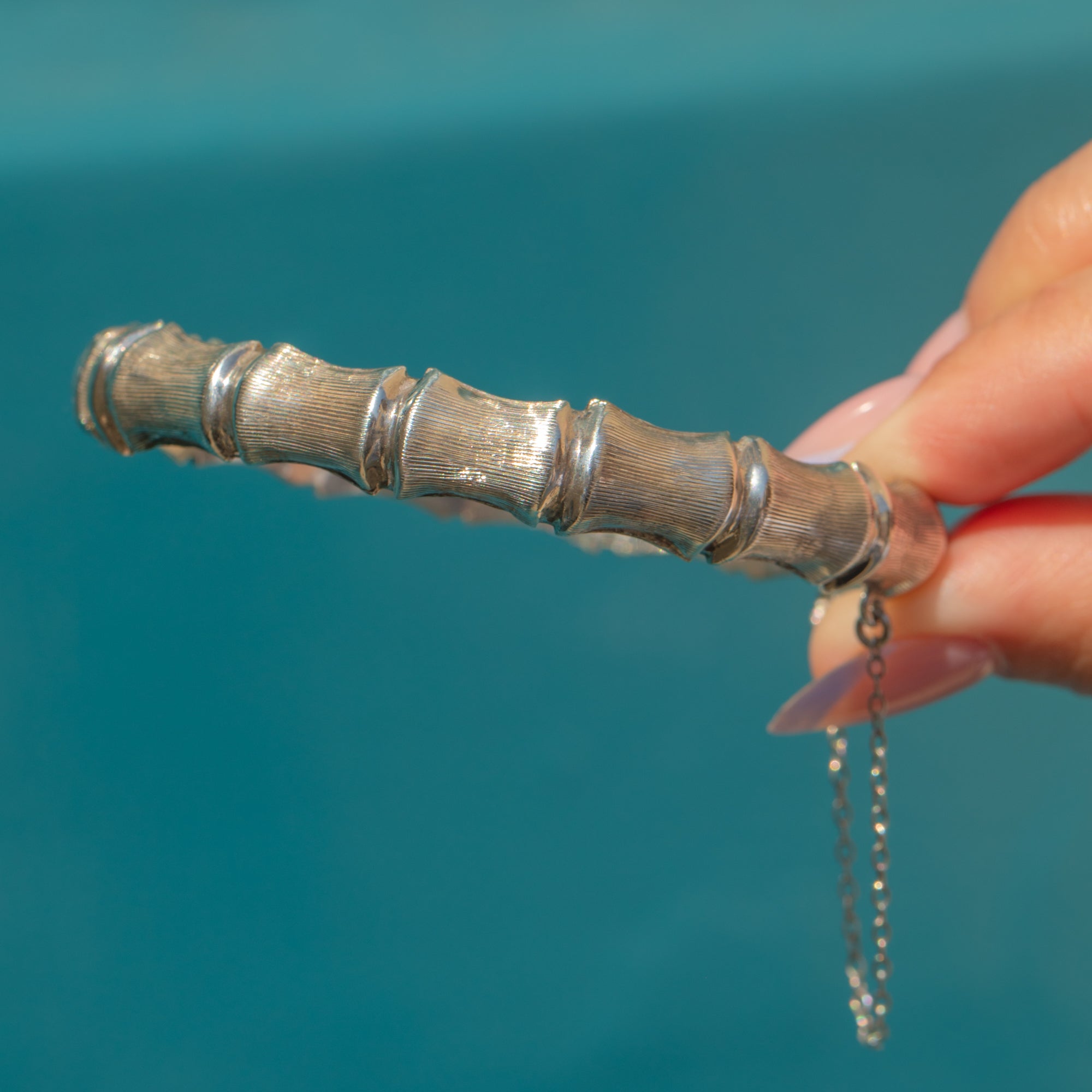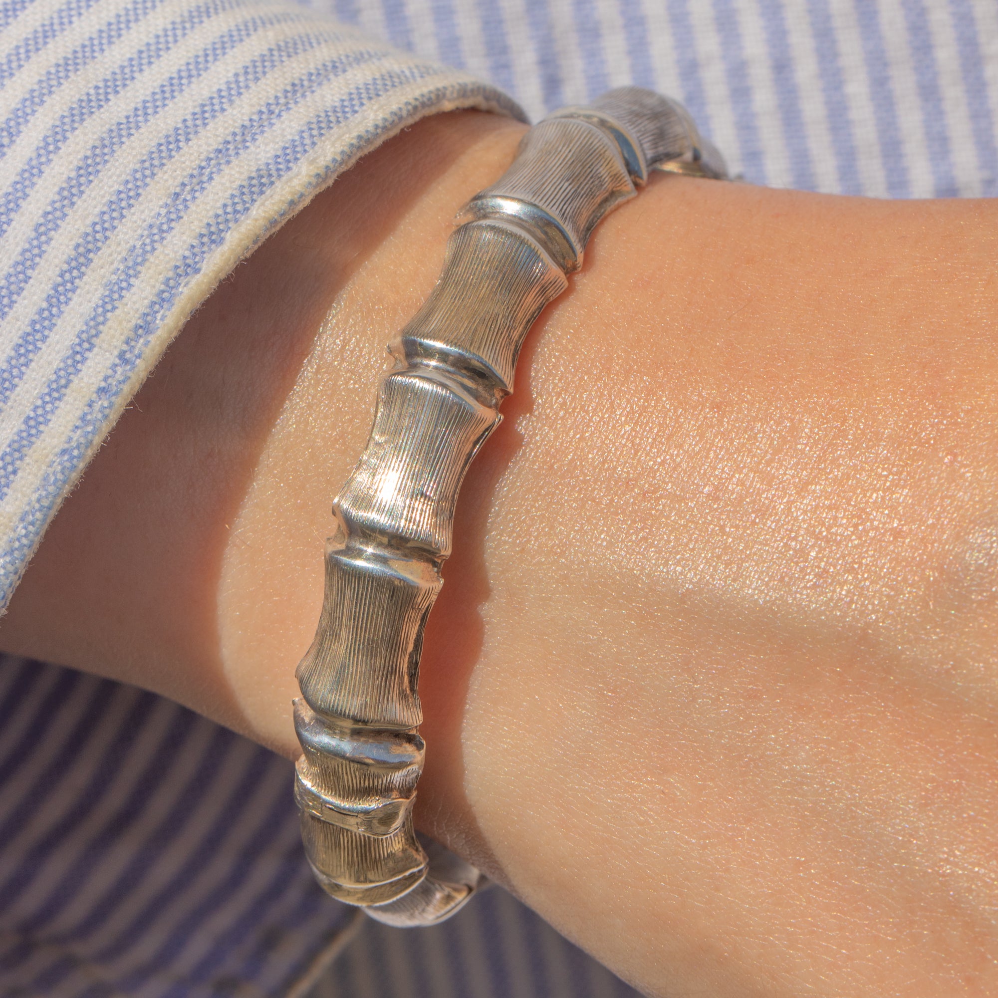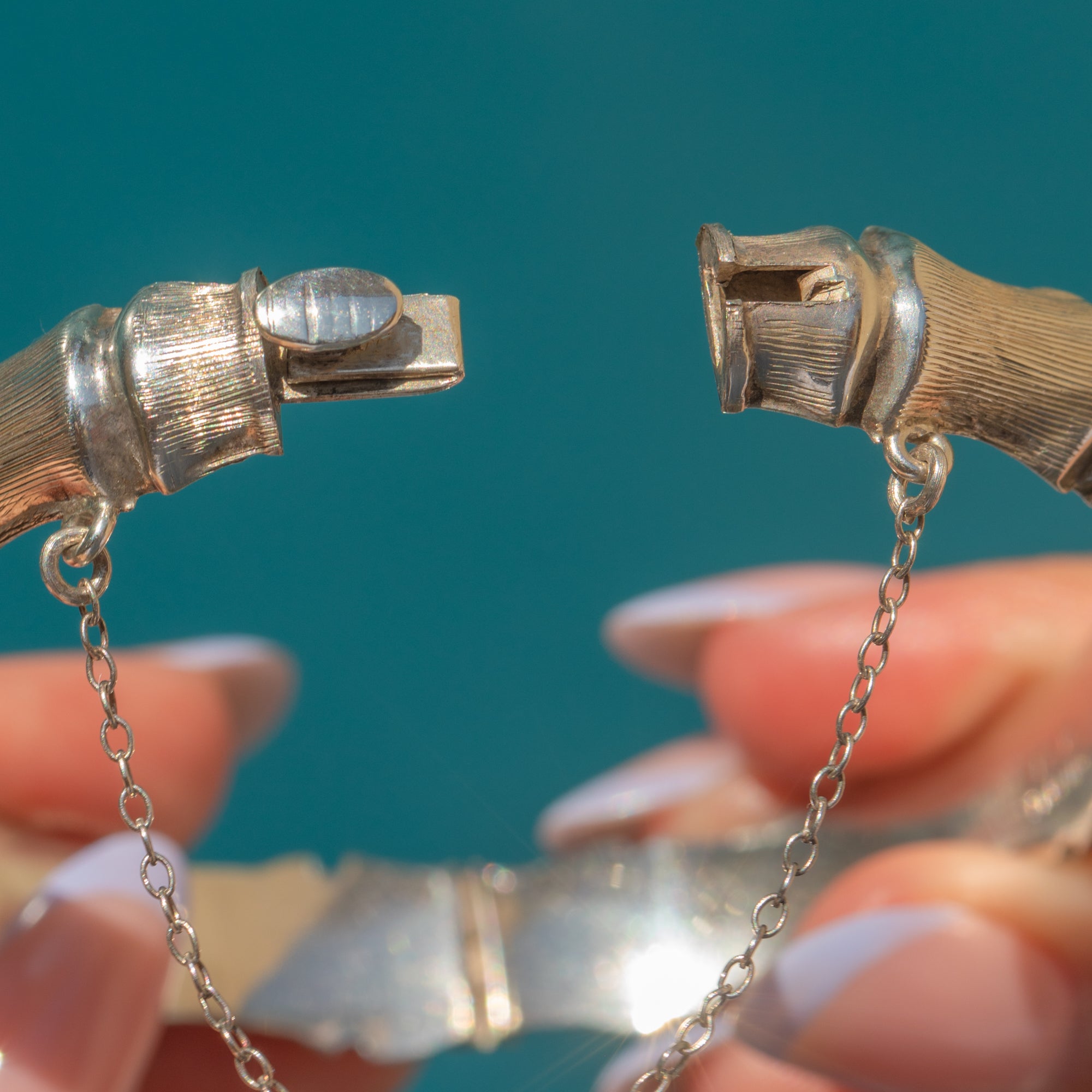 This is a lovely Silver engraved bamboo bangle! Dated to 1976, this Vintage bangle can be worn comfortably, with her gorgeous puffed bamboo design catching the light beautifully.