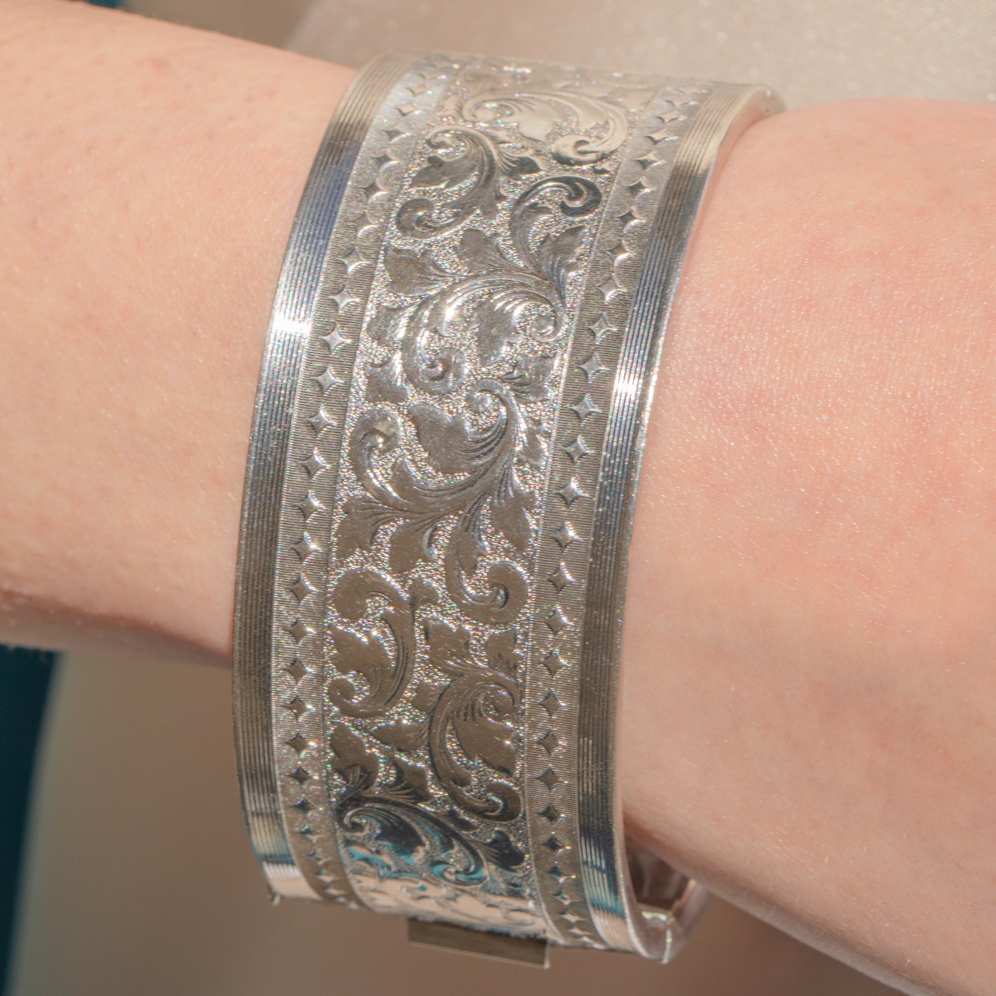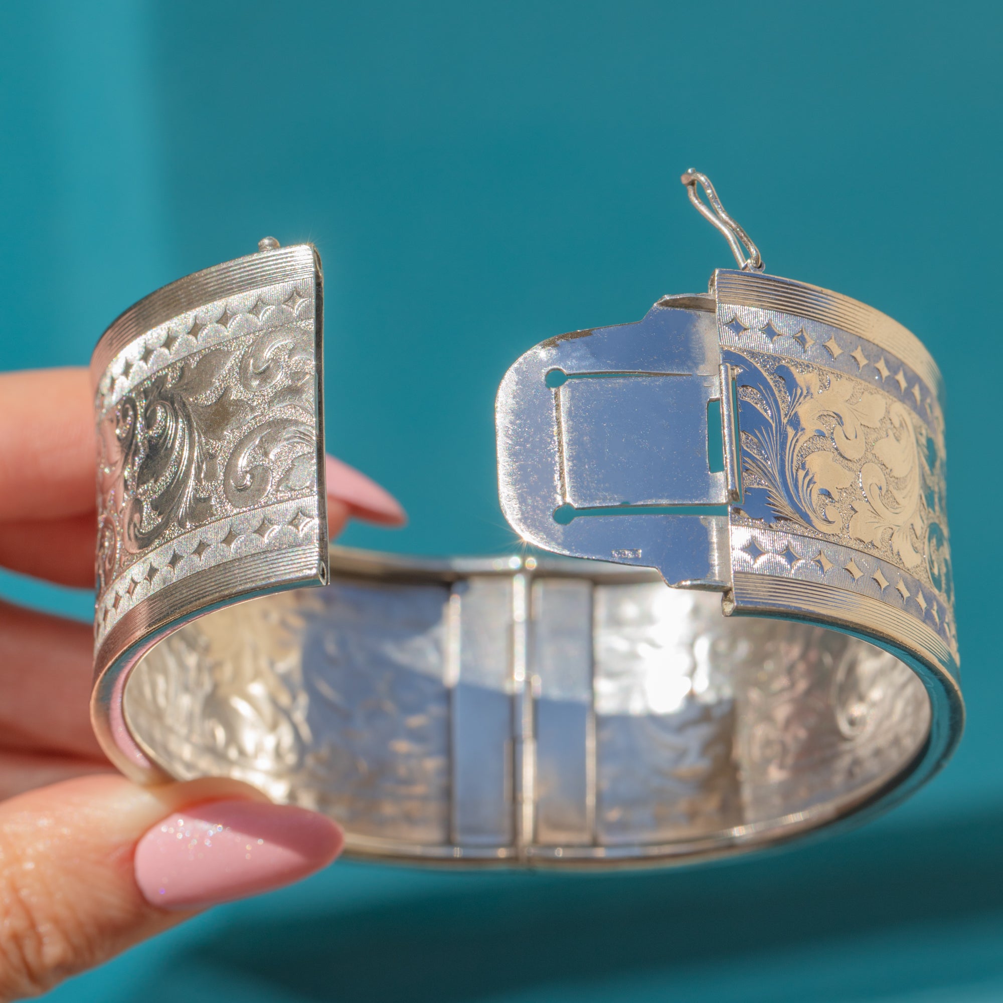 This Silver engraved cuff bangle will become an everyday essential! Intricately engraved floral details span the entire circumference of this vintage bangle, with sweeping lines that catch the light beautifully.