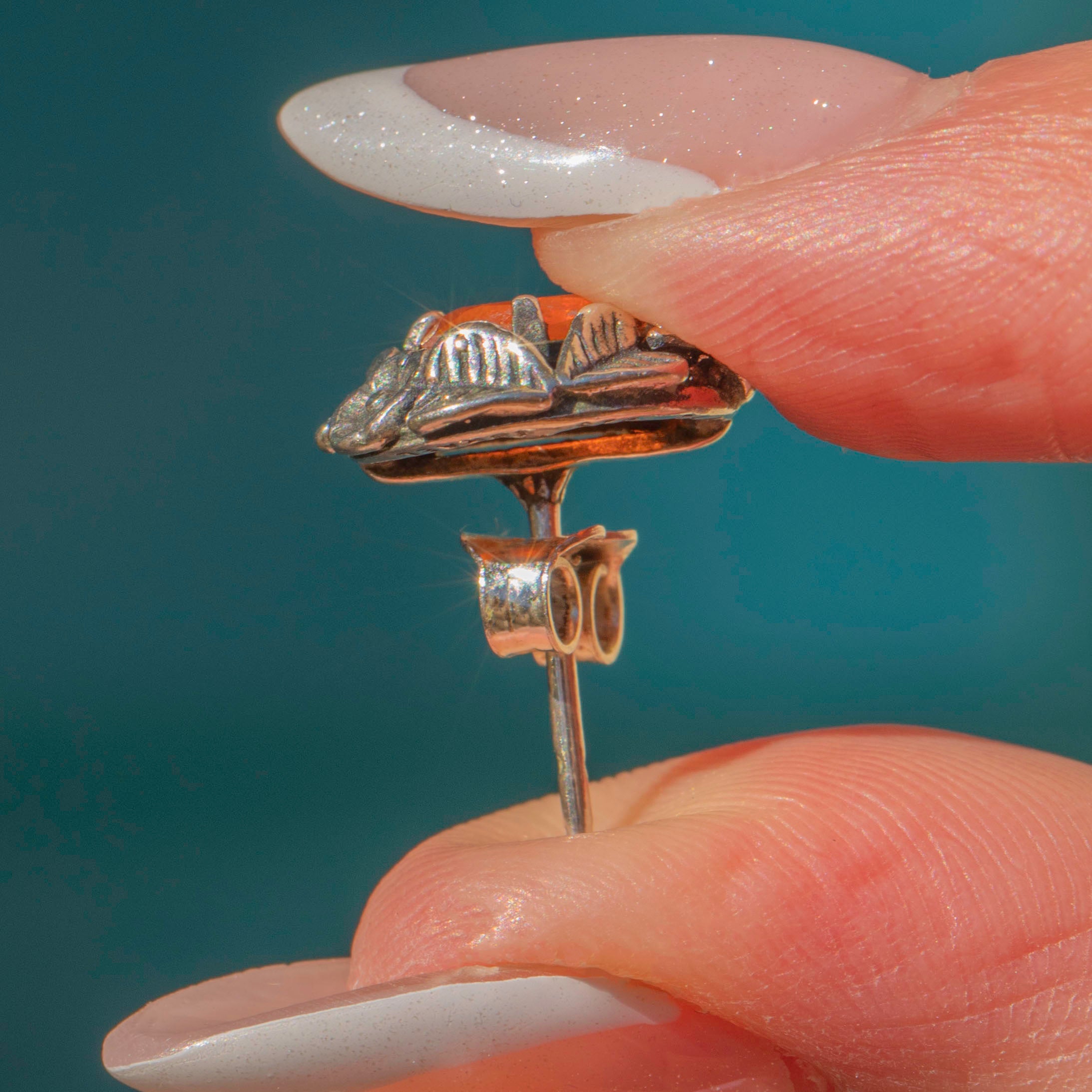 Each earring features a vibrant fire Opal in her centre, radiating saturated umber tones as they catch the light. Both are set within lustrous Silver floral settings, providing a lovely texture and depth.