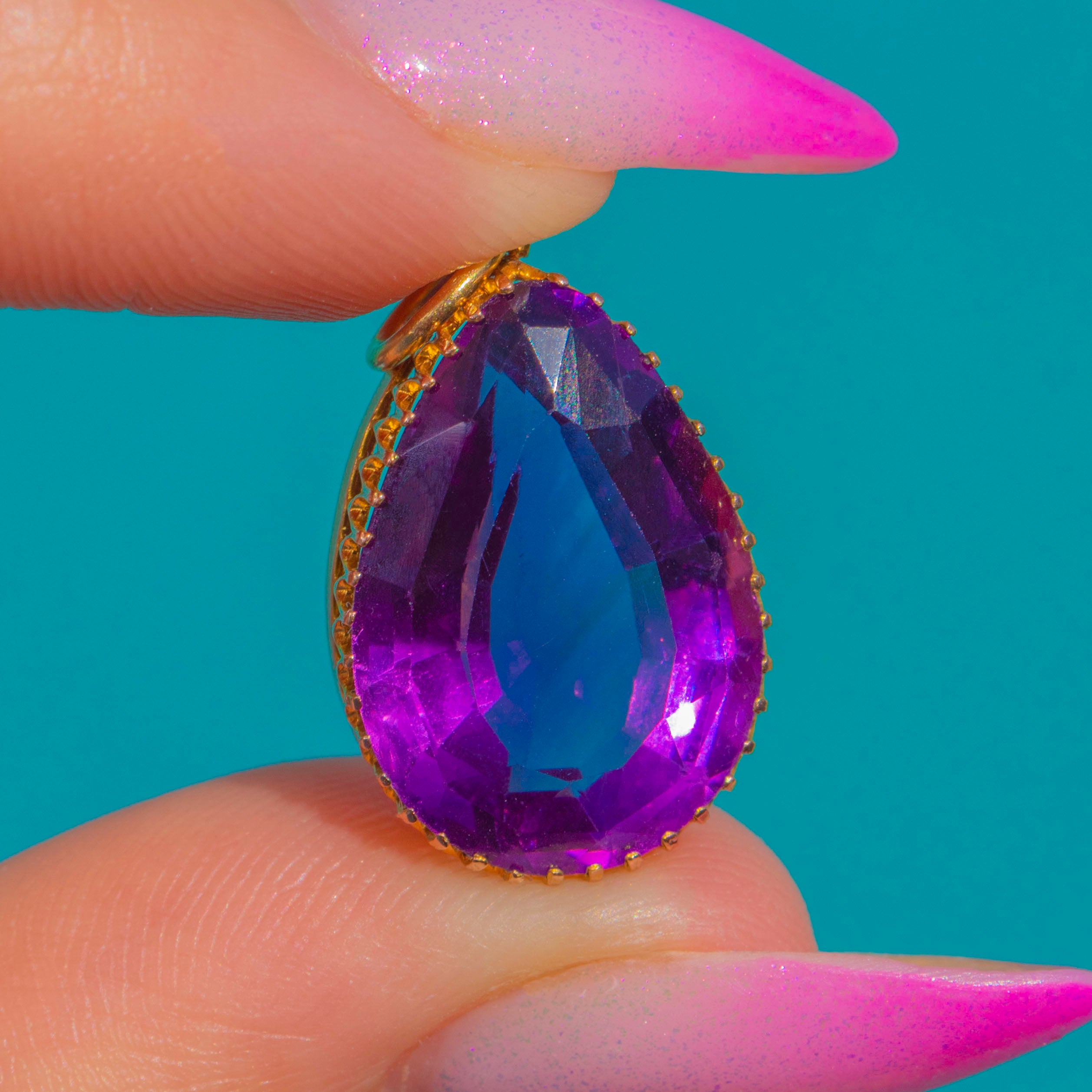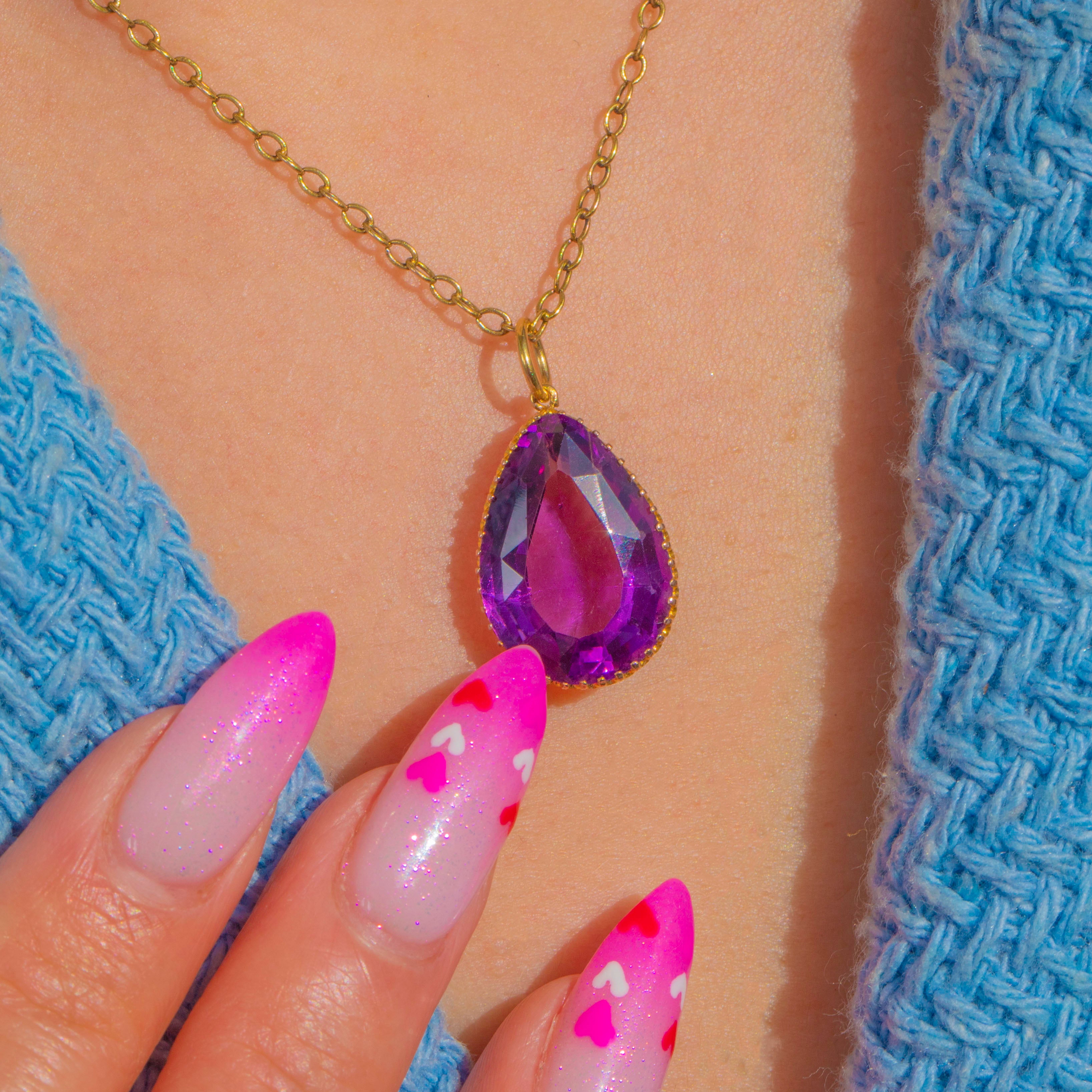 輝きに満ちたVictorianペンダント。贅沢なペアシェイプのアメシストが、上質な15ctゴールドにセットされています。鮮やかな紫色のジェムストーンが主役となり、エレガントなティアドロップシルエットを繊細なゴールドの爪が美しく縁取り、時代を超えたロマンティックな雰囲気を演出します。
