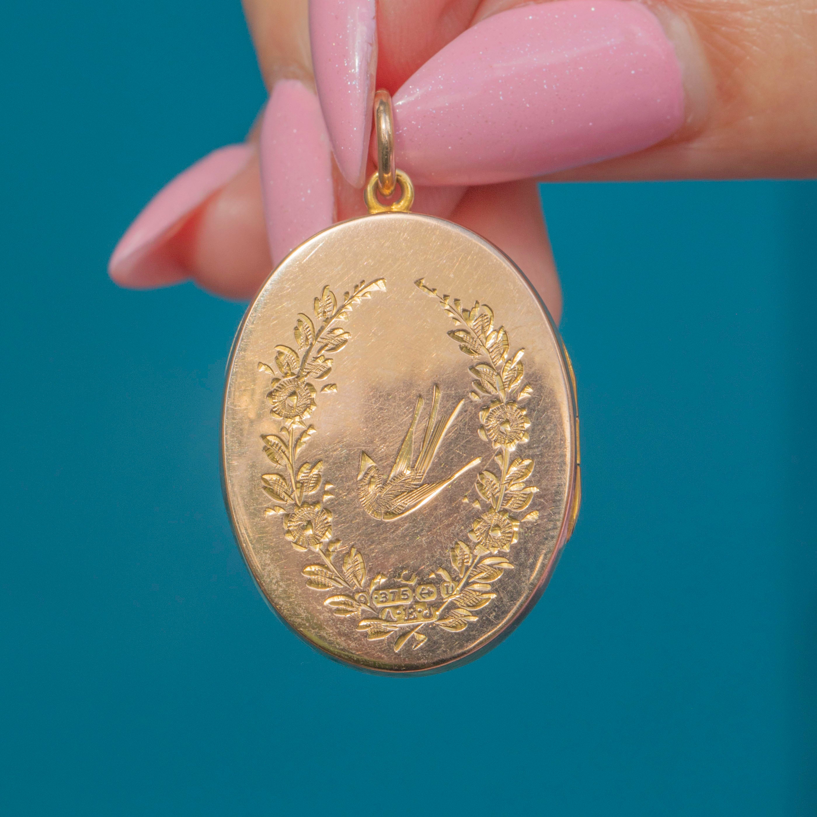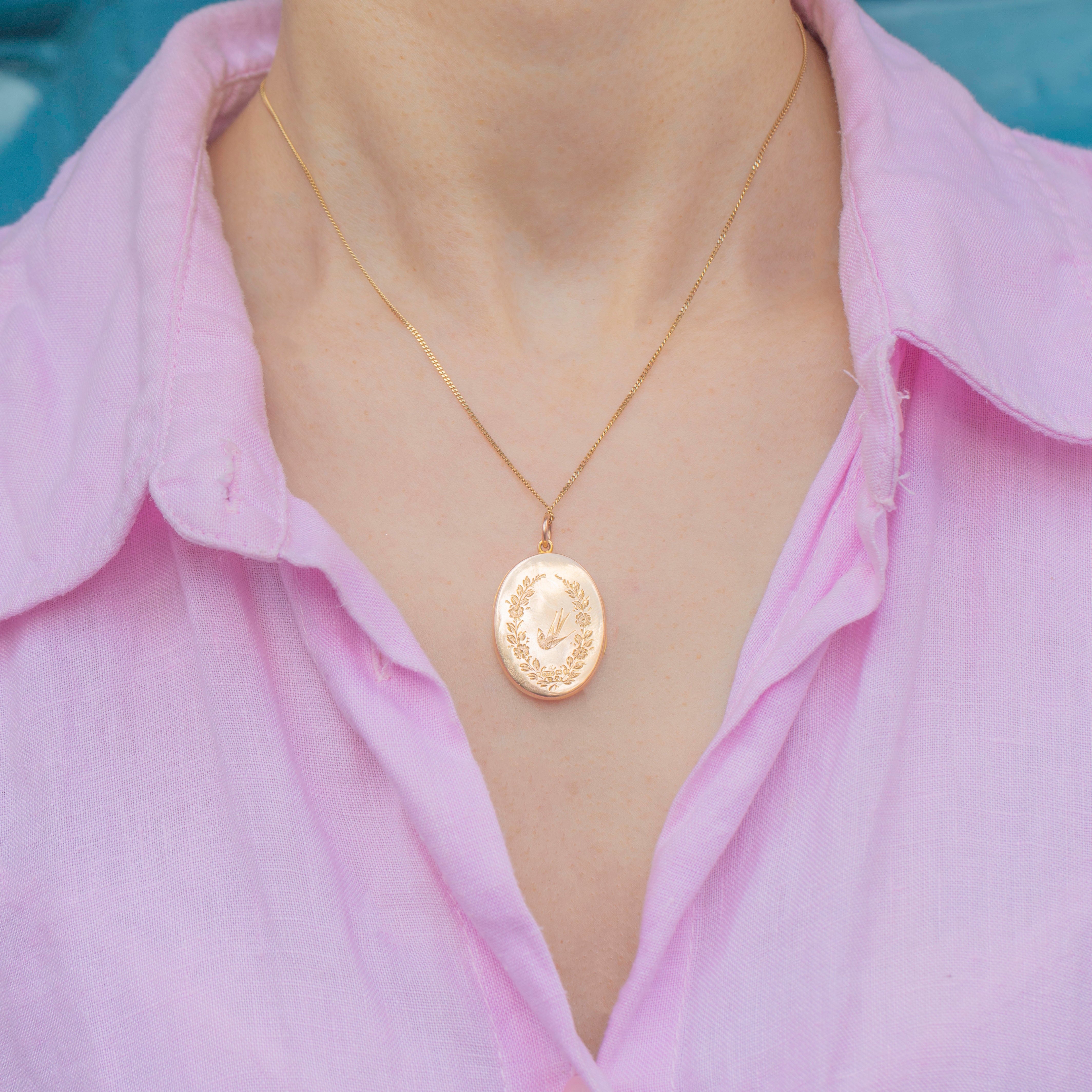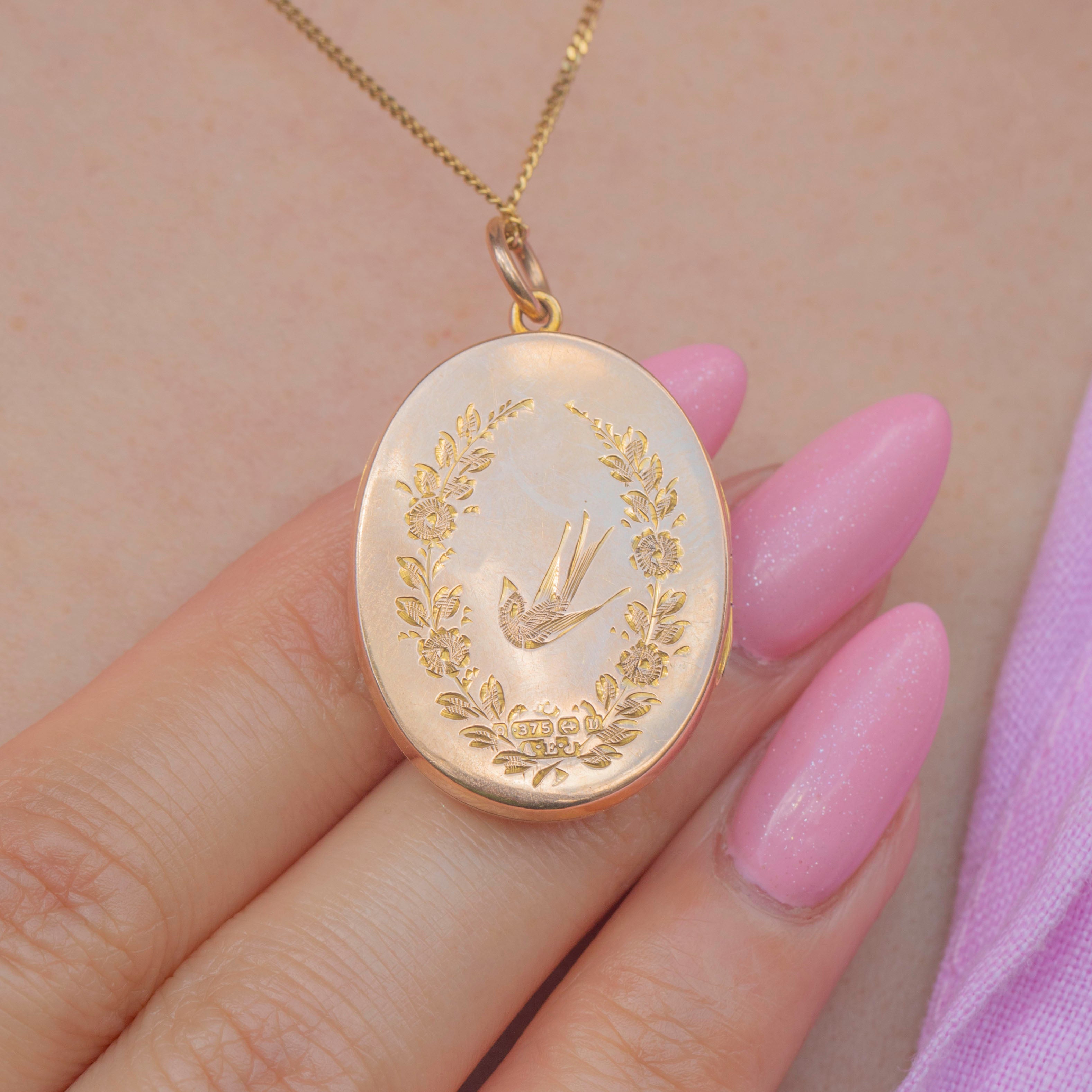 Swallow motifs were often depicted in jewellery during the 19th and early 20th centuries, symbolising love and protection. The inside of the locket can hold two treasured photos within its frames, allowing its recipient to keep loved ones close to them at all times!