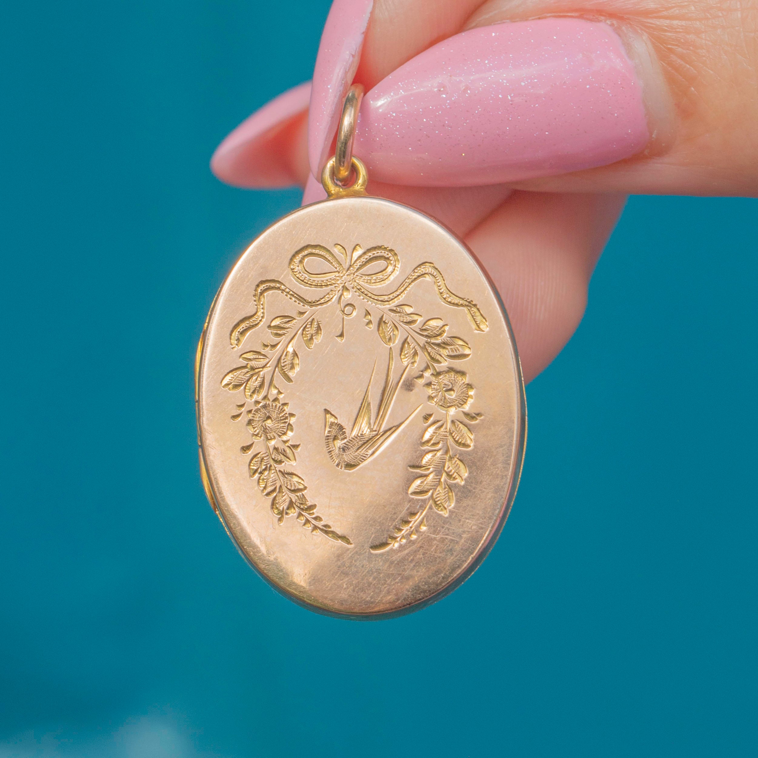 Solid 9ct Gold Engraved Oval Locket, Swallow & Ribbon Motif