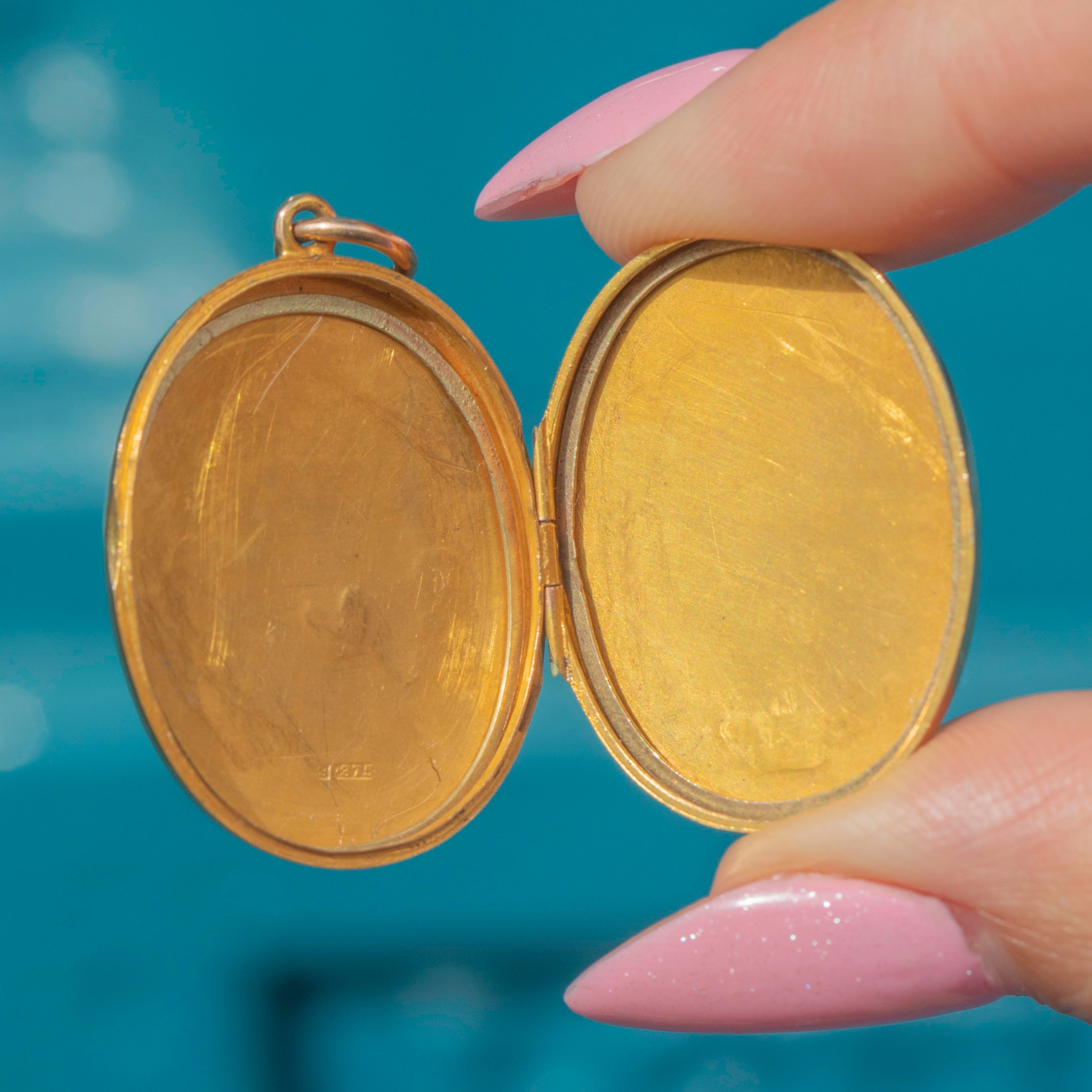 VERY GOOD: This solid 9ct Gold engraved oval locket is in very good condition. The locket has a soft, rosy tone and is beautifully engraved on both its front and back. The locket has two frames on the inside to keep your photos safe and closes with a click. This is a versatile piece that can be worn on a daily basis.