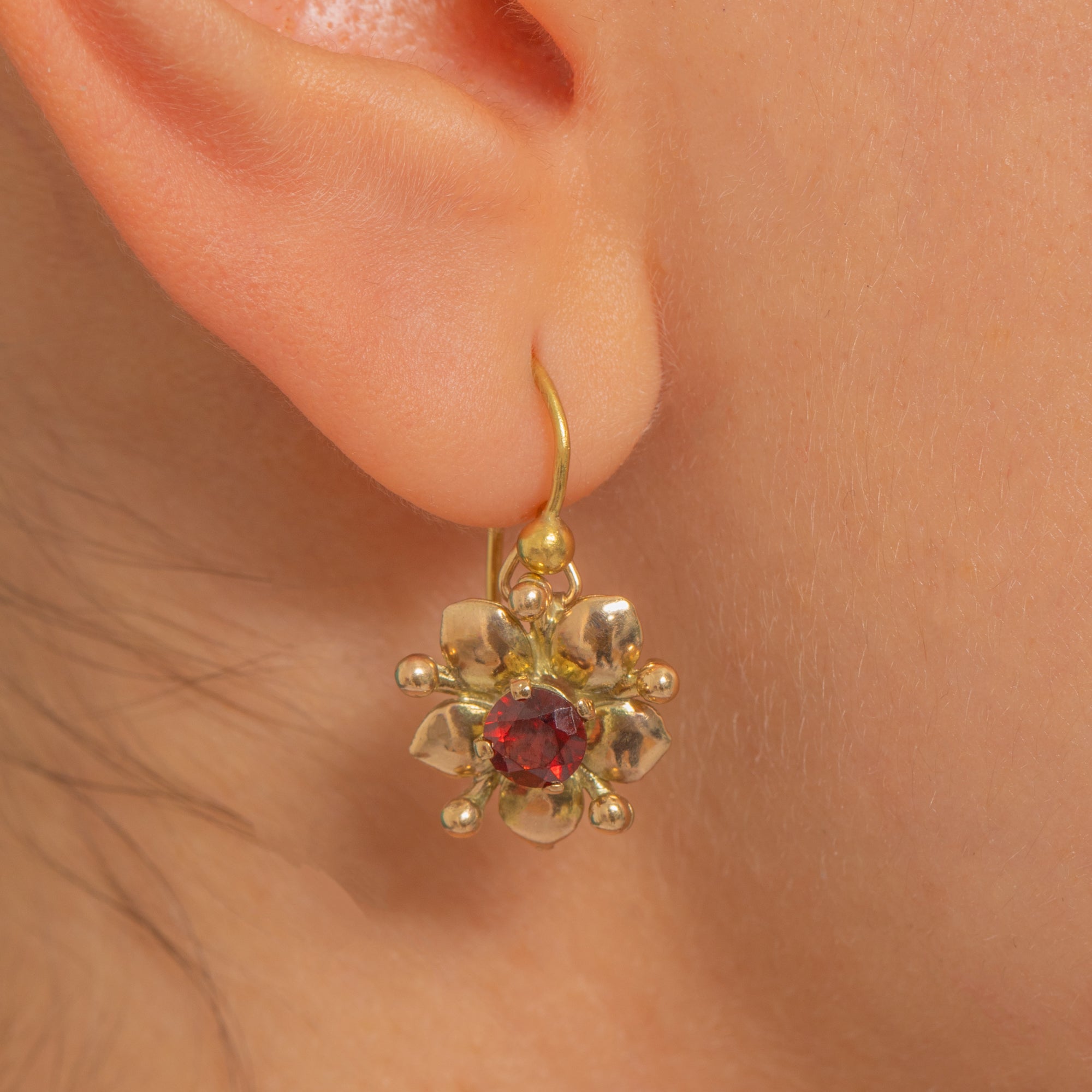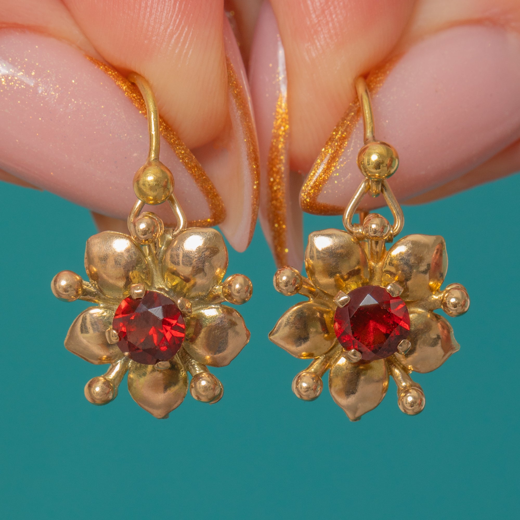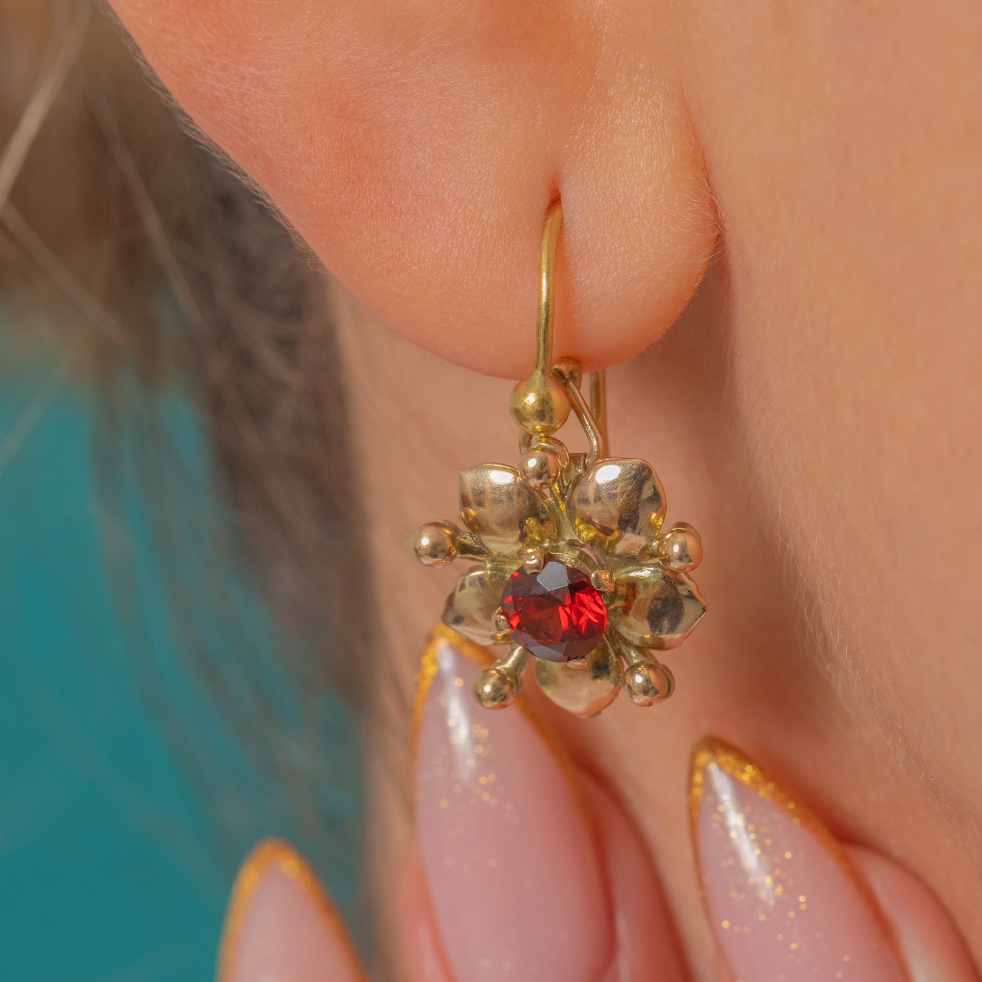 These charming Mid-Century earrings are crafted in solid 9ct Gold and set with richly saturated Garnets arranged in a floral design.