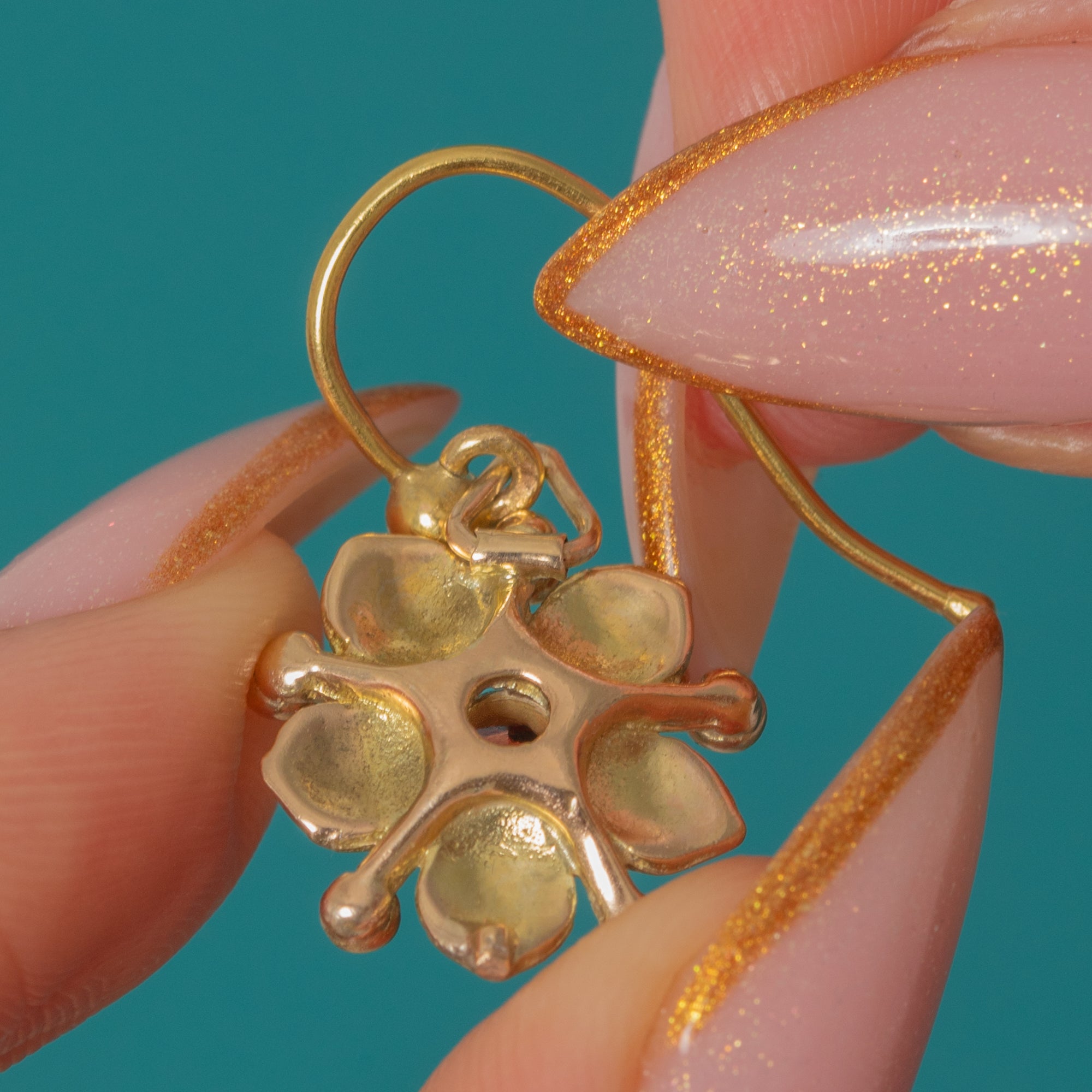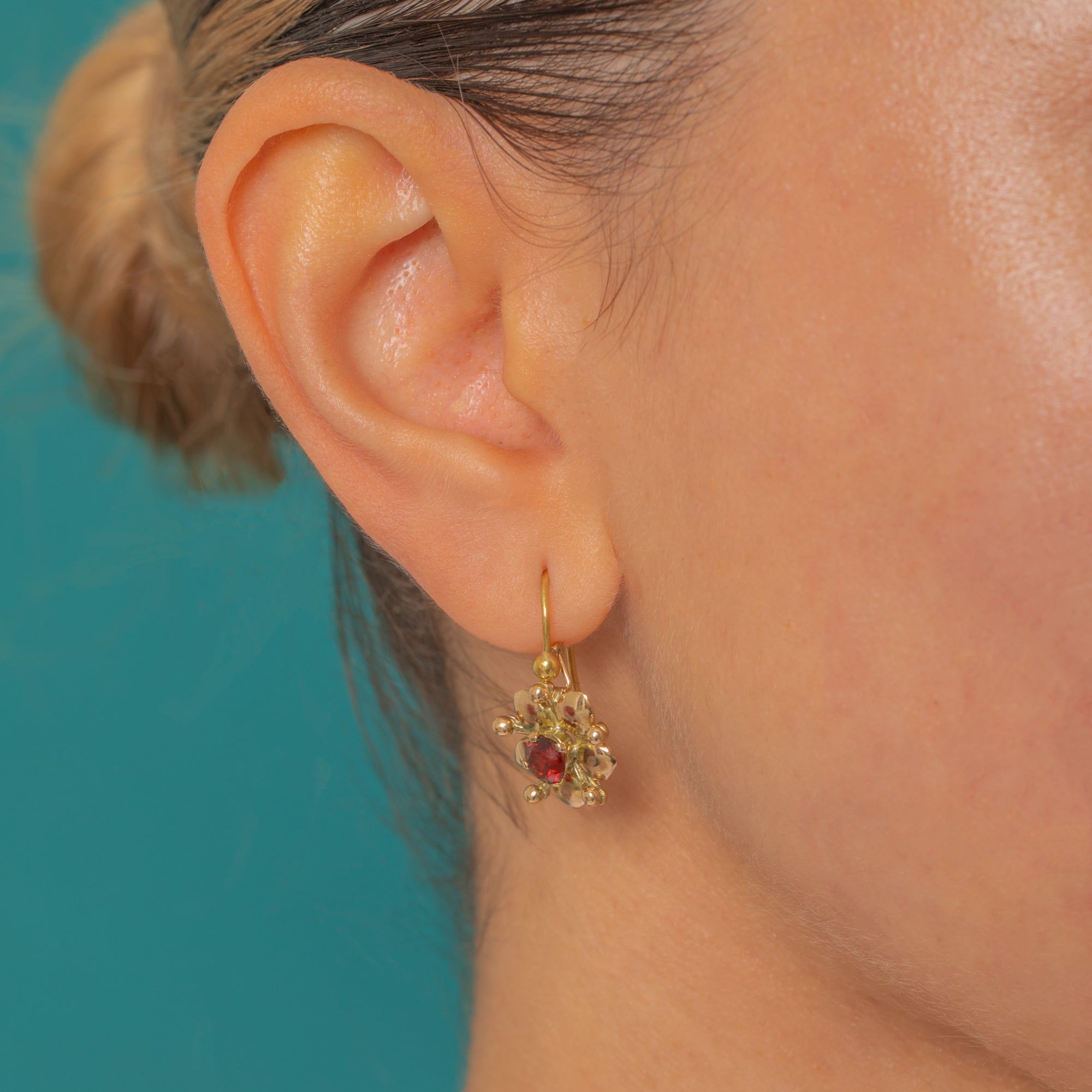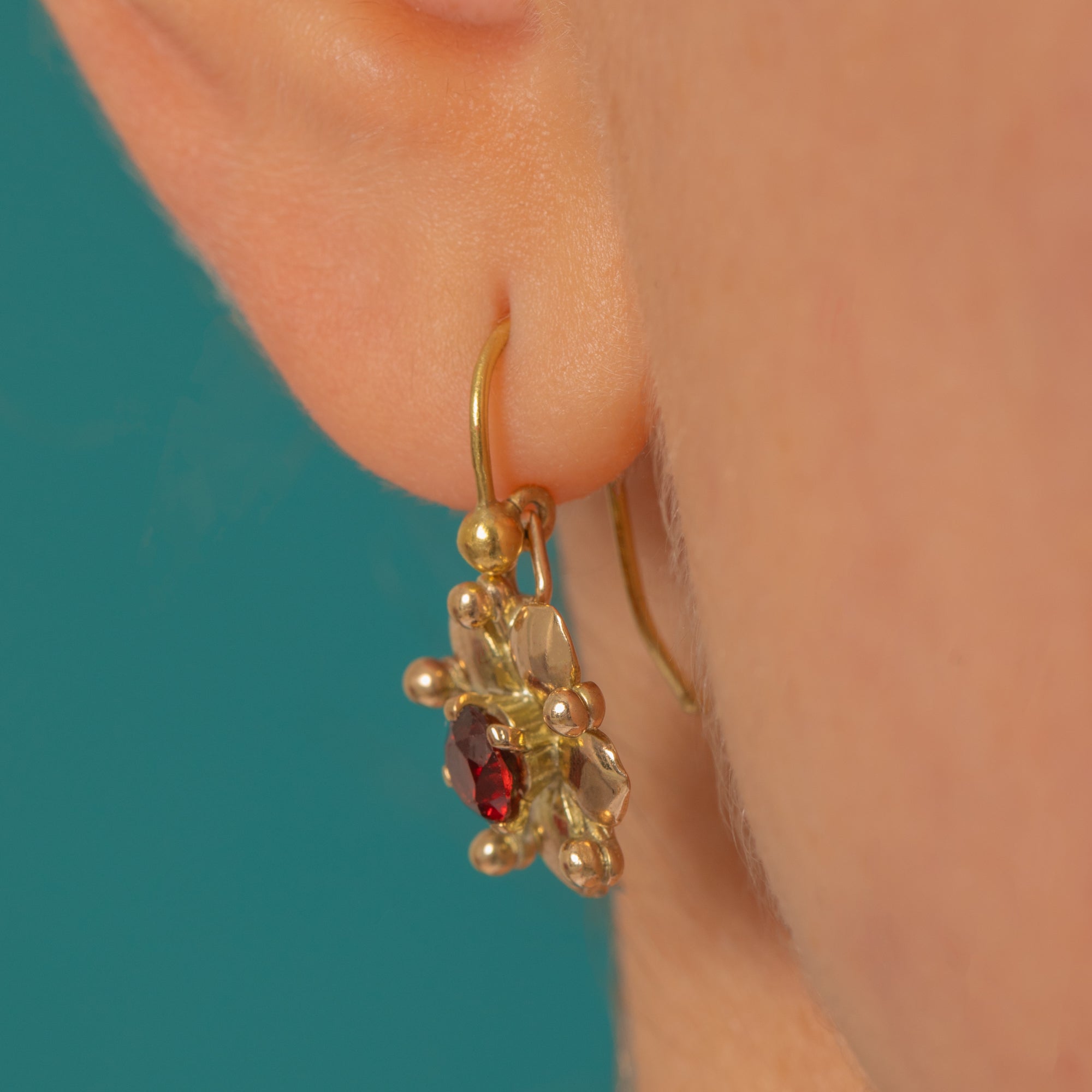 These charming Mid-Century earrings are crafted in solid 9ct Gold and set with richly saturated Garnets arranged in a floral design.