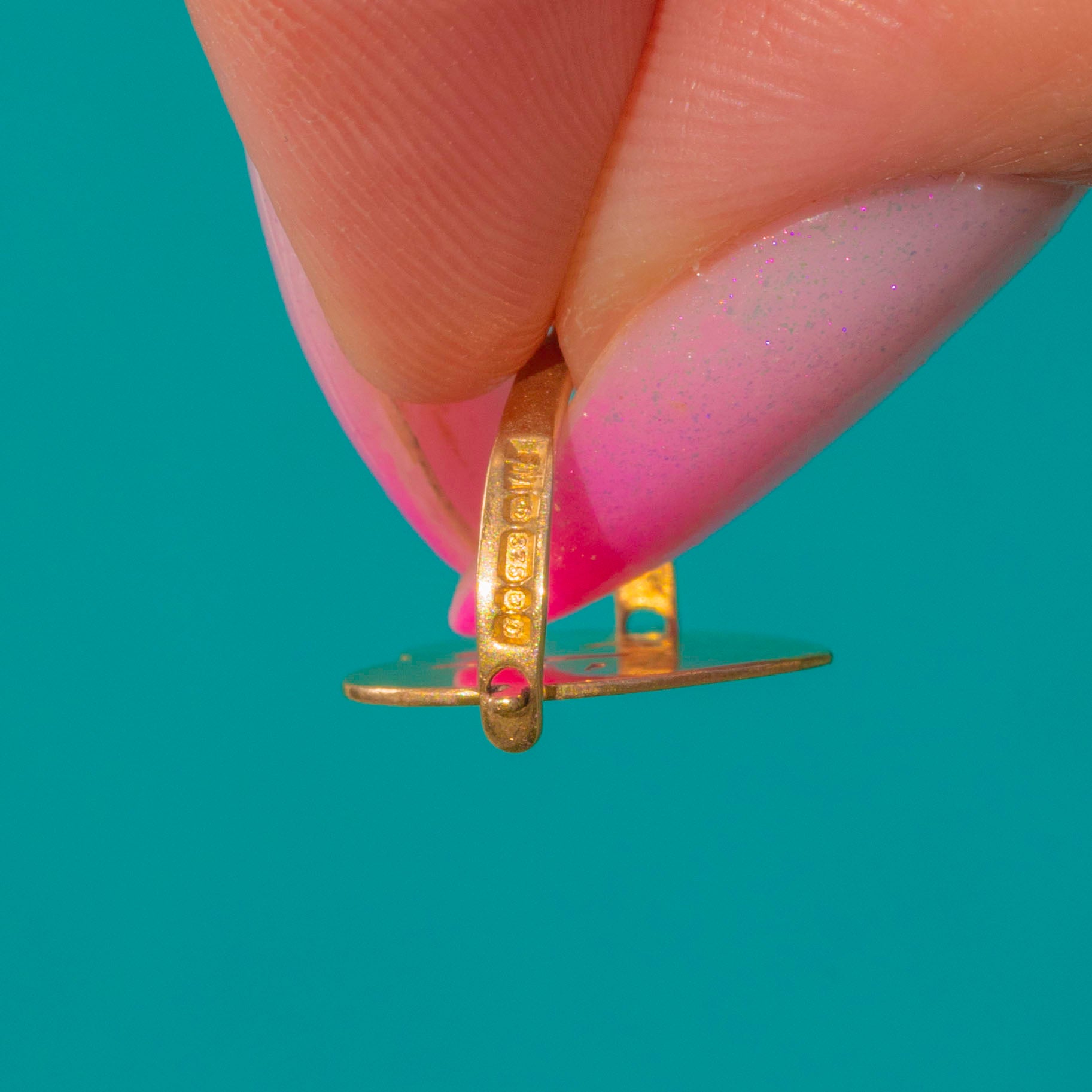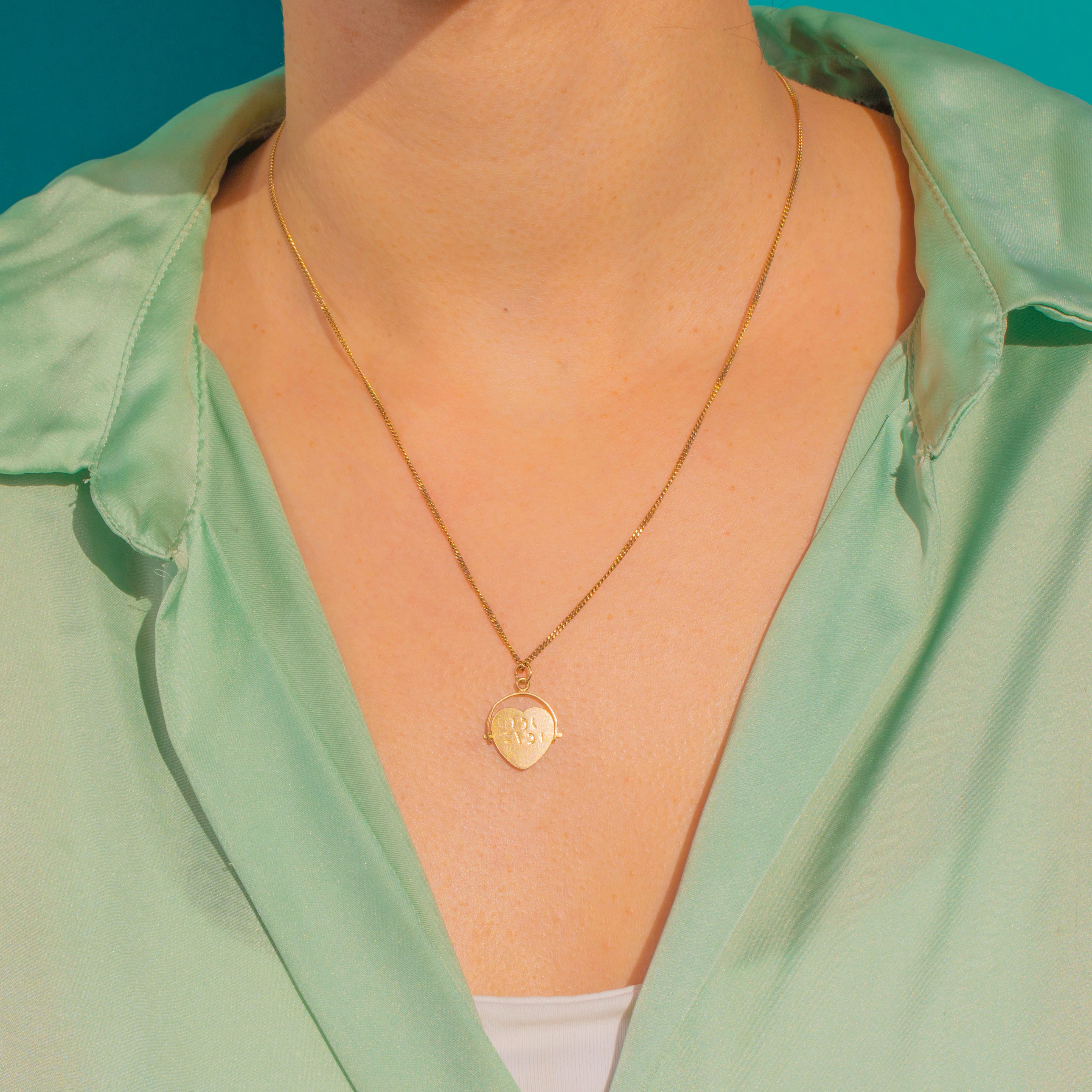 Slim, sweet and brimming with sentiment, this solid 9ct Gold spinner pendant declares “I LOVE YOU” in classic Mid-Century style. The heart pivots within its fine circular frame, giving a gentle tactile twirl and a warm golden glow with every movement.