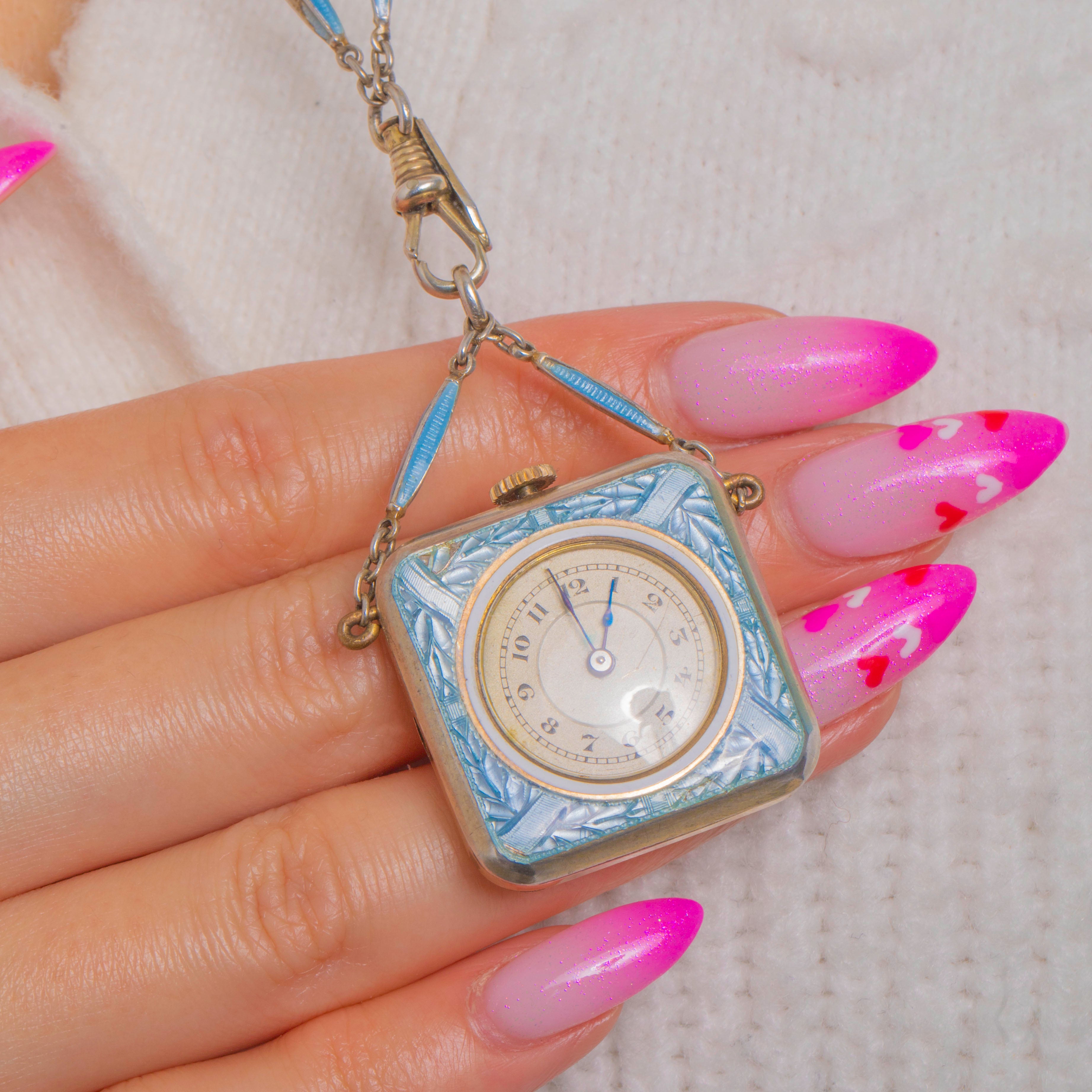 氷のように澄んだ青色のギヨシェ七宝が幻想的に輝くEdwardian期の懐中時計ペンダント。揃いの22インチ七宝細工チェーンと組み合わせてお楽しみいただけます。小ぶりな四角形のケースは、優美な青焼き鋼針を配した円形のクリーム色文字盤を囲み、意匠化されたリボンと草葉模様の角飾りが、透き通る七宝の下に施された機械彫りの地模様の上で舞うようにあしらわれています。裏面には流麗な筆記体で「LNK」と刻まれ、個性豊かな趣を添えています。