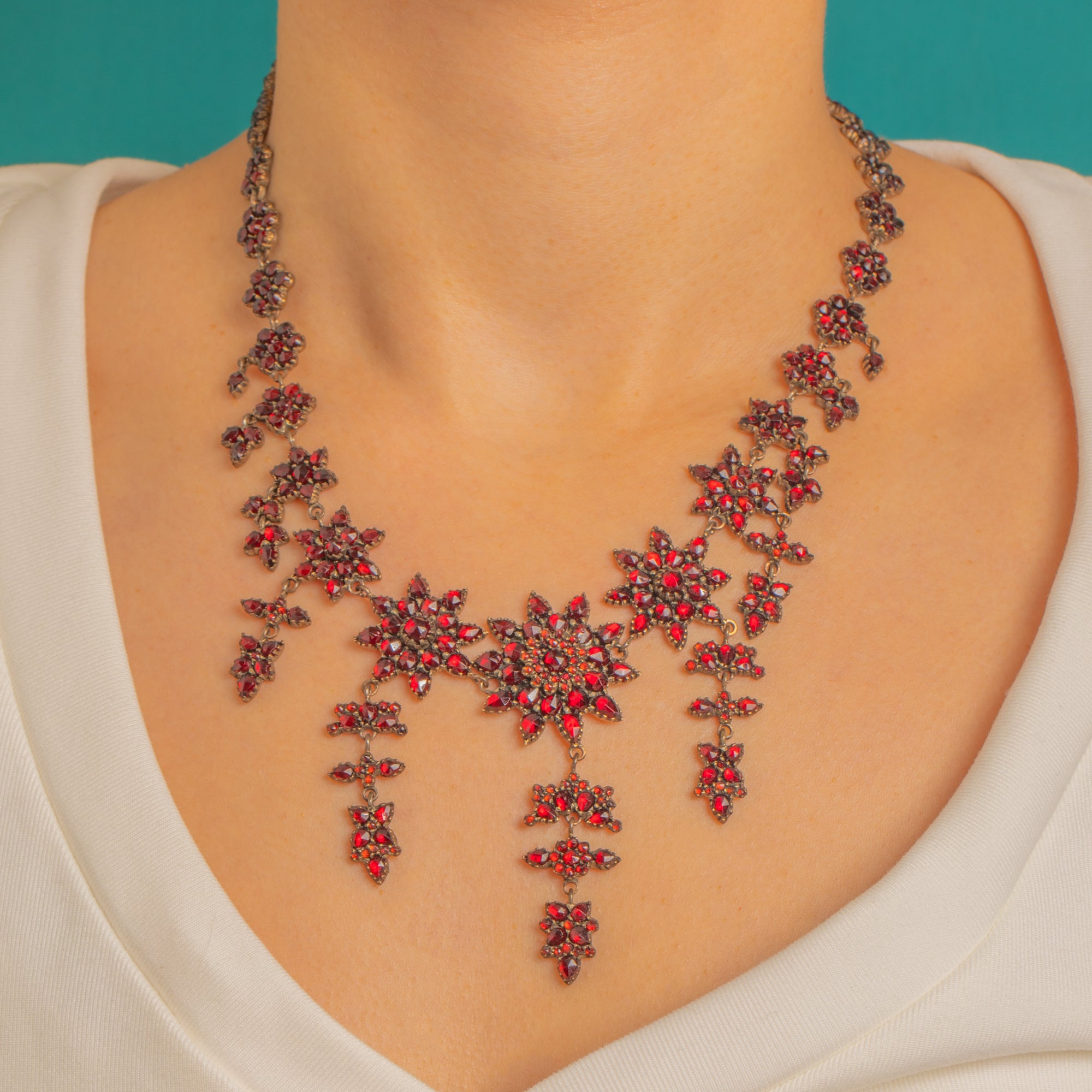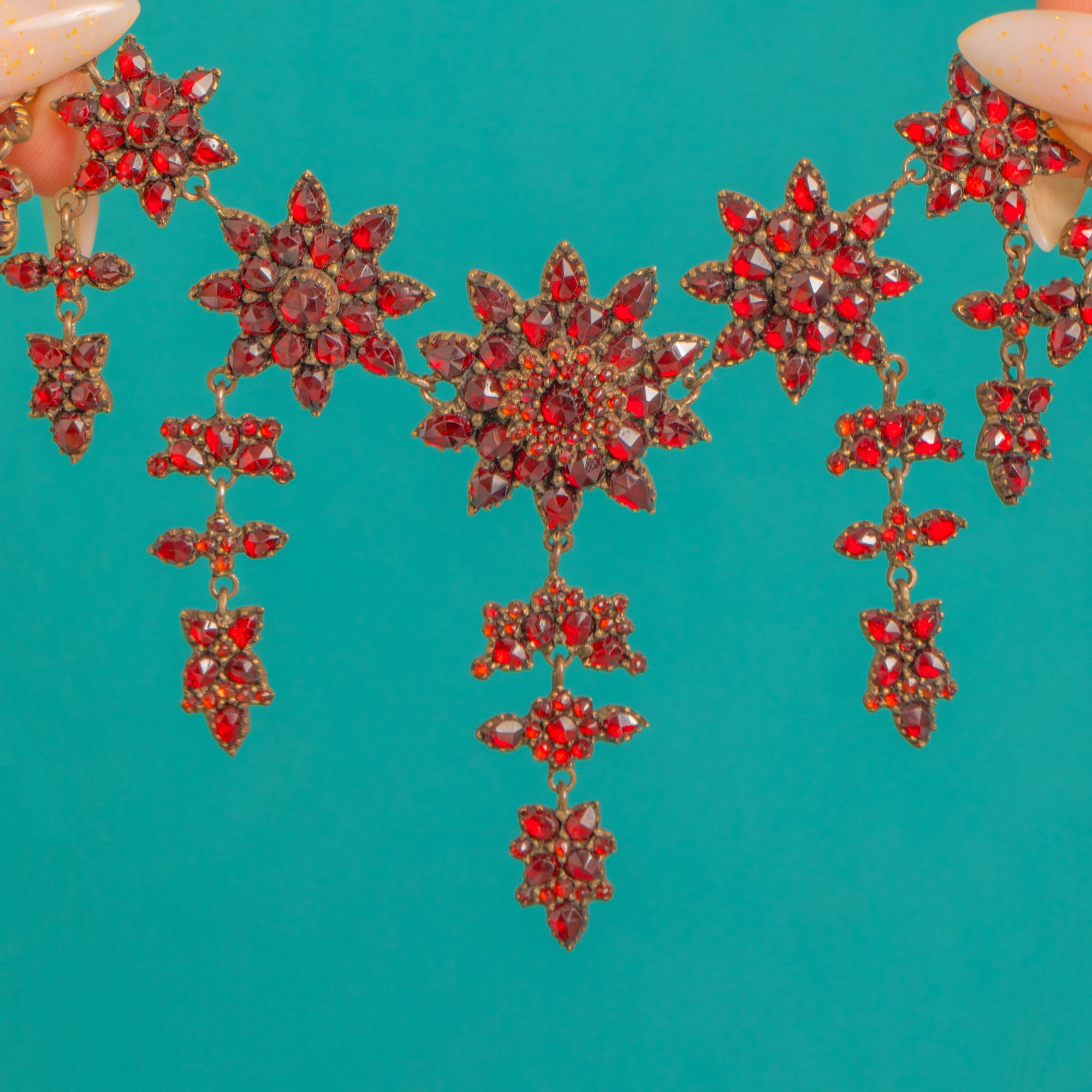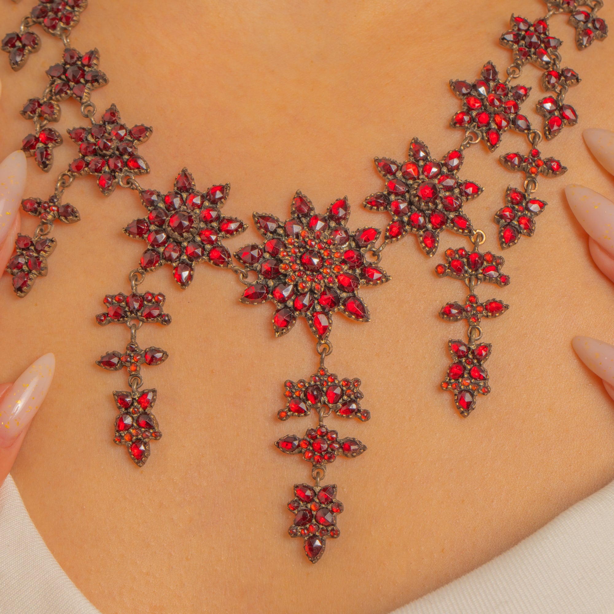 壮麗なVictorian期のボヘミア産ガーネットによる星のネックレス。星型やロゼットのクラスターが首元にしなやかに連なり、まるで星座のような輝きを放ちます。密に敷き詰められたガーネットのセッティングは、中央で三連の優美なドロップへと流れ、装飾性豊かなカラー/プリンセス丈のシルエットを描き、劇的なVictorianの魅力を湛えています。