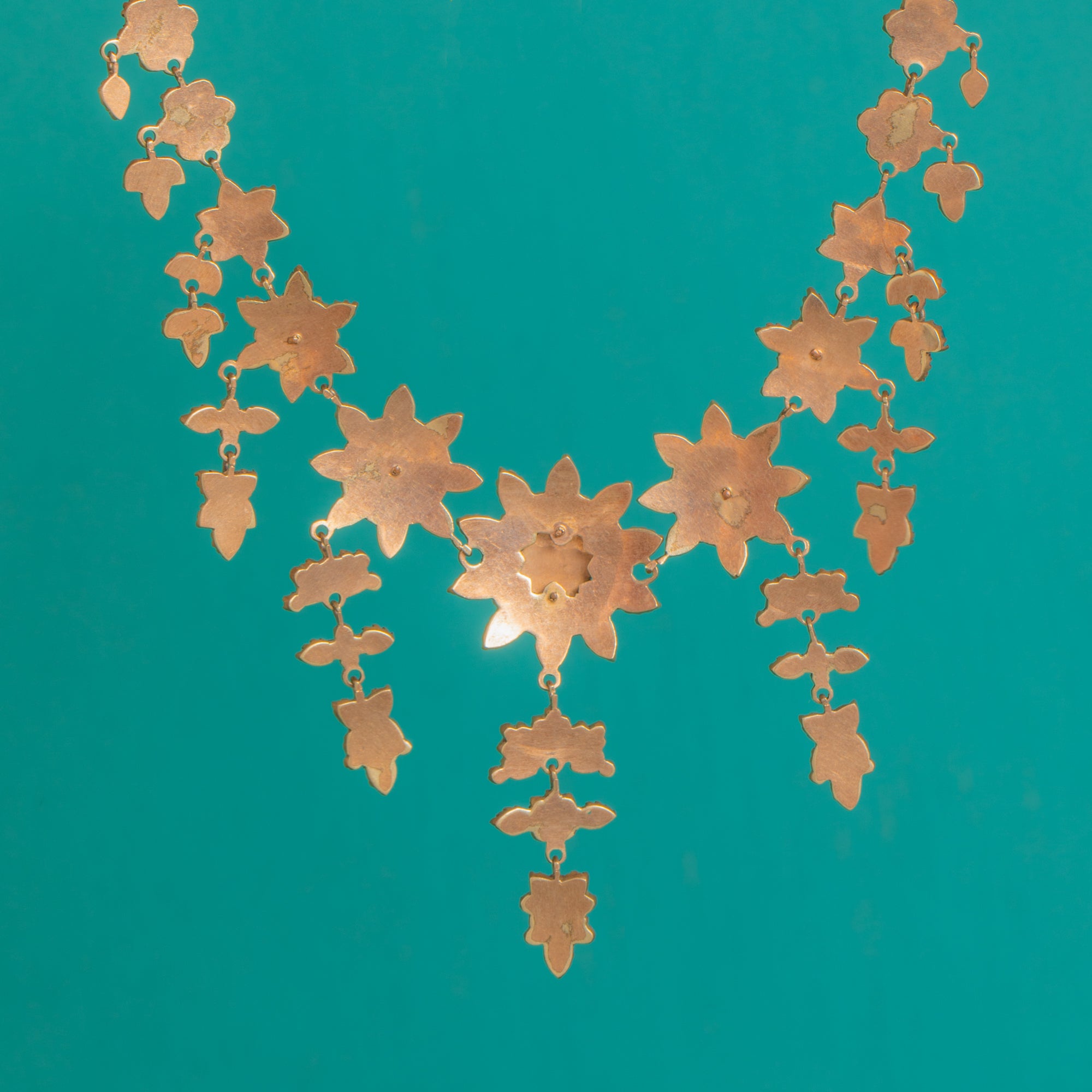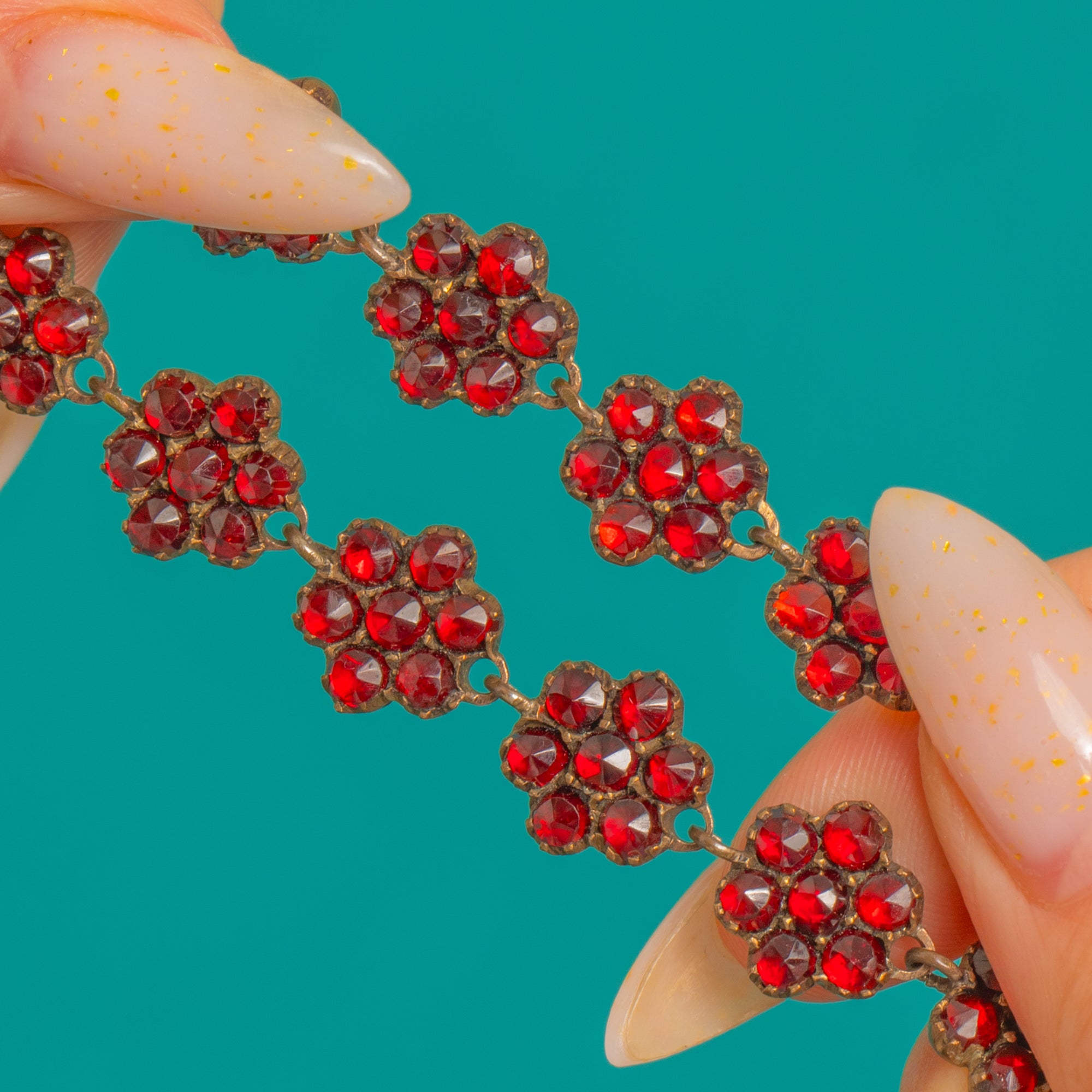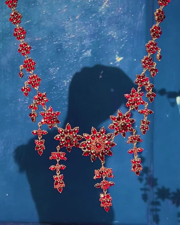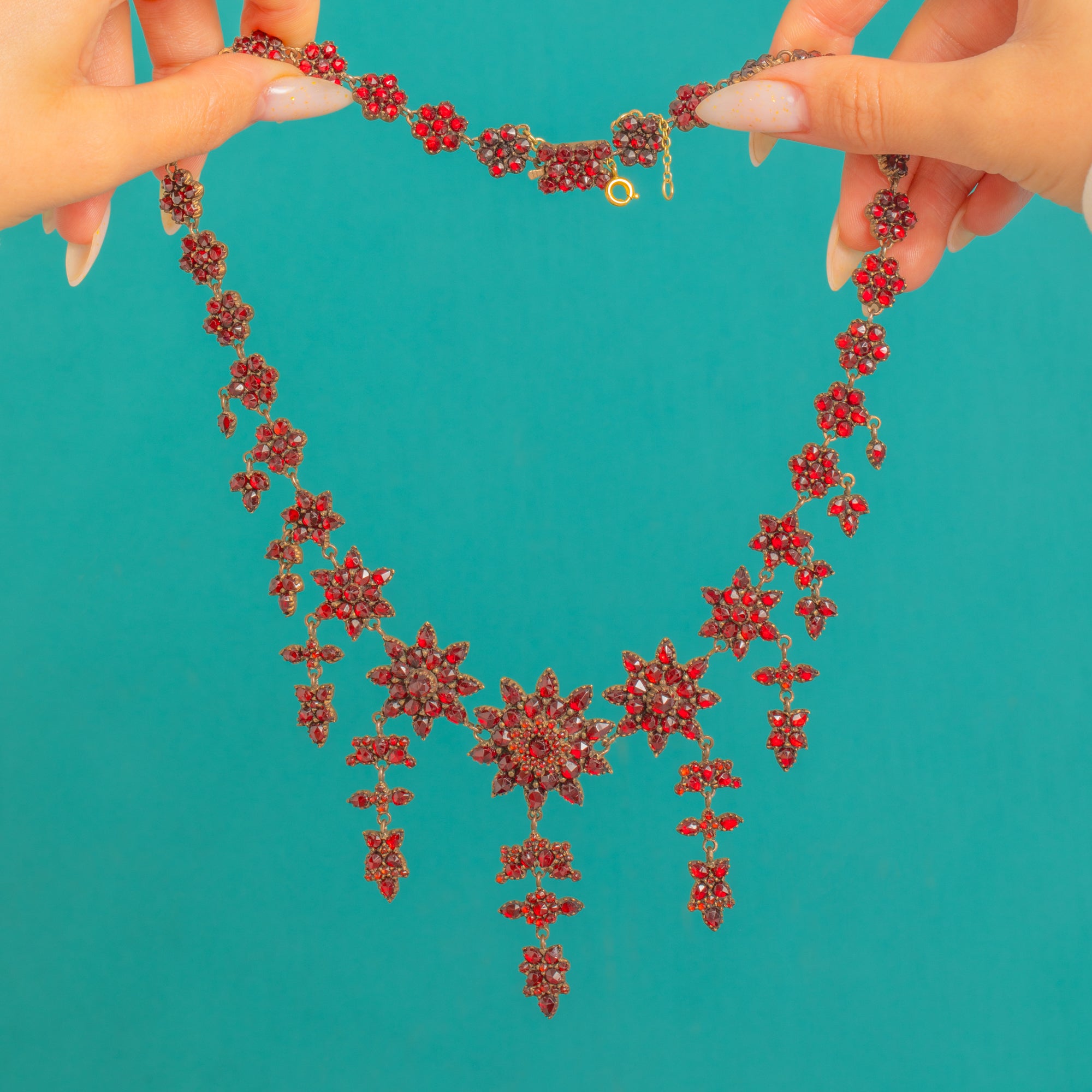 壮麗なVictorian期のボヘミア産ガーネットによる星のネックレス。星型やロゼットのクラスターが首元にしなやかに連なり、まるで星座のような輝きを放ちます。密に敷き詰められたガーネットのセッティングは、中央で三連の優美なドロップへと流れ、装飾性豊かなカラー/プリンセス丈のシルエットを描き、劇的なVictorianの魅力を湛えています。