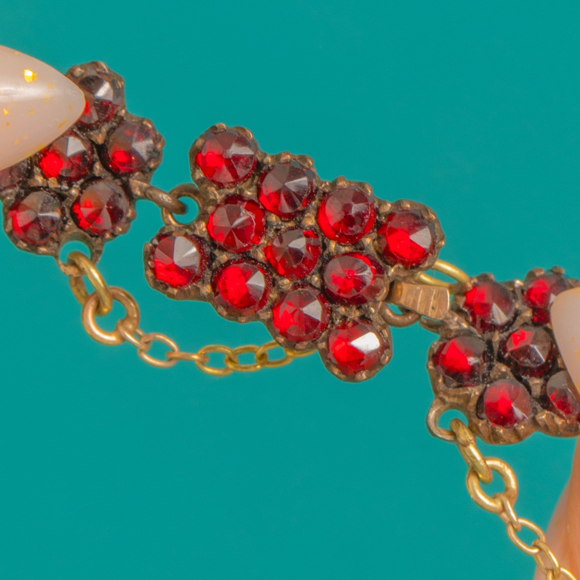 セッティングは裏張りで、19世紀後期のボヘミア産ガーネット作品に典型的な仕様です。金属はガーネットゴールドと判定されており、9カラットゴールドのセーフティチェーンが付属し、安心してお使いいただけます。時を重ねた古色が、ファセットカットされたガーネットの深く濃密な赤を一層引き立て、温かみと奥行きをもたらしています。