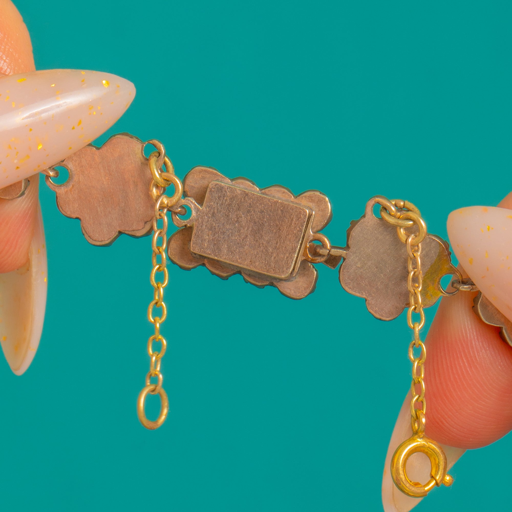 極上:ガーネットは鮮やかで揃いが良く、しっかりと留められています。ごくわずかなファセットの摩耗が拡大検査で見られるのみです。可動式のセッティングは鮮明で健全な状態を保ち、経年に伴う穏やかな表面の摩耗と古色が見受けられます。検品の結果、目立つ欠損や後年の改変は認められませんでした。