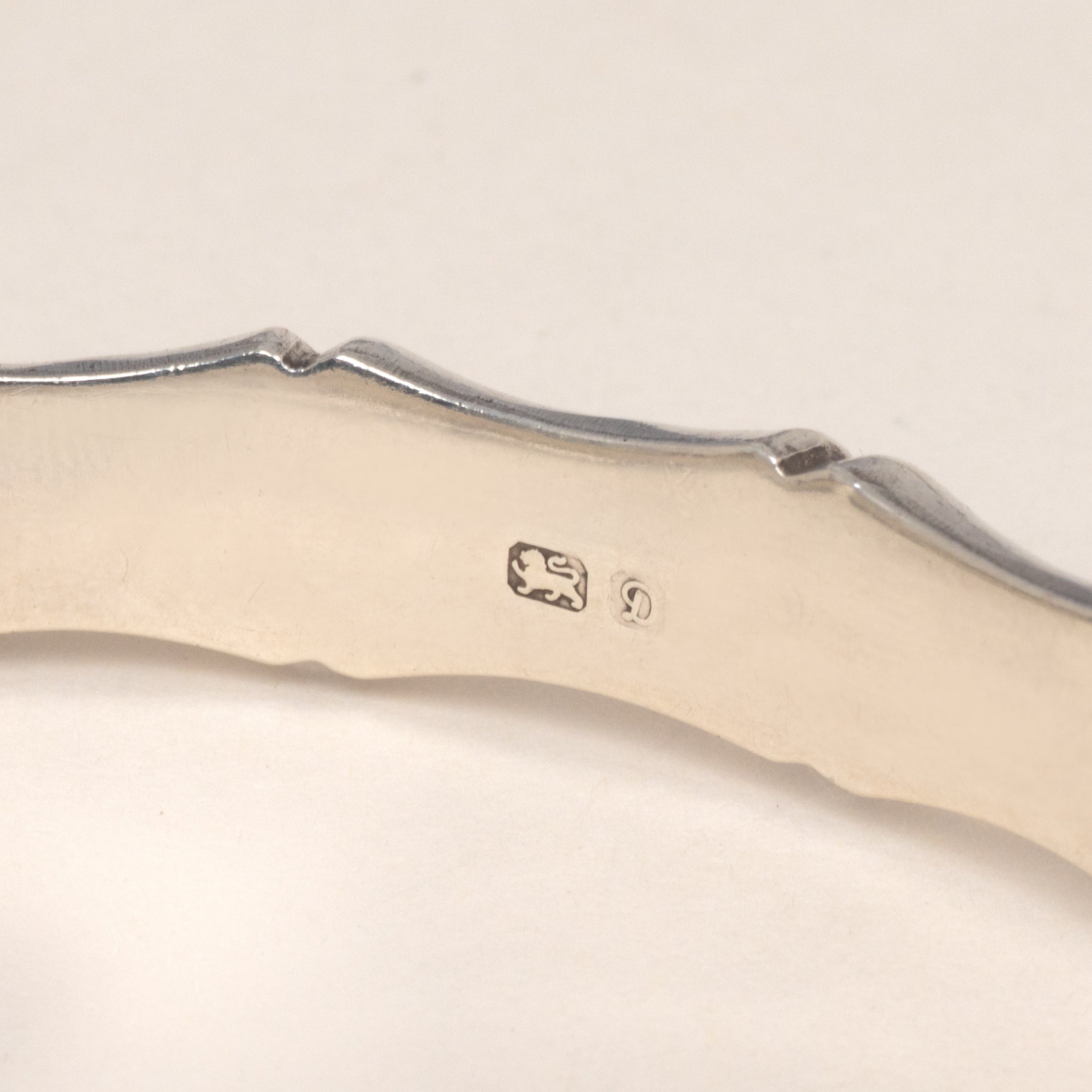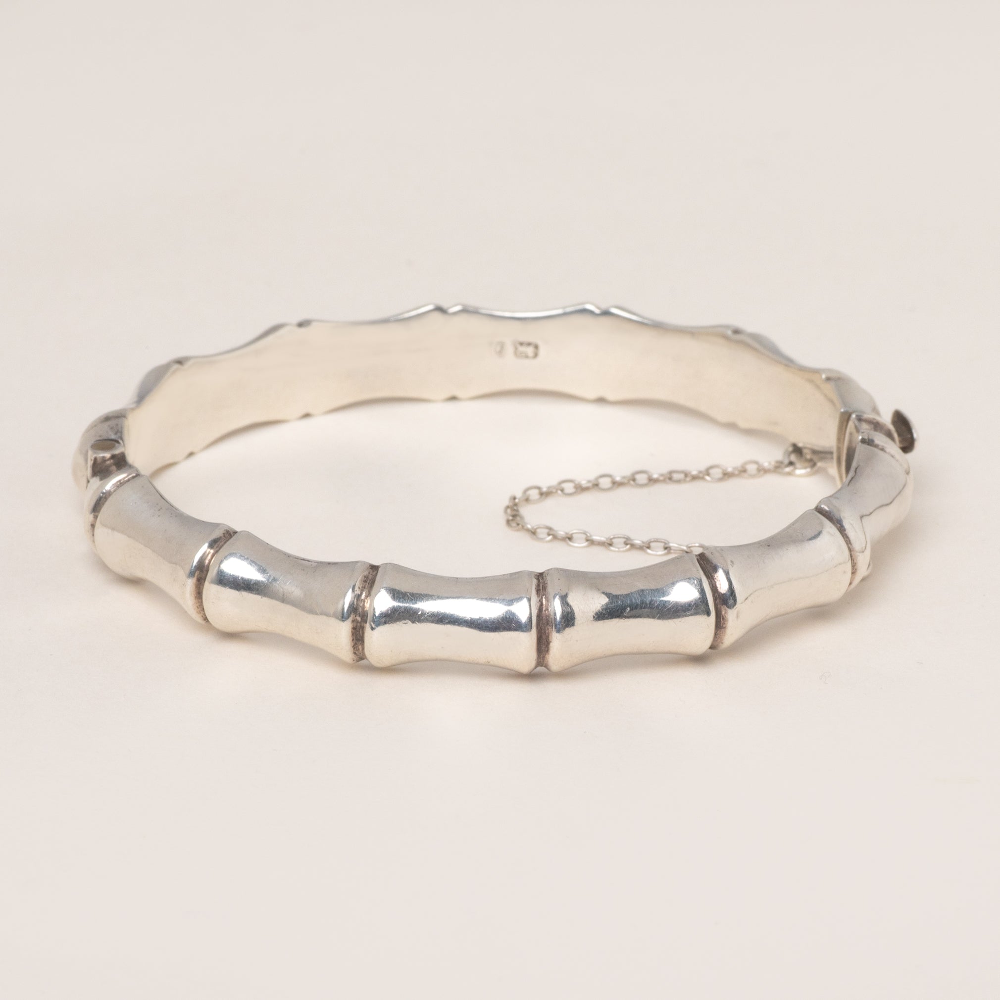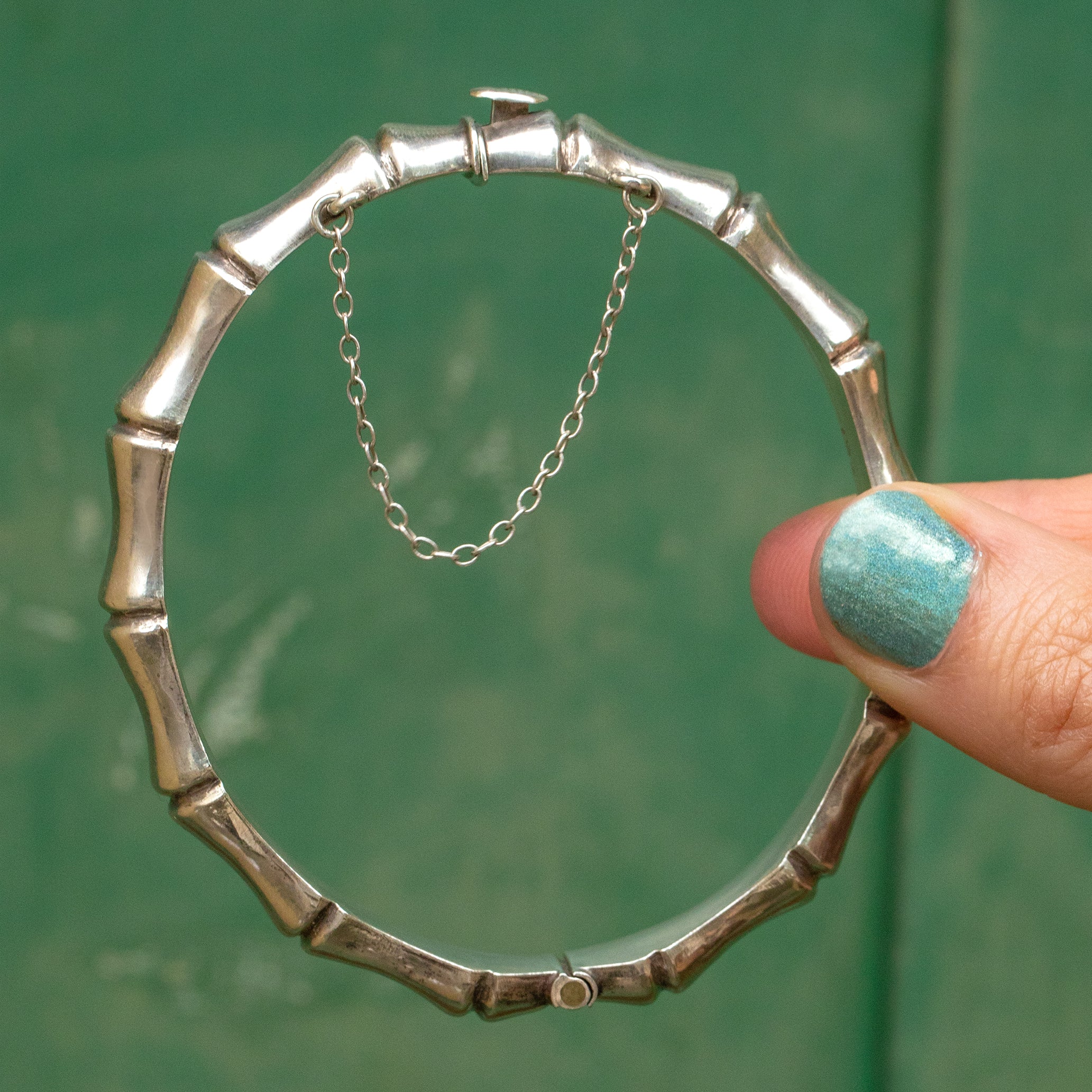 VERY GOOD-EXCELLENT. This Sterling Silver bamboo bangle is in wonderful condition. Aside from a few light dings around her circumference, the Silver is bright and lustrous, and she closes securely with a safety chain for extra peace of mind. The hallmarks are crisp and date this piece to 1978.