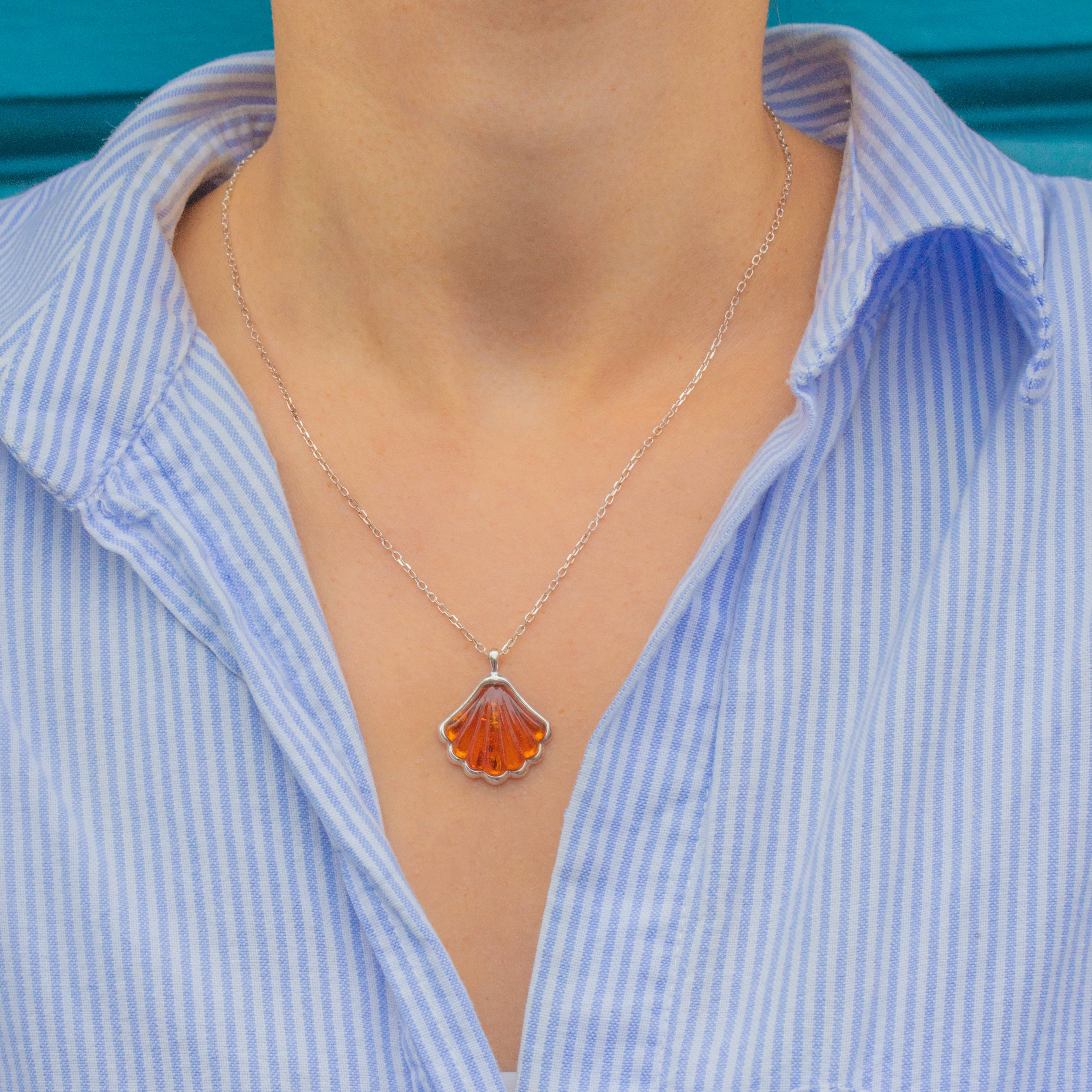 Glowing with warm golden hues, this Contemporary Sterling Silver pendant features a beautifully carved natural Amber shell suspended from a fine Silver trace chain. The craftsmanship highlights the Amber’s natural inclusions and depth of colour, creating a captivating piece inspired by the sea.
