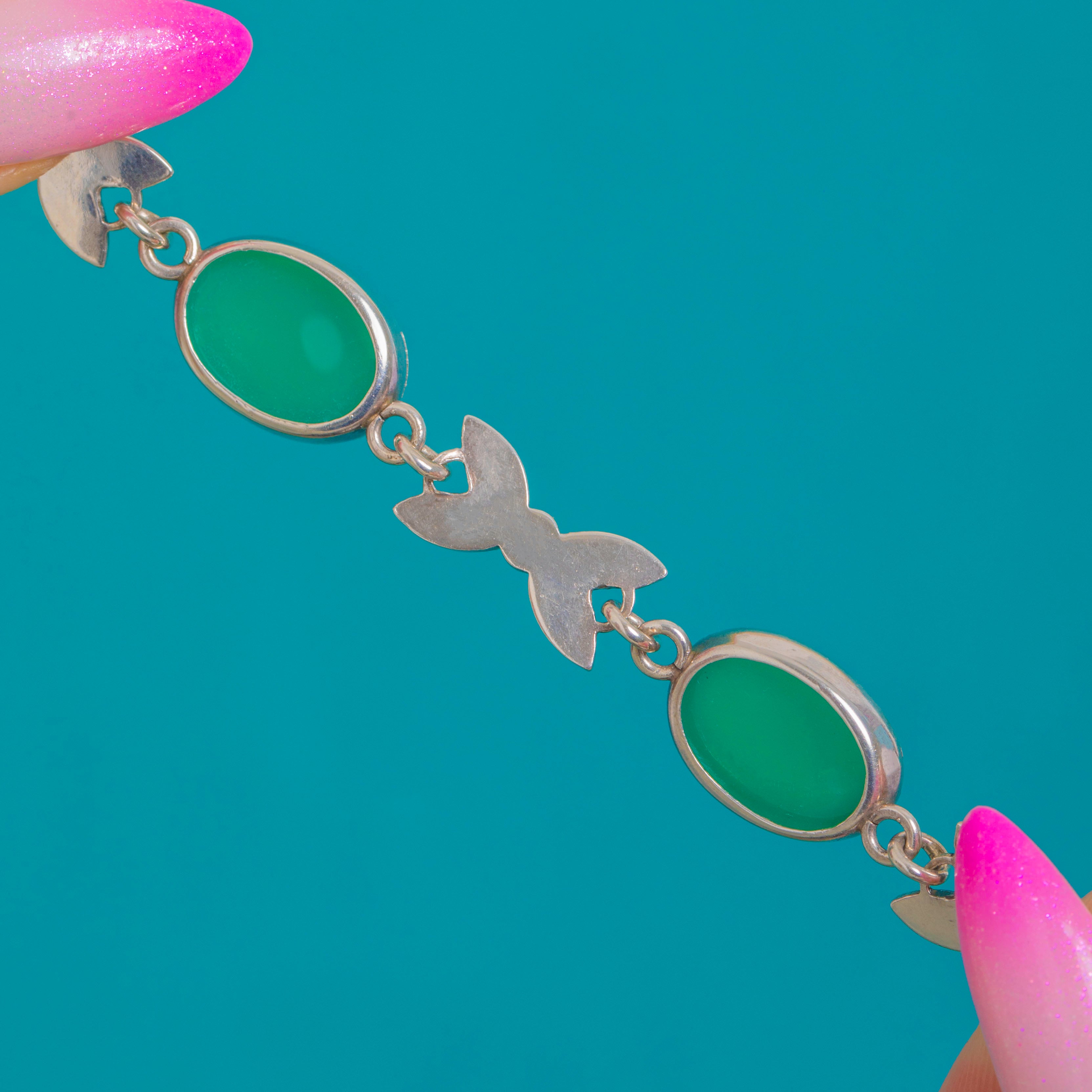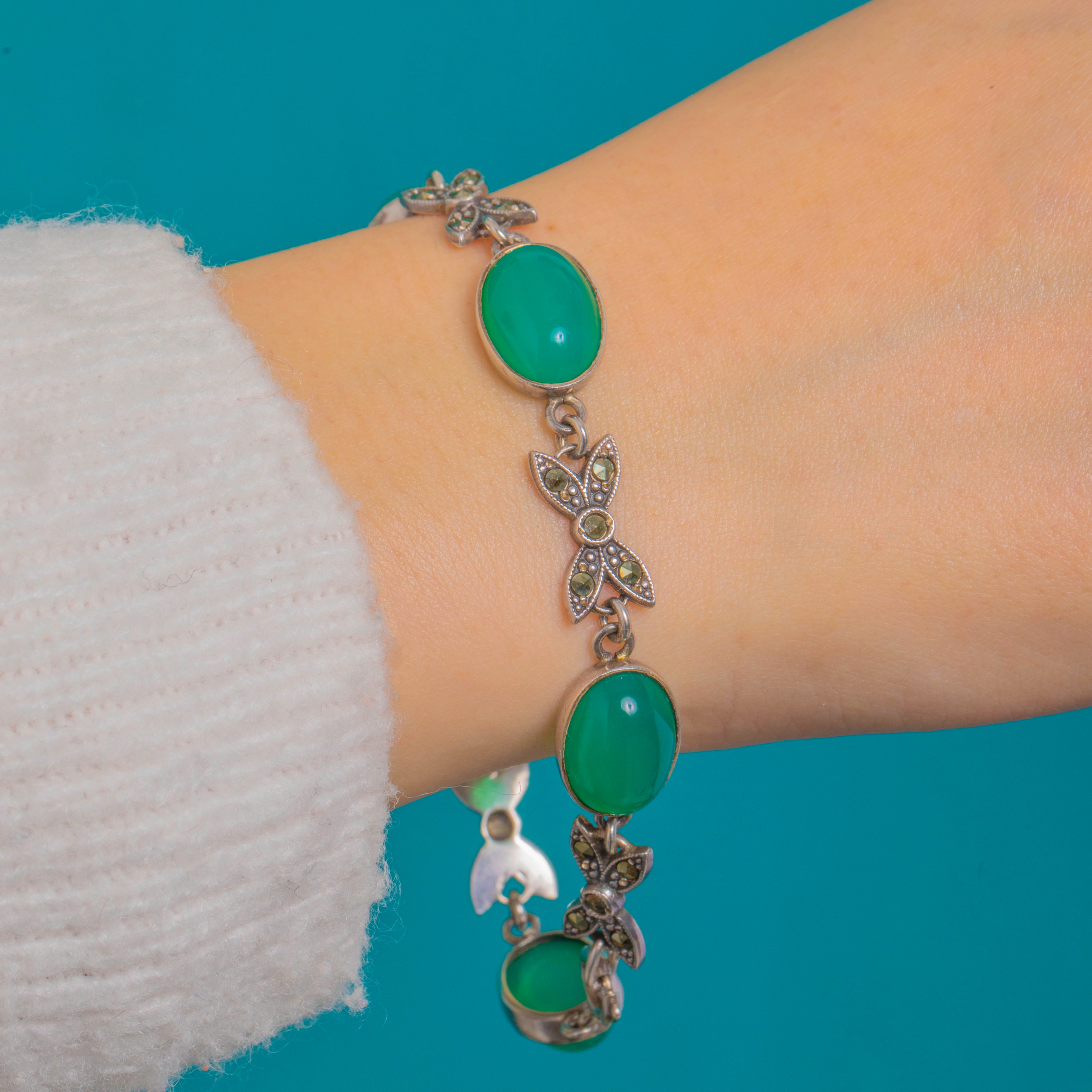 この上品なヴィンテージ純銀製ラインブレスレットは、鮮やかな緑色のクリソプレーズ・カボションと、きらめくマーカサイトを細やかに敷き詰めた可憐な弓形のリンクを組み合わせています。滑らかで丸みを帯びた楕円形のクリソプレーズは、洗練された閉じ込み枠に収められ、繊細なミルグレイン装飾が施された彫刻的な弓形モチーフと交互に連なり、優雅でアール・デコ調のシルエットを描きます。
