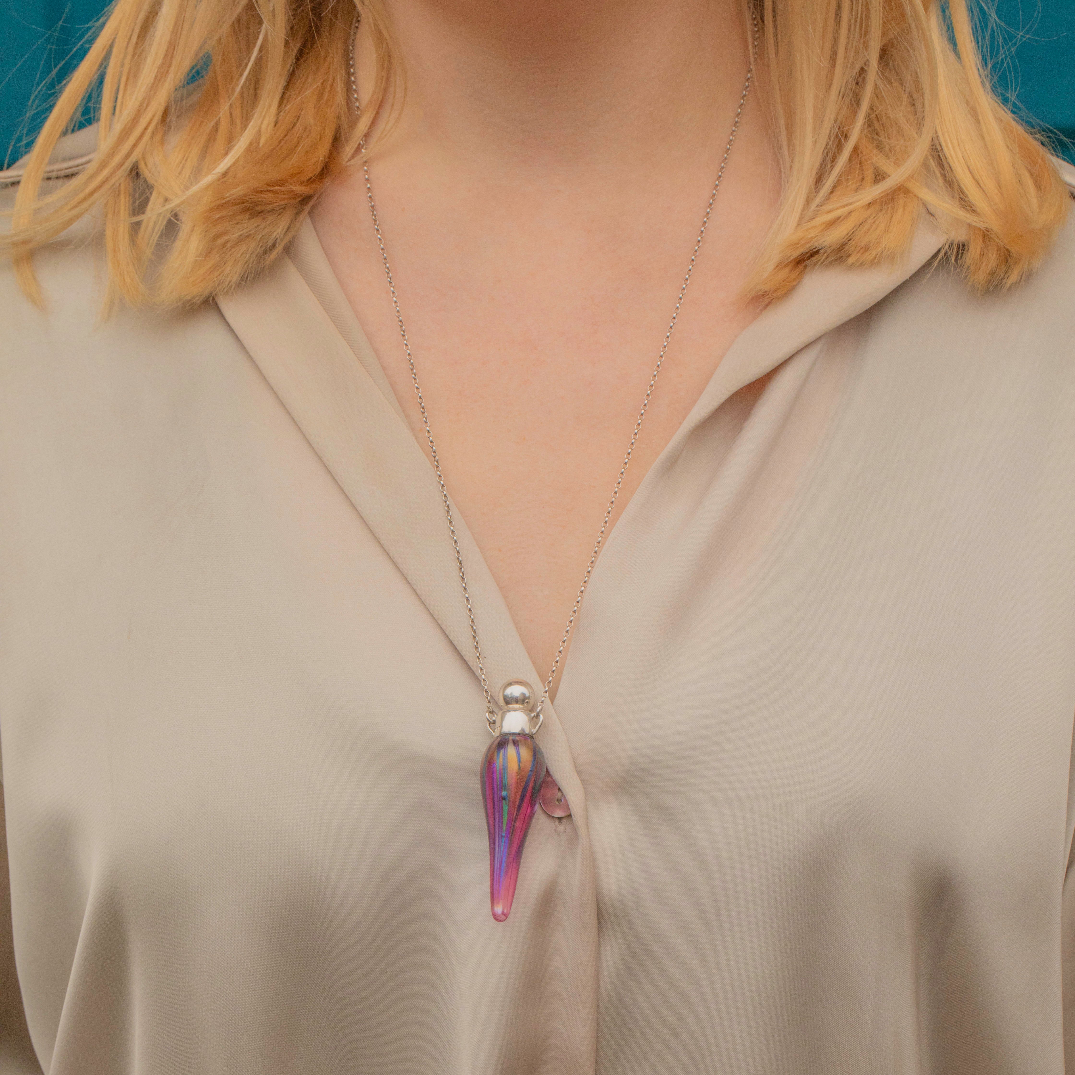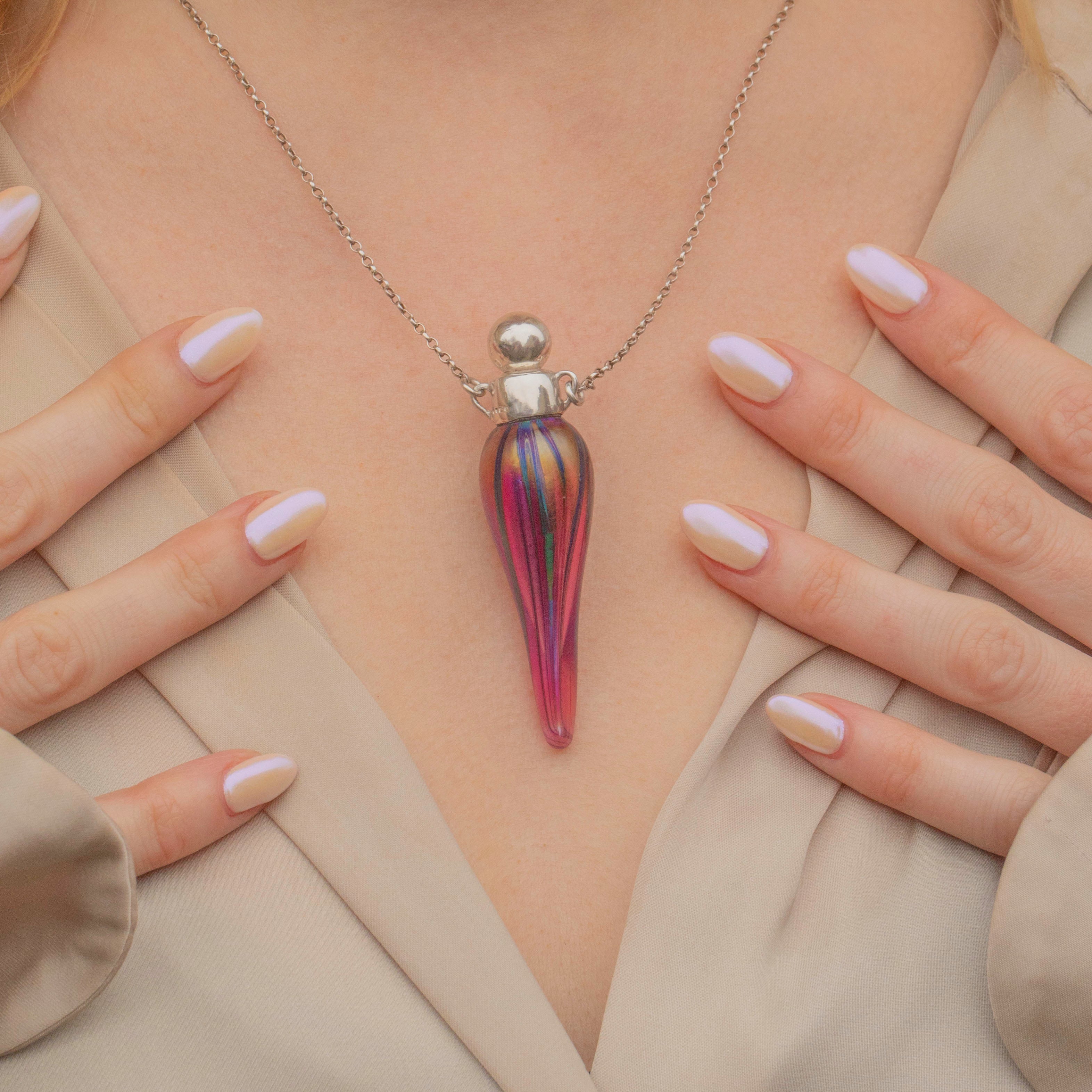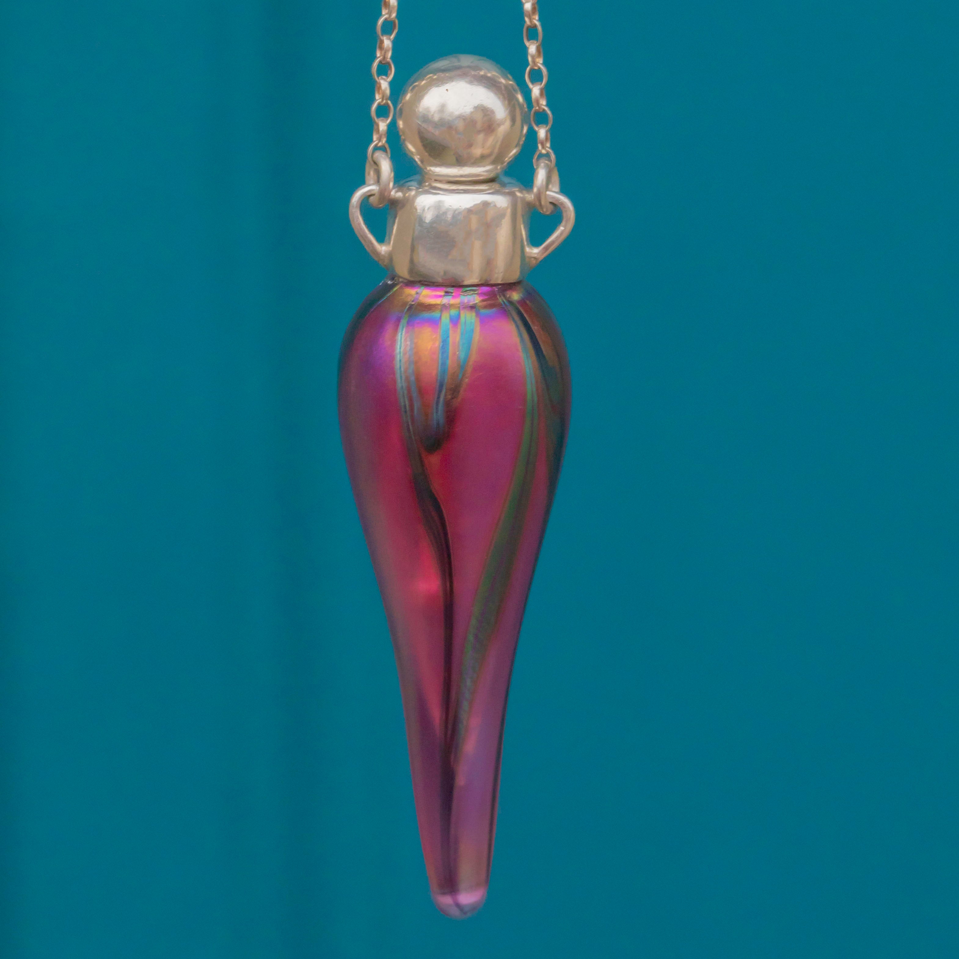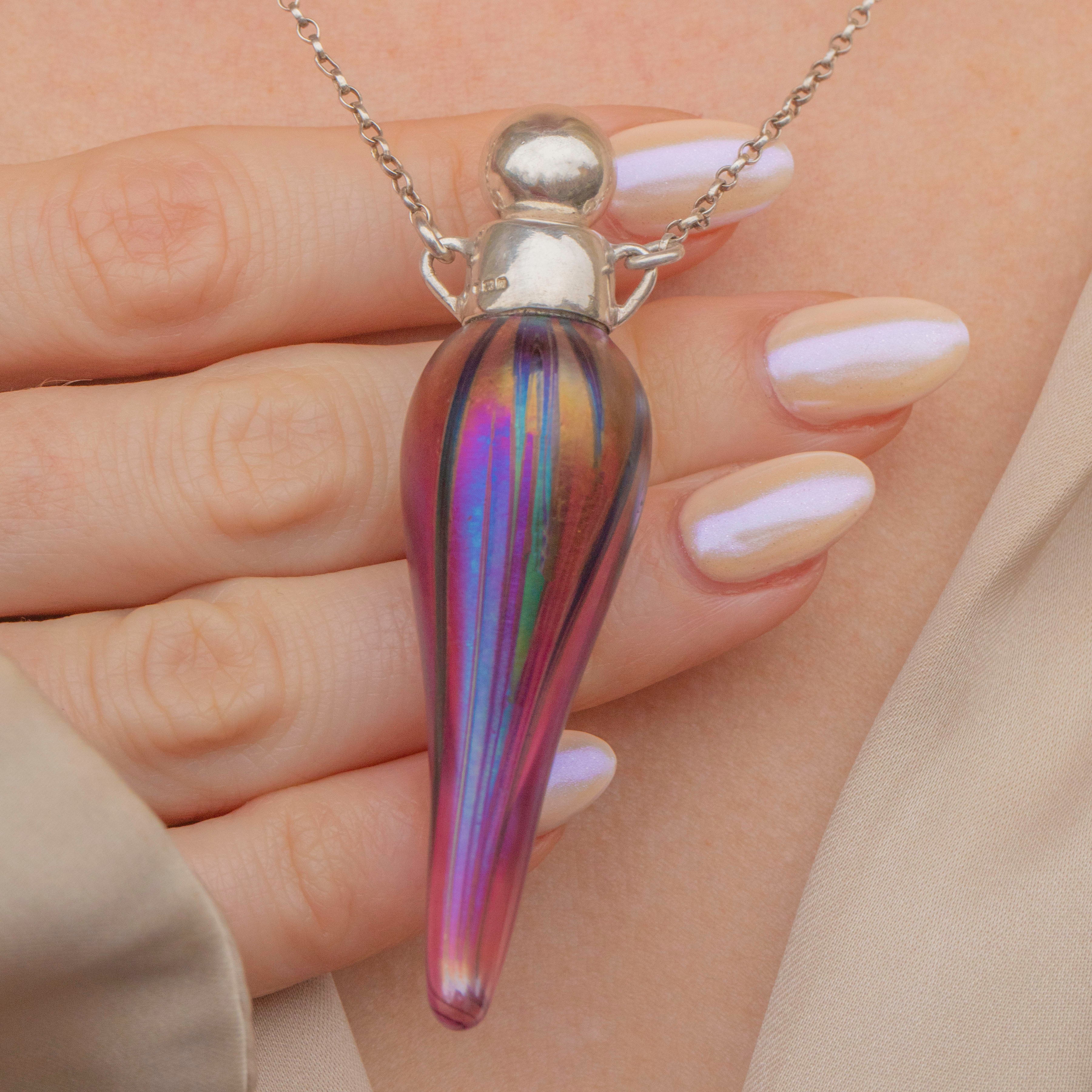 This Sterling Silver Venetian pink Glass perfume bottle necklace is the perfect accessory for those who love to wear unique pieces of vintage jewellery. The 25" chain and bottle top are made from solid Sterling Silver and suspend an exquisitely crafted glass bottle to which you can add your favourite scent!
