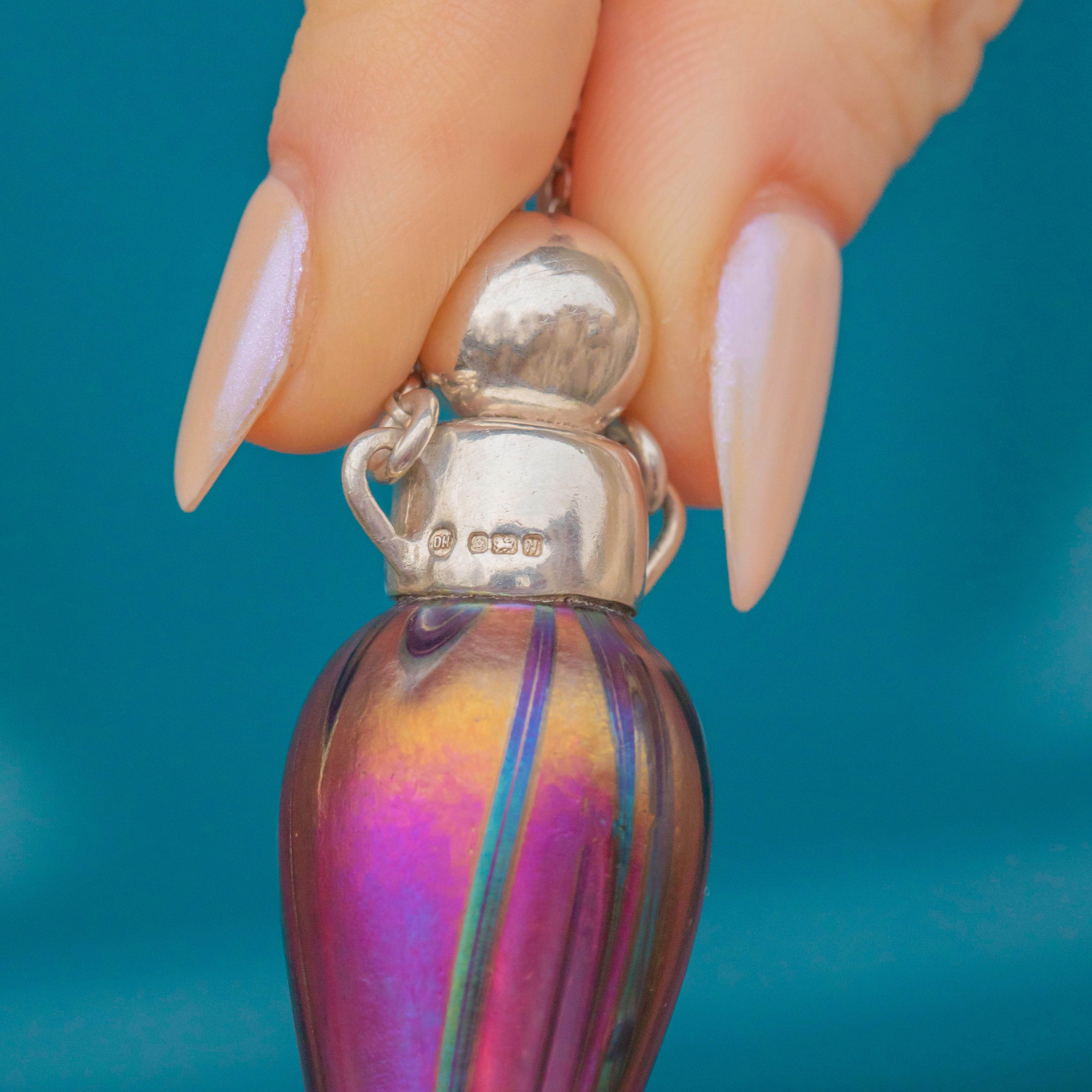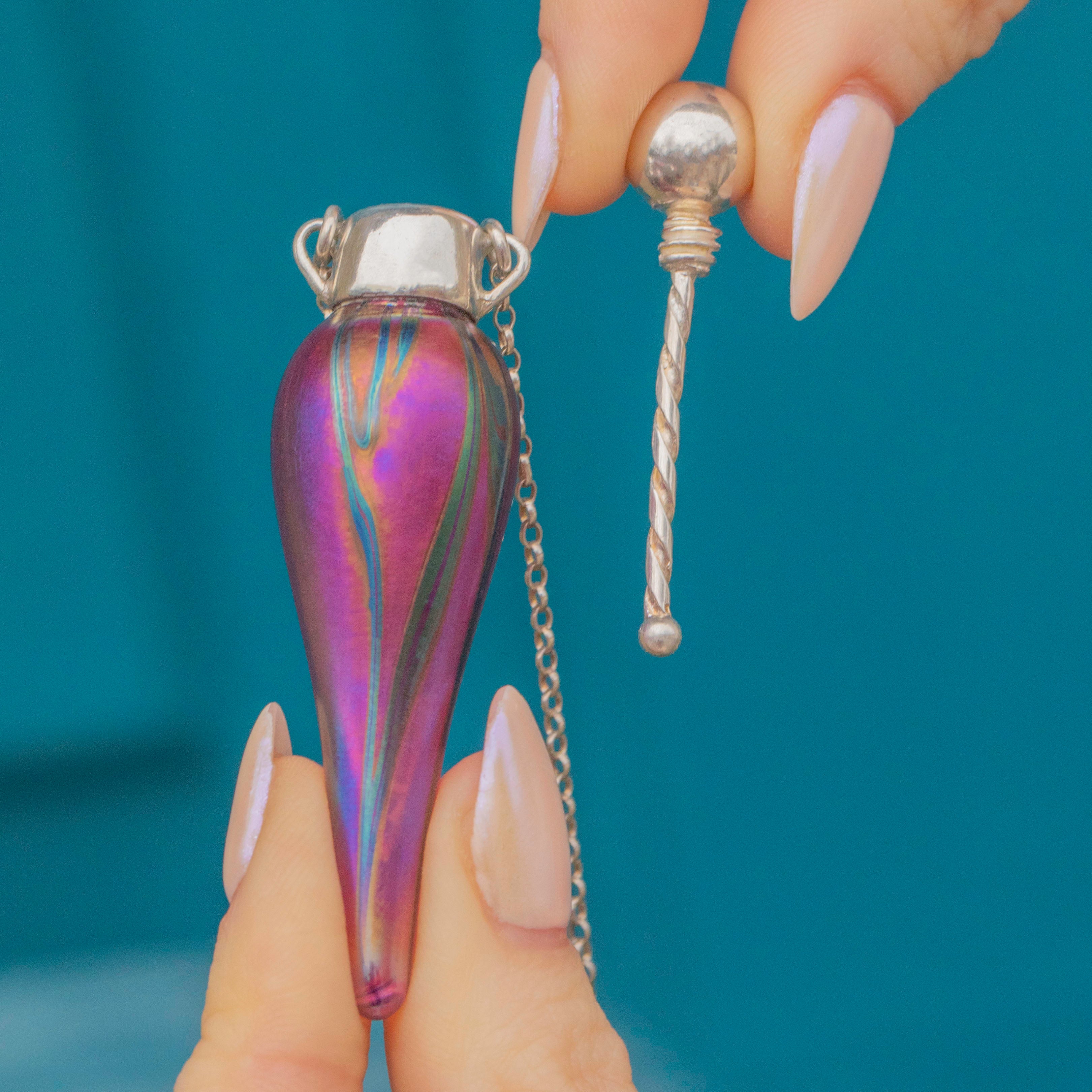 The glass bottle has a satisfying teardrop shape and displays irridescent deep purple hues that transition into dusty pink with hints of gold. Complete with a stem inside the bottle top that allows you to easily reapply your perfume on the go, this vintage perfume bottle pendant will soon become an essential piece in your jewellery collection!
