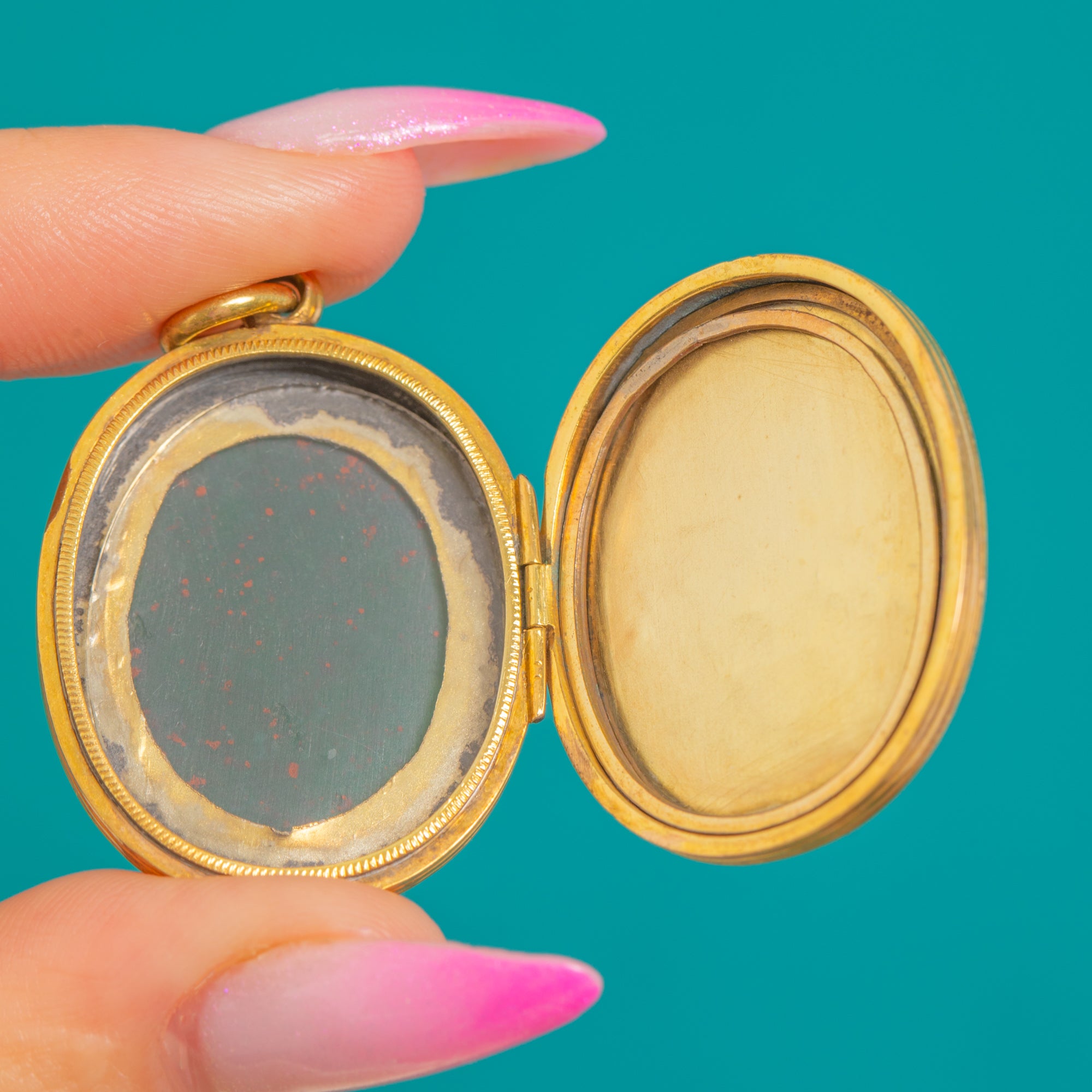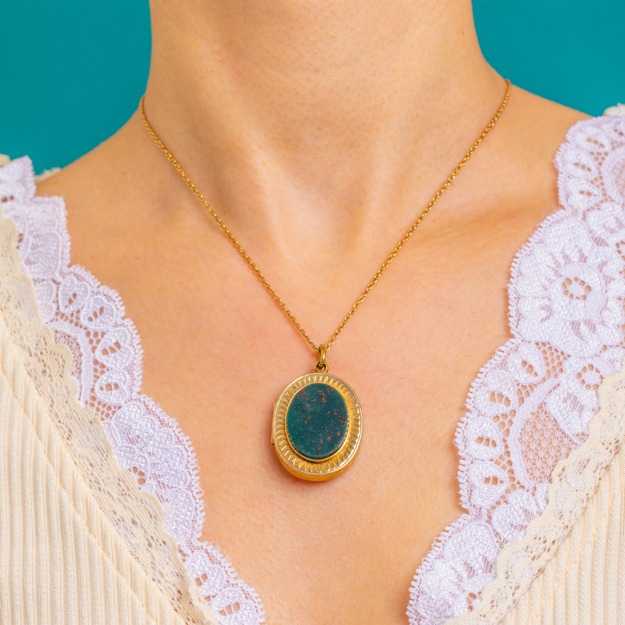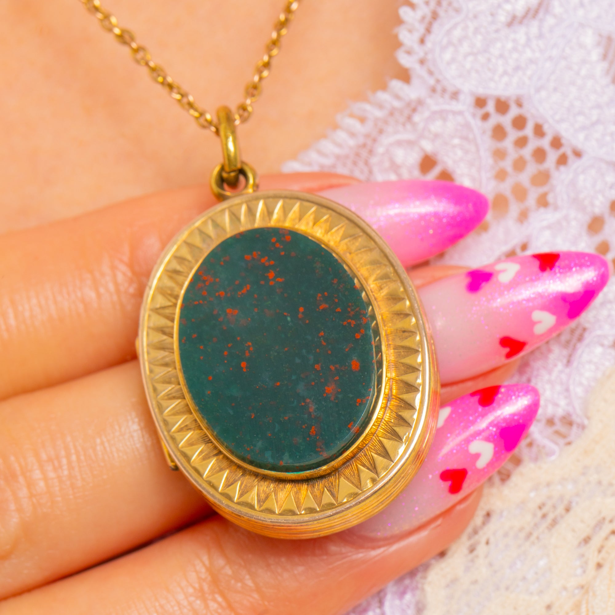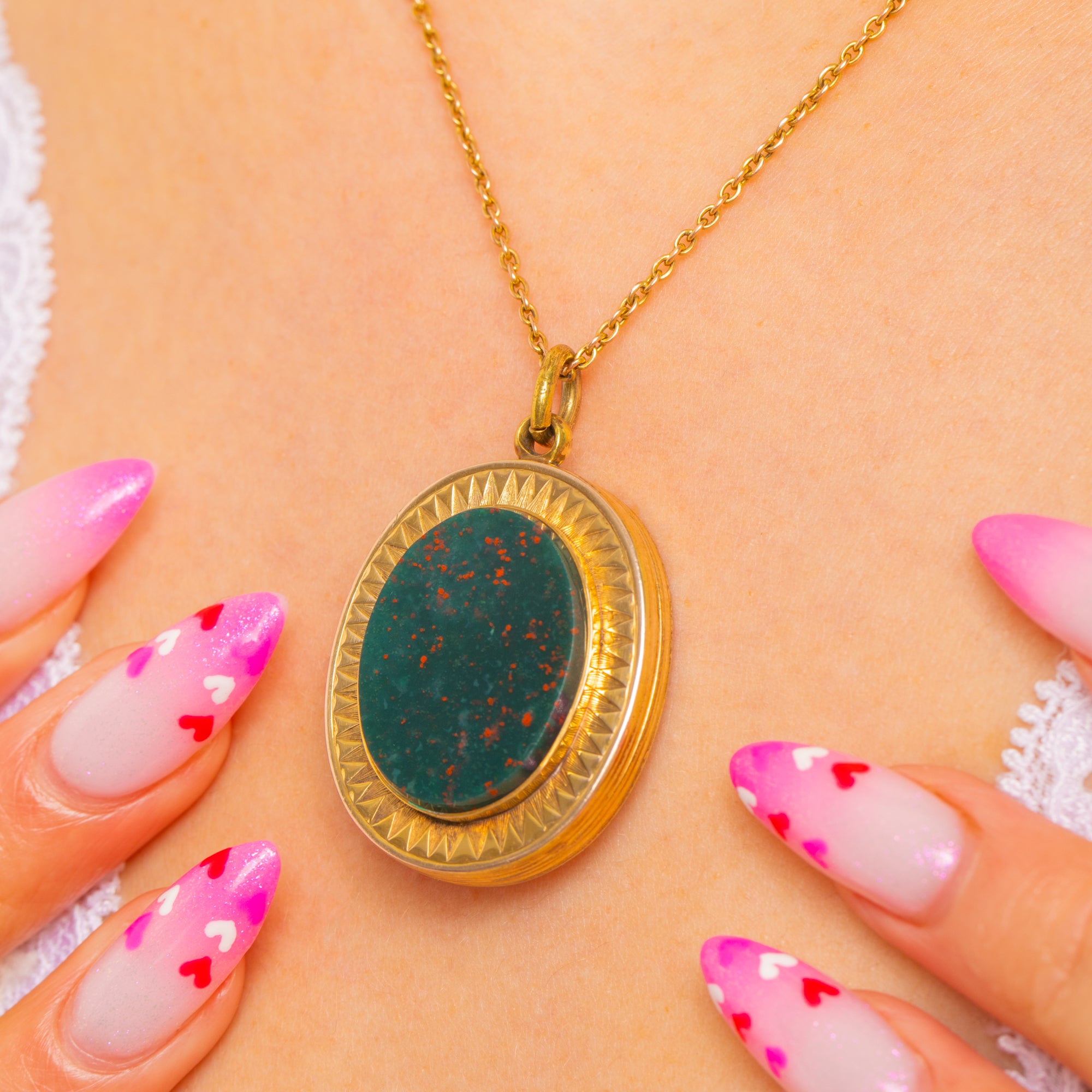 深みのある9金製の豪奢なVictorianロケット。艶やかなブラッドストーンのカボションが頂に配され、鮮やかな赤の斑点が美しく映えます。カボションは精緻なギヨシェ彫りの放射状模様と滑らかな縁取りに囲まれ、質感と光沢の見事な調和を生み出しています。