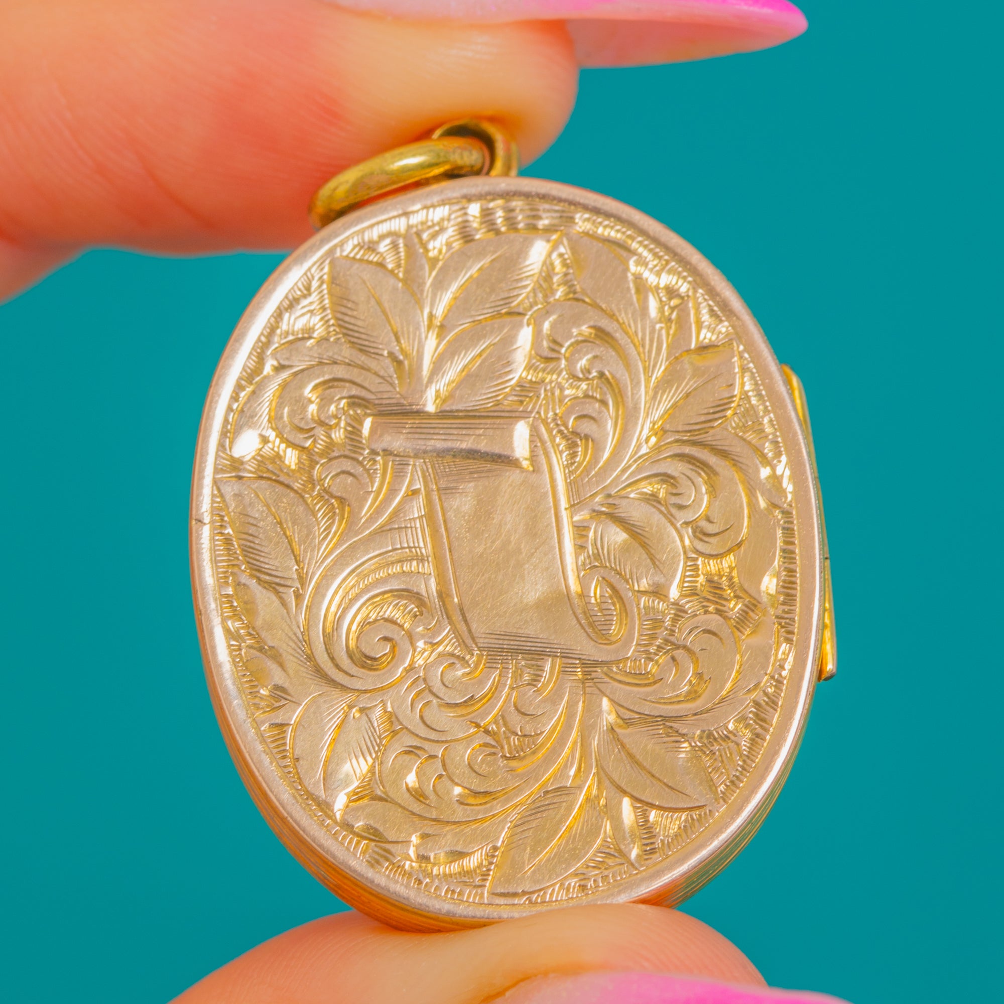 裏面には優美な草花模様のスクロール彫刻と、中央に空白のカルトゥーシュが施されています。ご希望であればイニシャルを刻むのに最適です。ロケットは内部に二つの記念品用収納部があり、専用の枠が付属しています。大切な思い出を美しく収めていただけます。