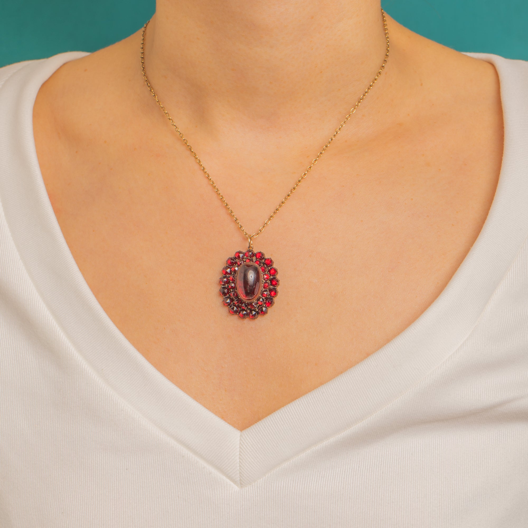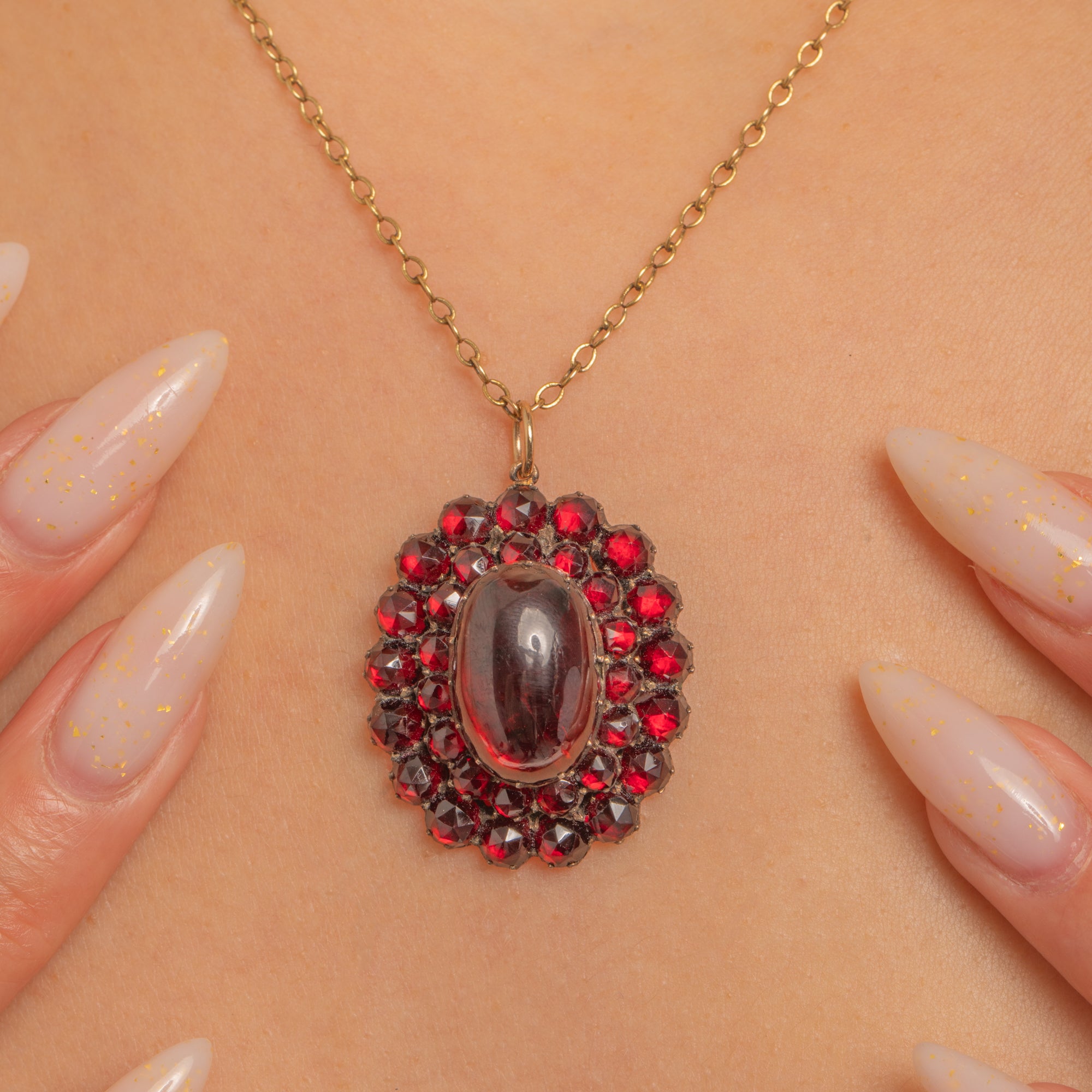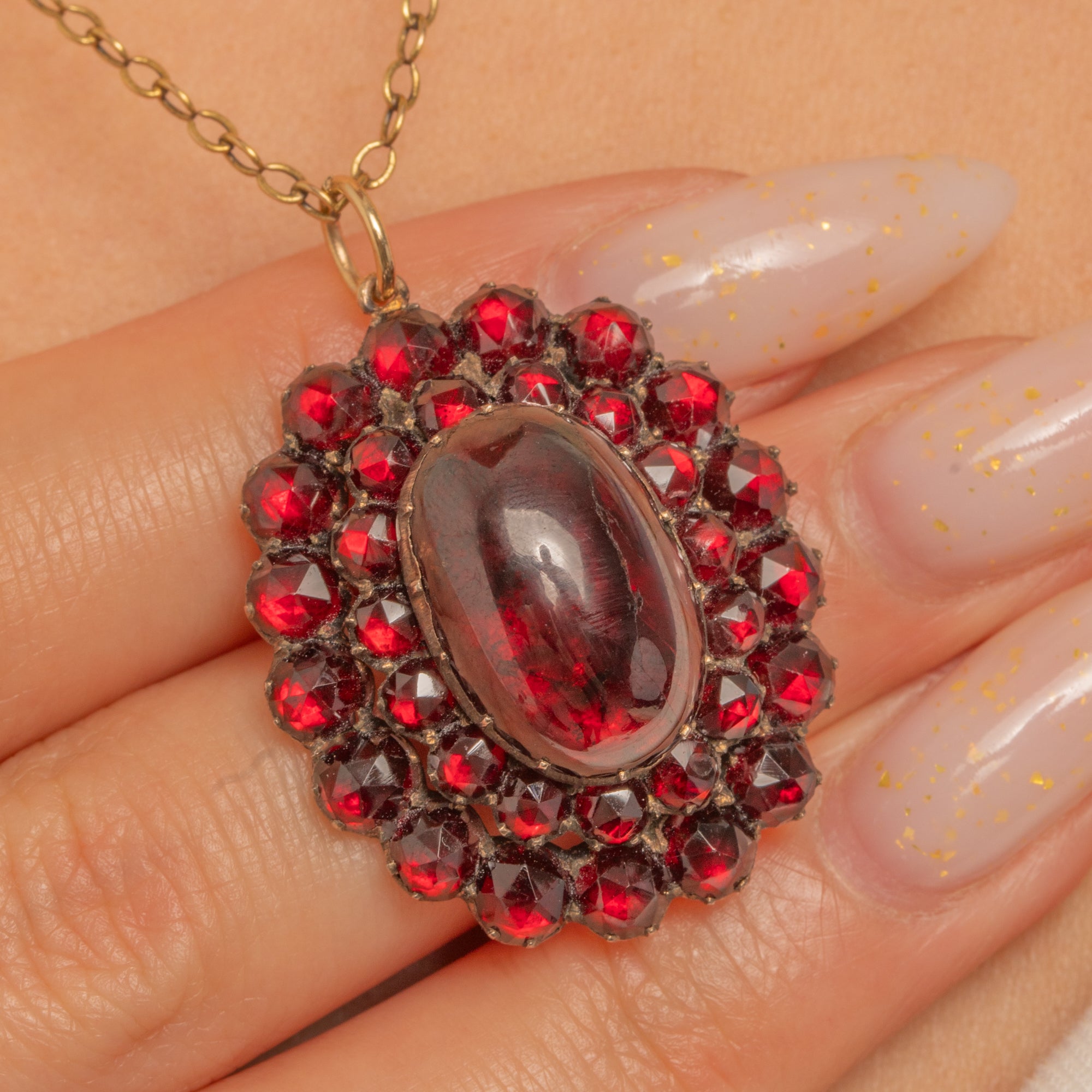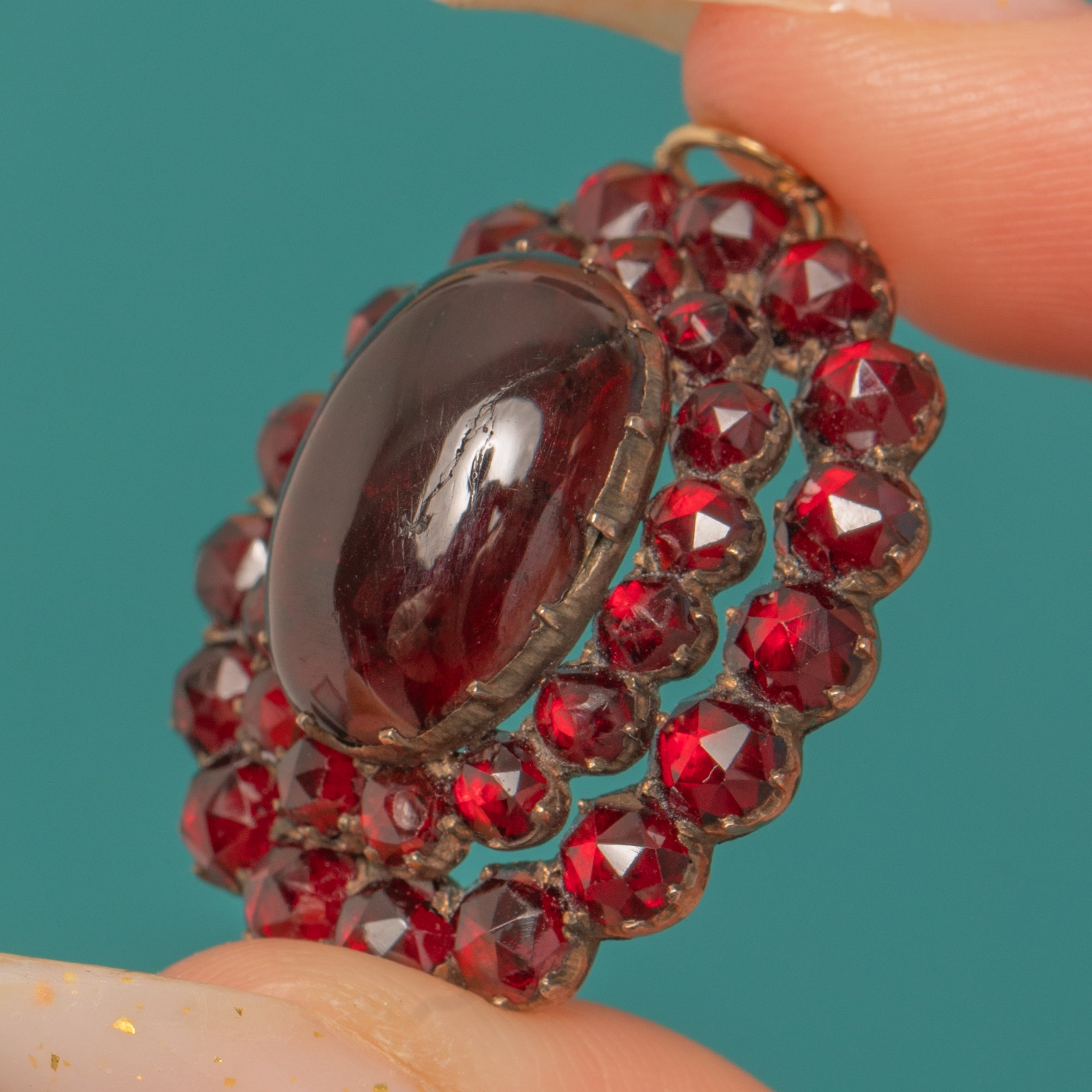 A richly coloured Victorian Garnet cluster pendant, glowing with a high-domed oval Cabochon Garnet embraced by two concentric halos of deep wine-red rose-cut Garnets. The tightly packed closed-back collet settings create a sumptuous, jewel-toned mosaic, while the scalloped reverse and warm golden tones lend that irresistible antique allure.