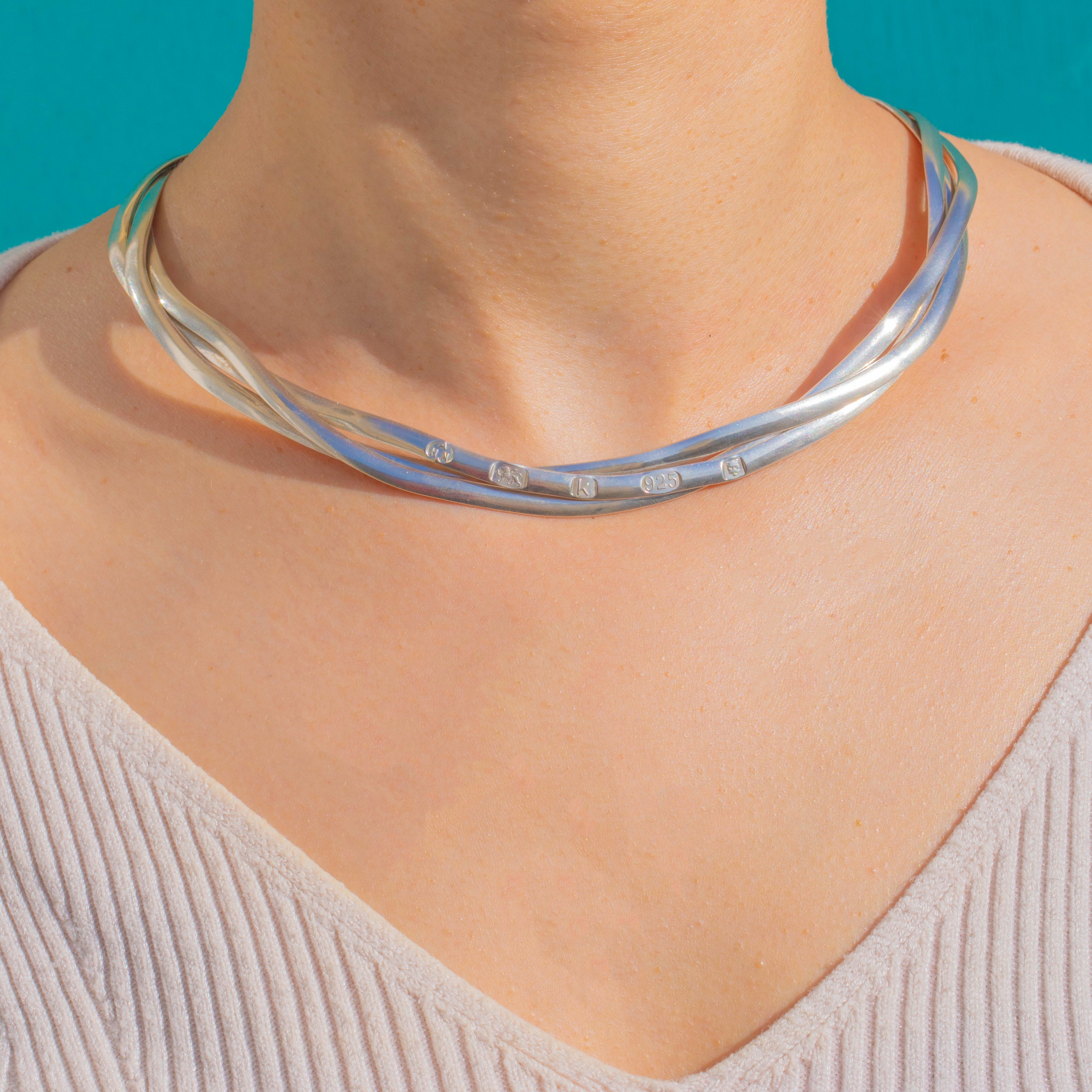 洗練された彫刻的な美しさと、確かなシックさを兼ね備えたこのスターリングシルバー製トルクカラーは、丸みを帯びたチューブ状の3本のストランドを、クリーンで編み込みを思わせるフォルムに仕上げています。明るく高い鏡面仕上げと直線的なシルエットが、建築的なエッジを効かせたミニマルで大胆な印象を与えます。