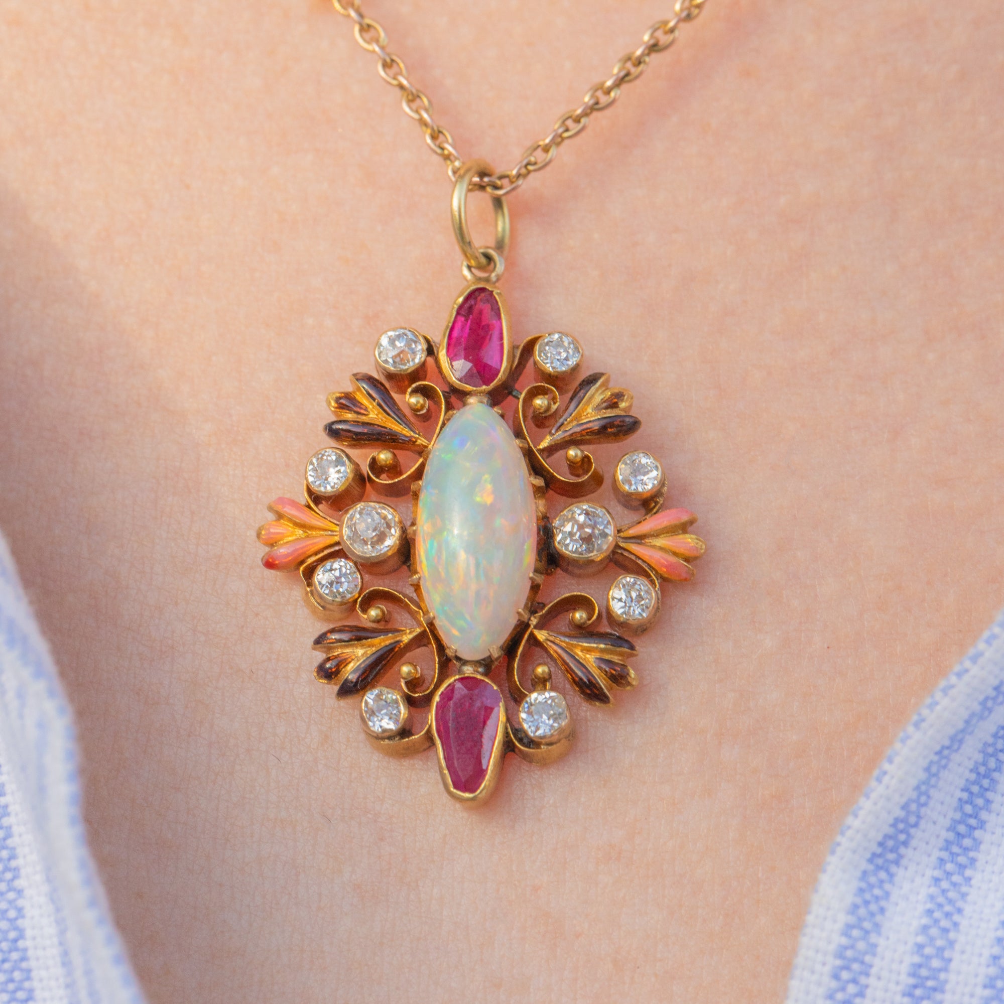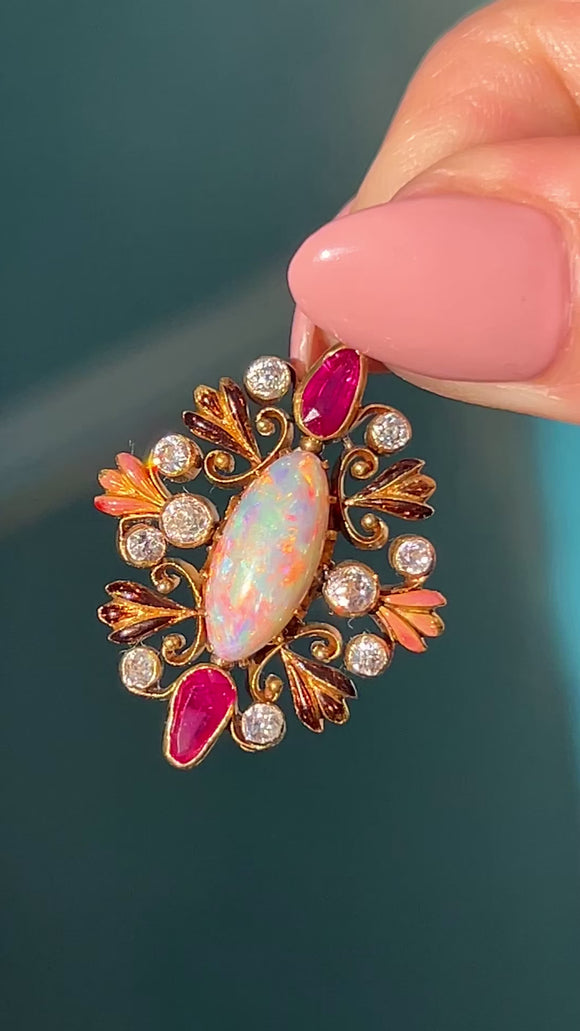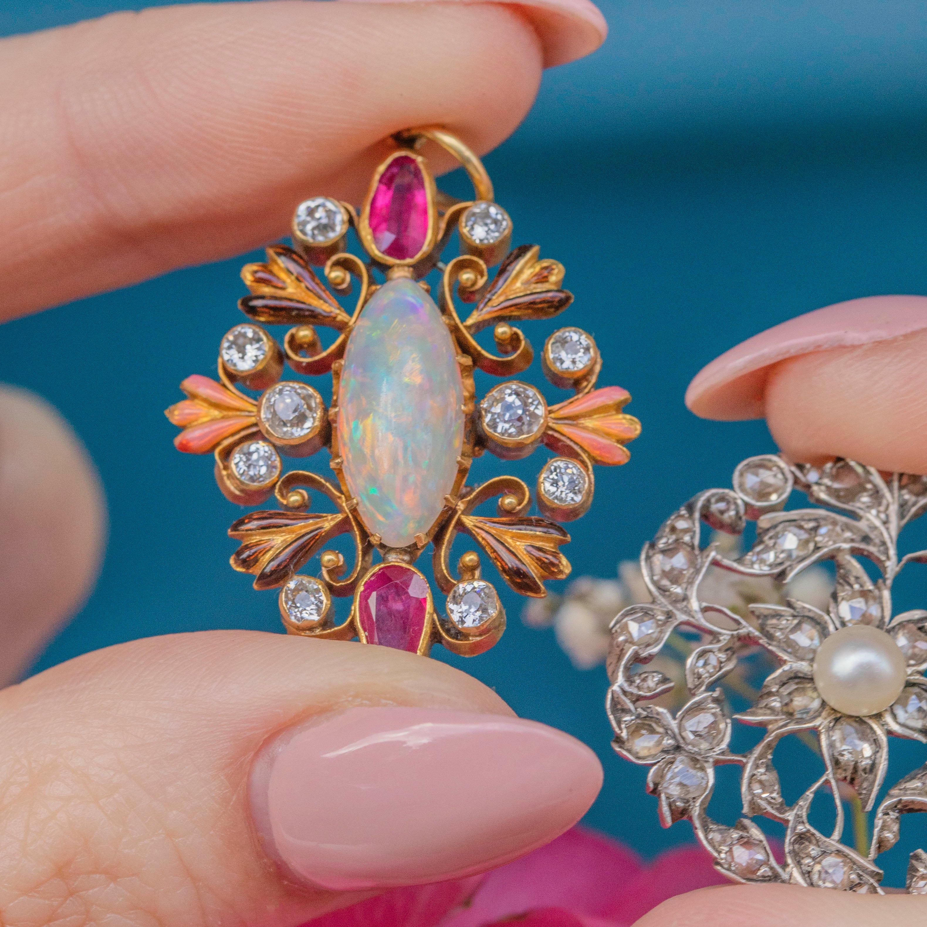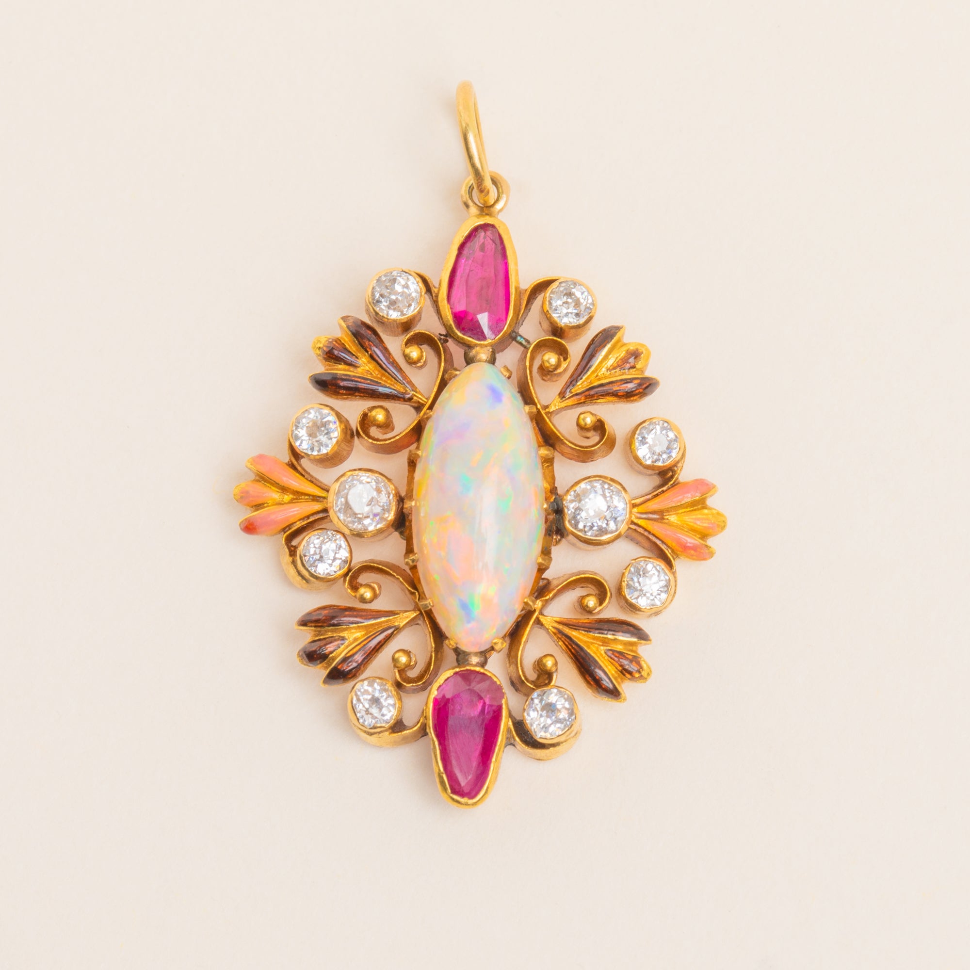 VERY GOOD. This 18ct Gold natural Opal Ruby Diamond pendant is in very good condition! The Opals, Diamonds, and Rubies pose no damage to note, and although there is slight movement in the Opal within its claw settings, it is still very secure. The Gold has a rich saturation throughout, with some darkening in the grooves, but we feel this only adds to her antique charm. With a generously sized, soldered jump ring, this antique Diamond pendant can be worn with confidence!