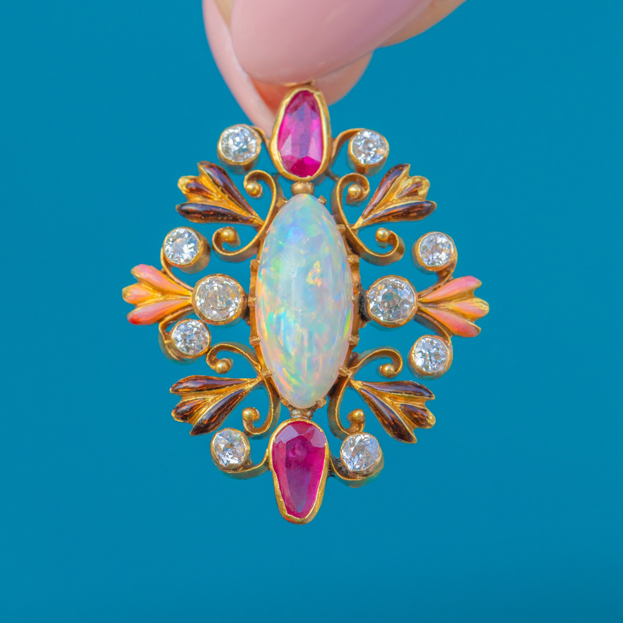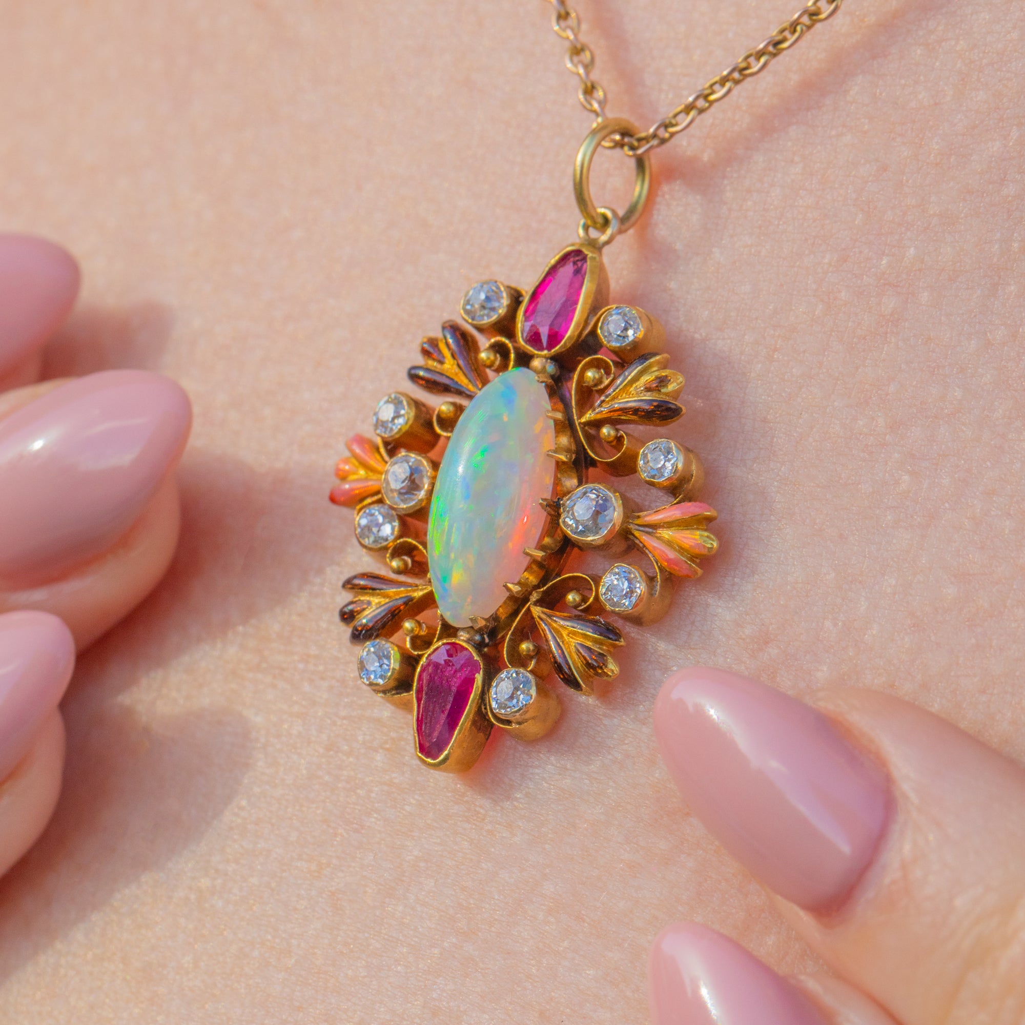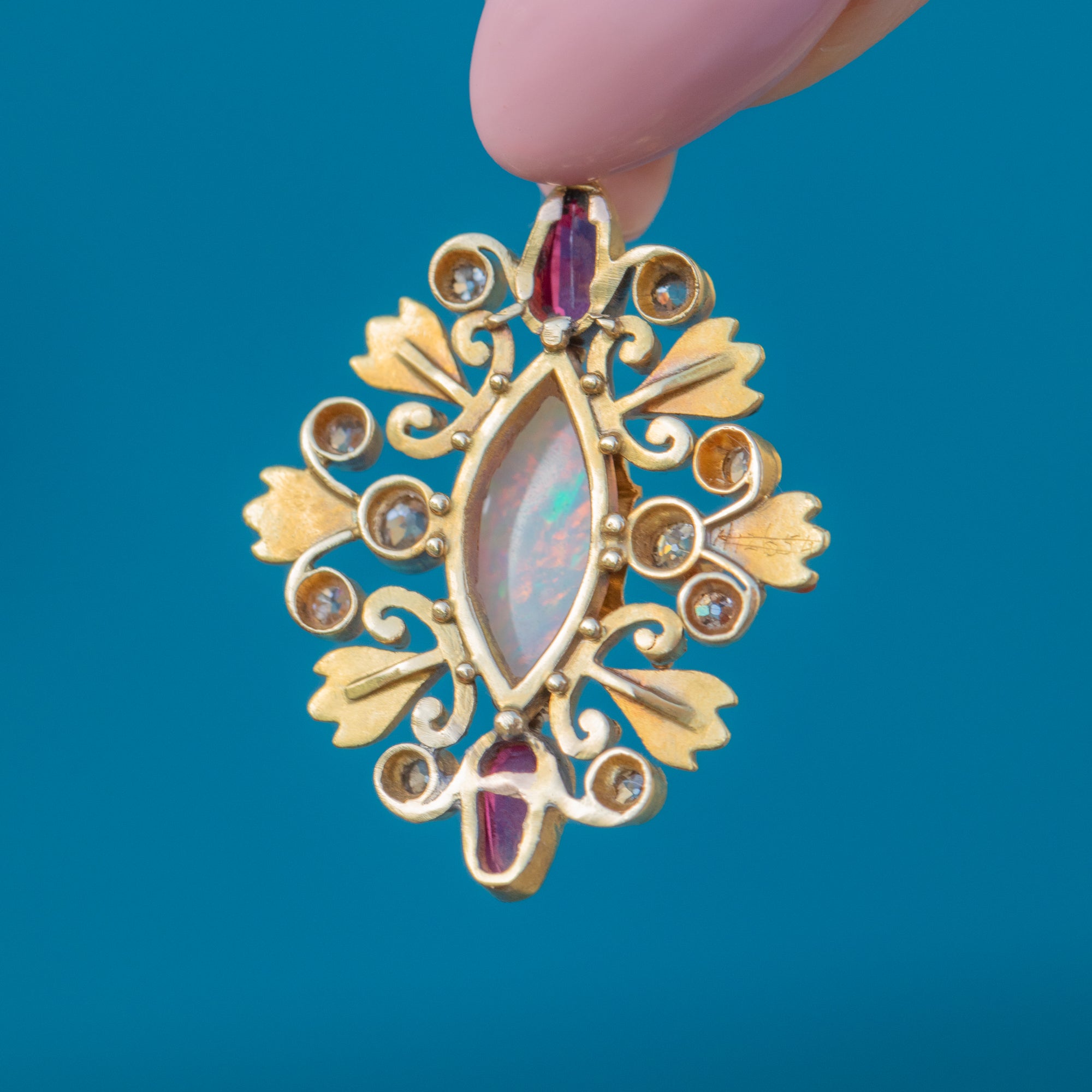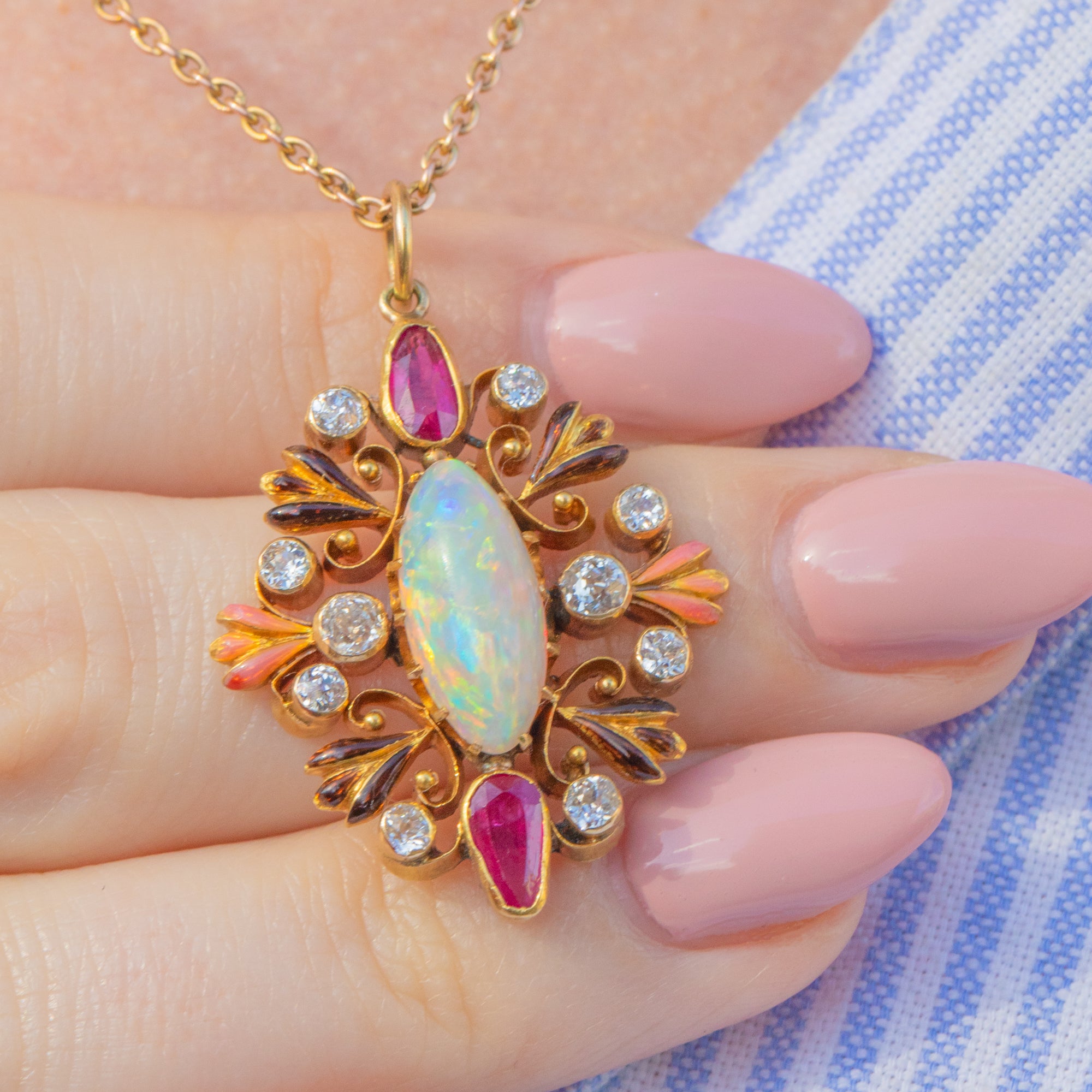 VERY GOOD. This 18ct Gold natural Opal Ruby Diamond pendant is in very good condition! The Opals, Diamonds, and Rubies pose no damage to note, and although there is slight movement in the Opal within its claw settings, it is still very secure. The Gold has a rich saturation throughout, with some darkening in the grooves, but we feel this only adds to her antique charm. With a generously sized, soldered jump ring, this antique Diamond pendant can be worn with confidence!