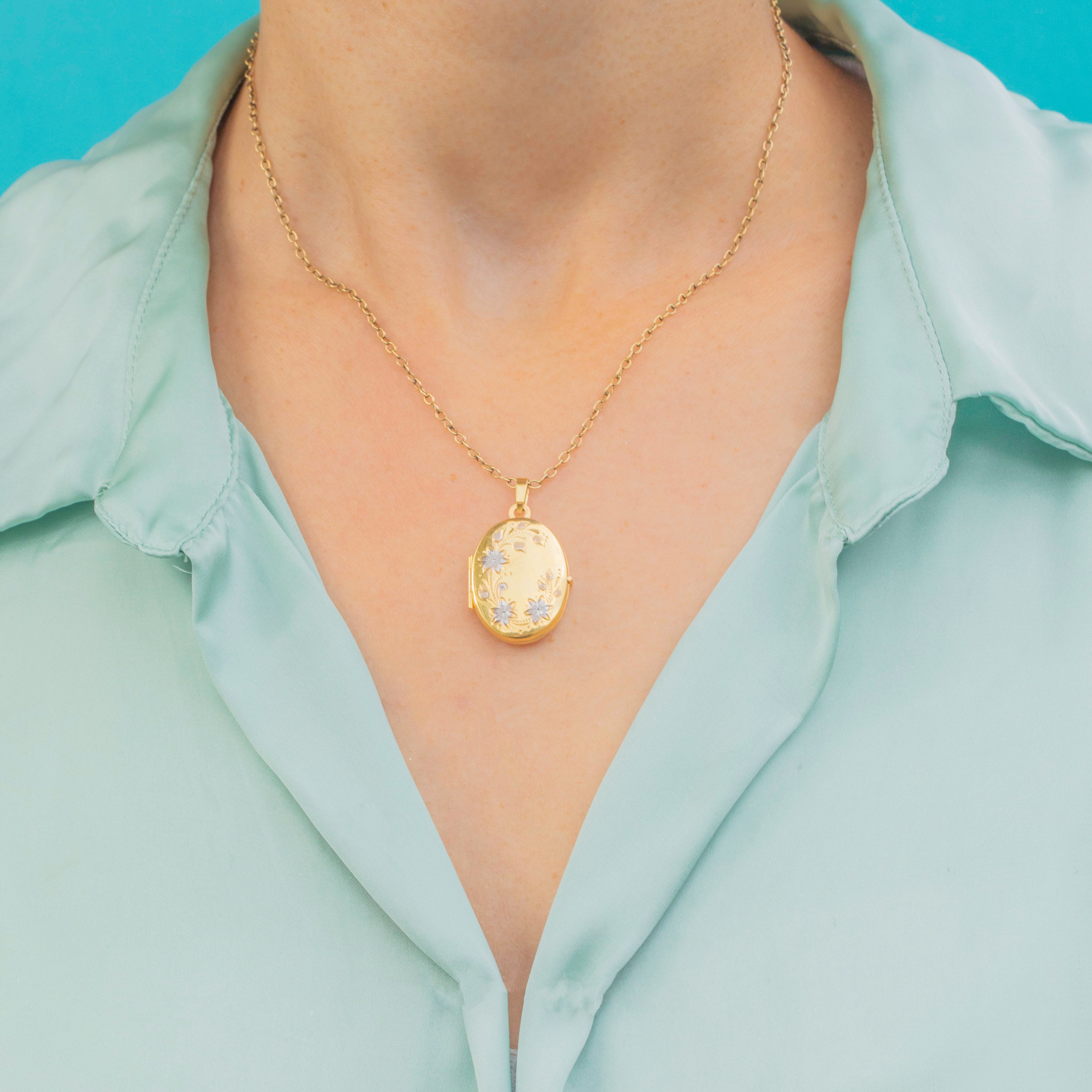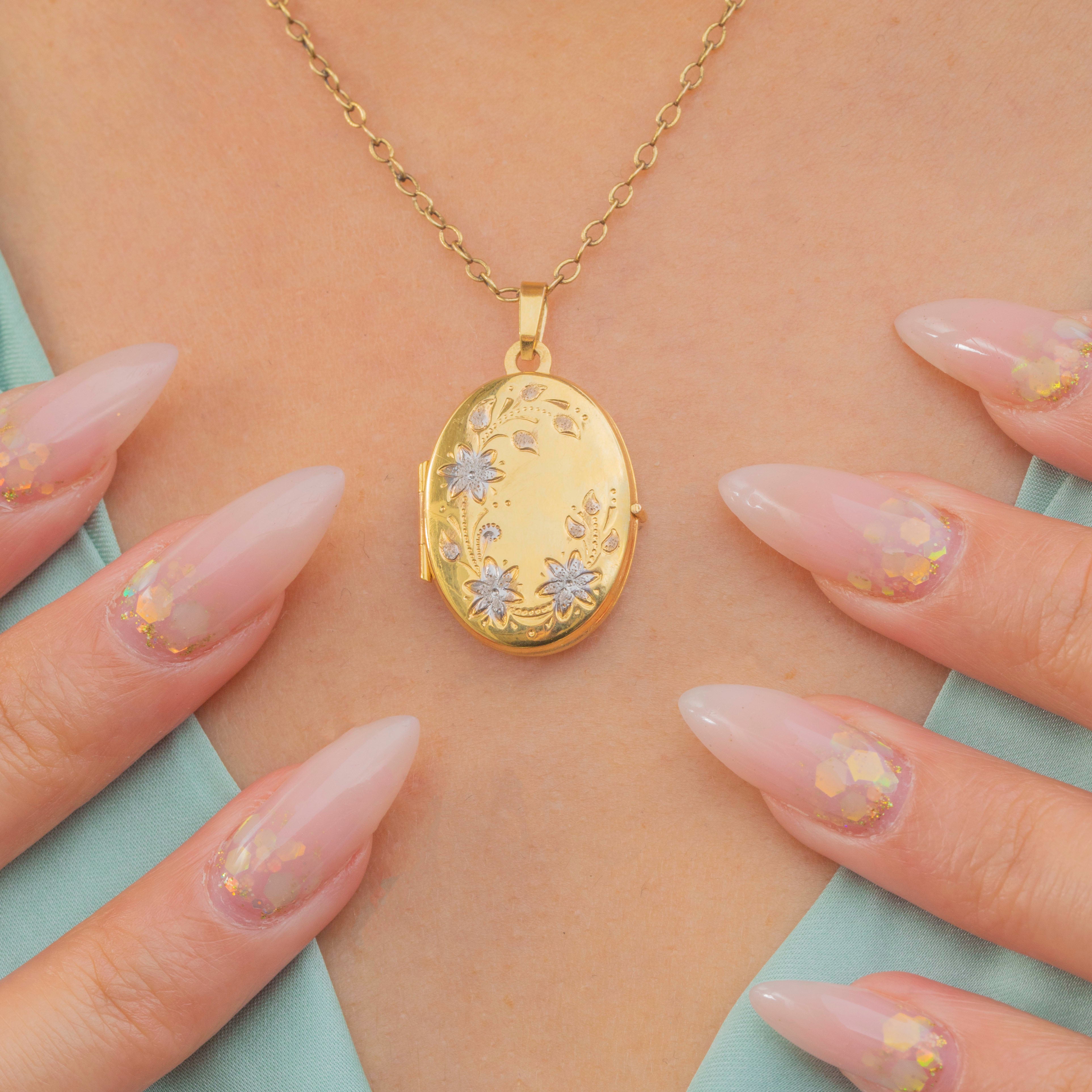 This sweet Vintage locket is crafted in 9ct Gold and decorated with charming white Gold floral details. The soft oval shape is timeless, while the delicate engraved flowers add a touch of sparkle and femininity. A lovely piece for keeping treasured photographs or mementos close to the heart, it perfectly balances sentiment with style.