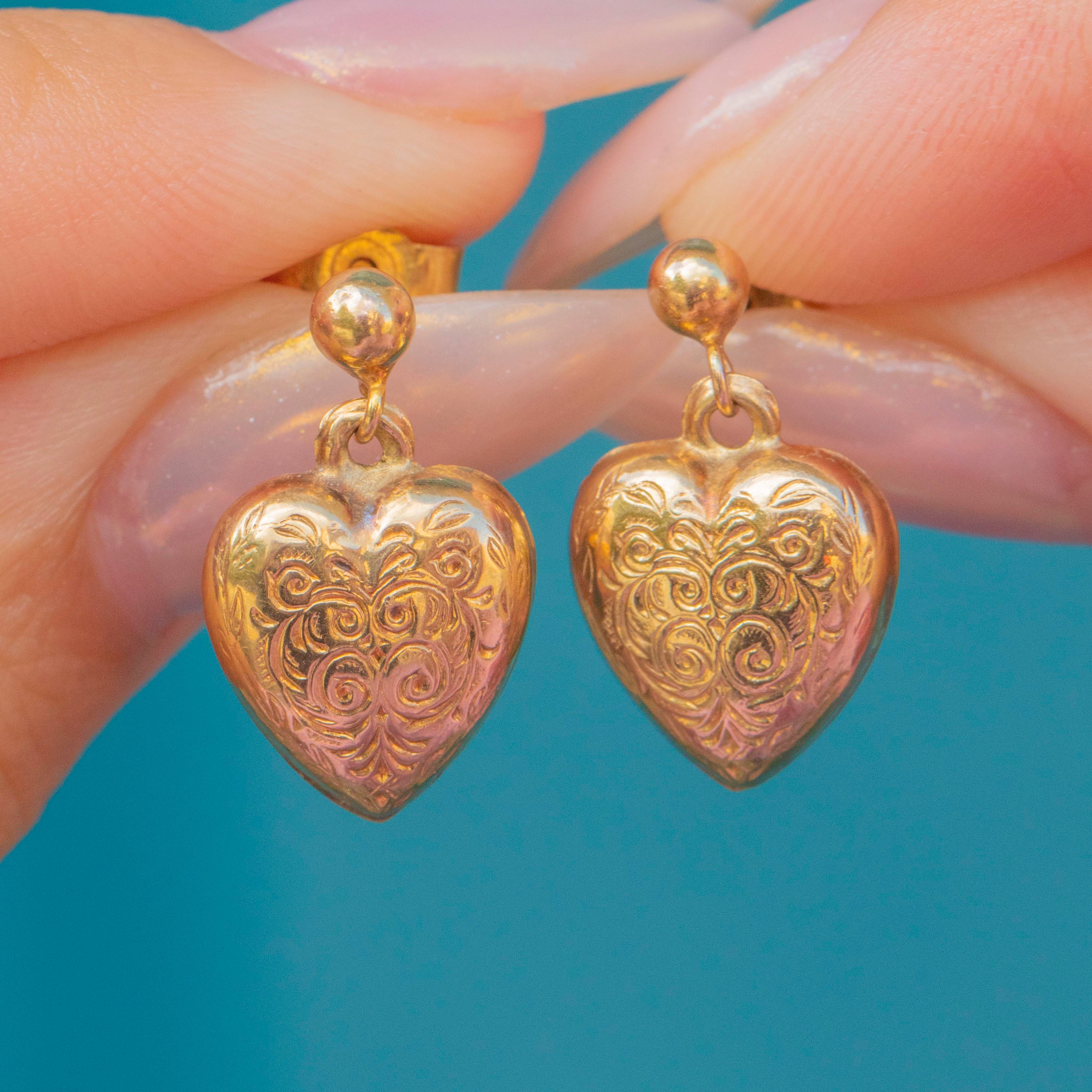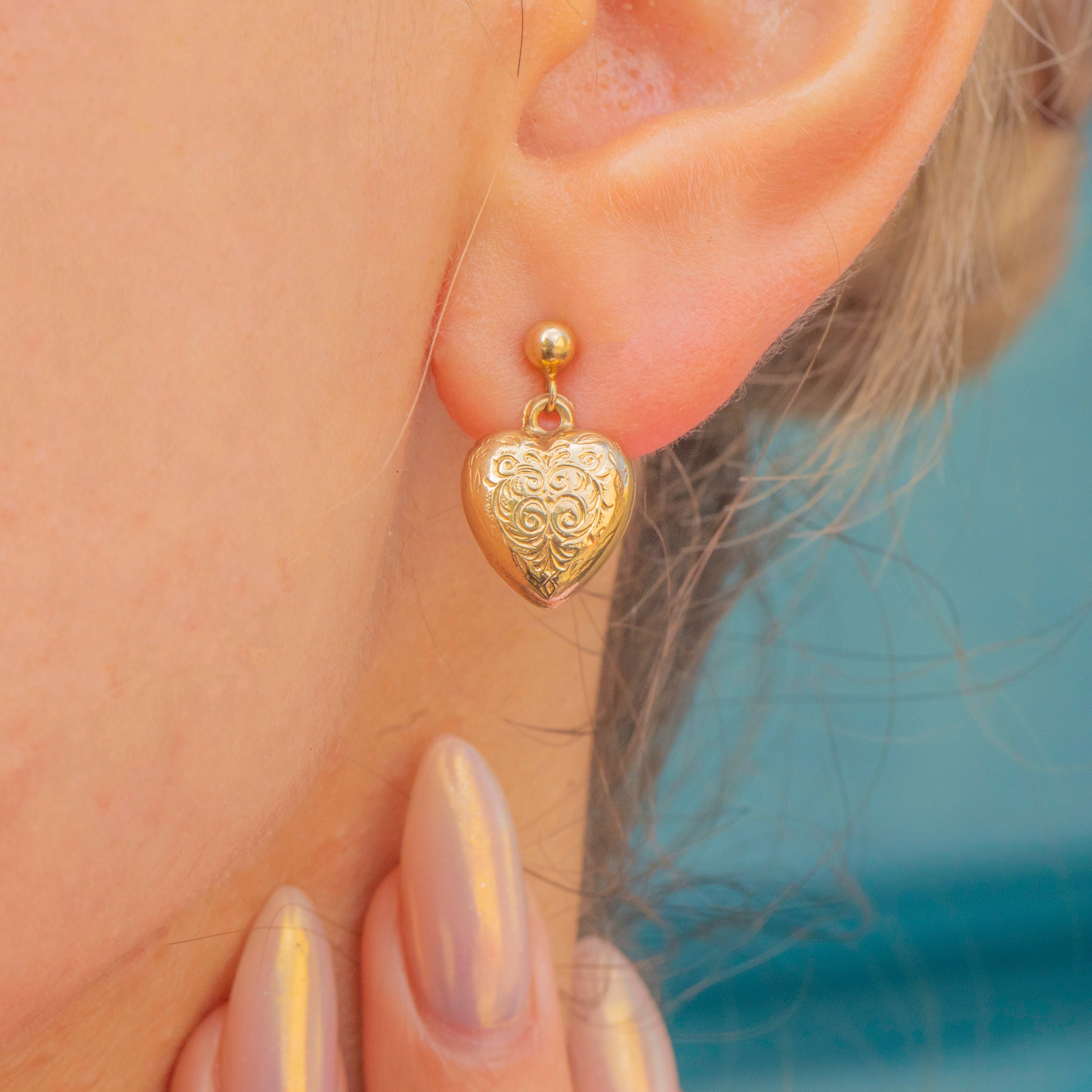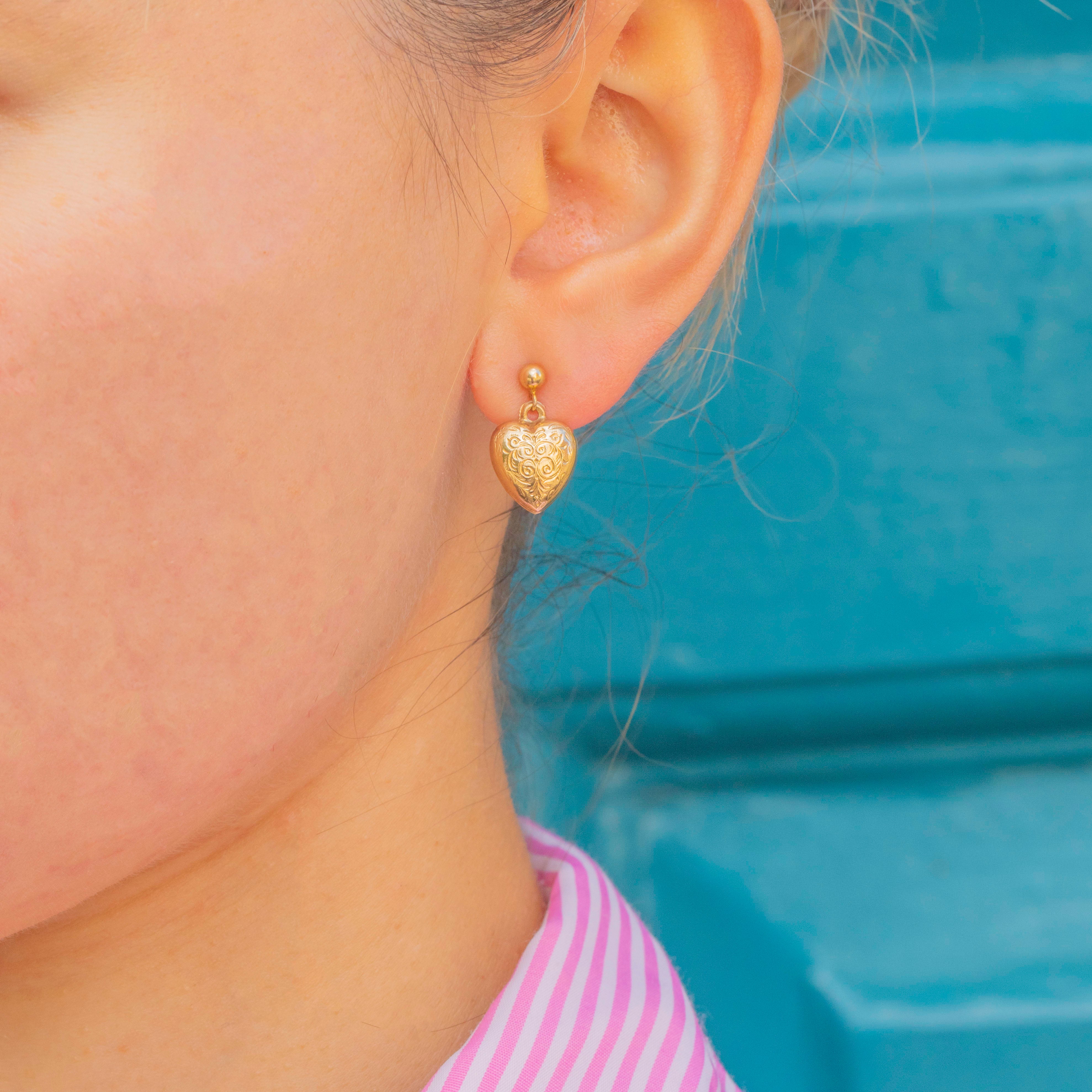 Charming Mid-Century 9ct Gold Puffy Heart drop earrings, c.1972, featuring plump, smooth hearts that move gracefully in the ear.