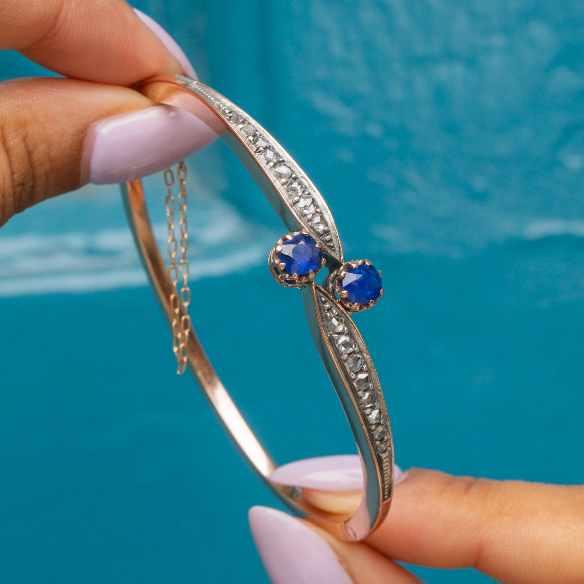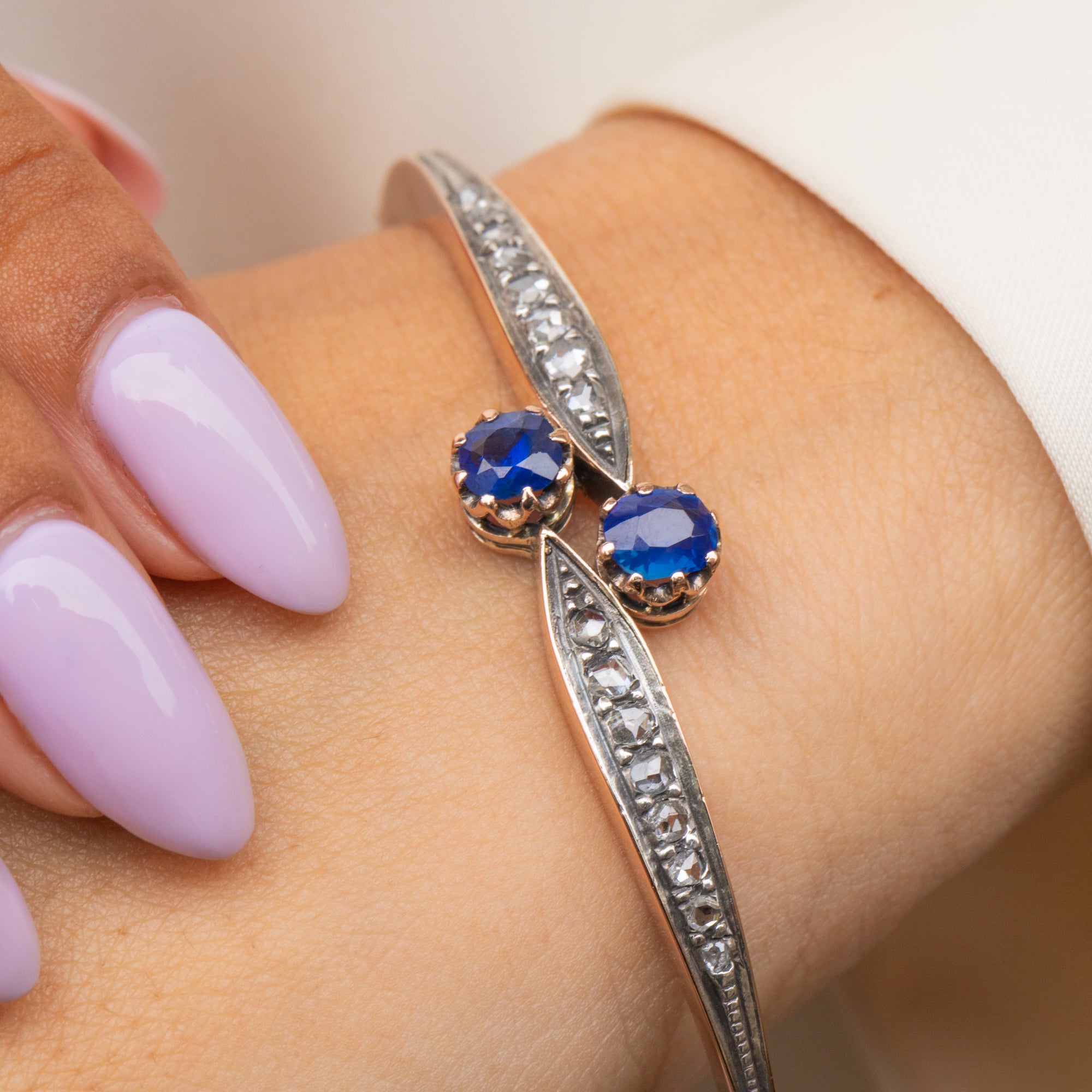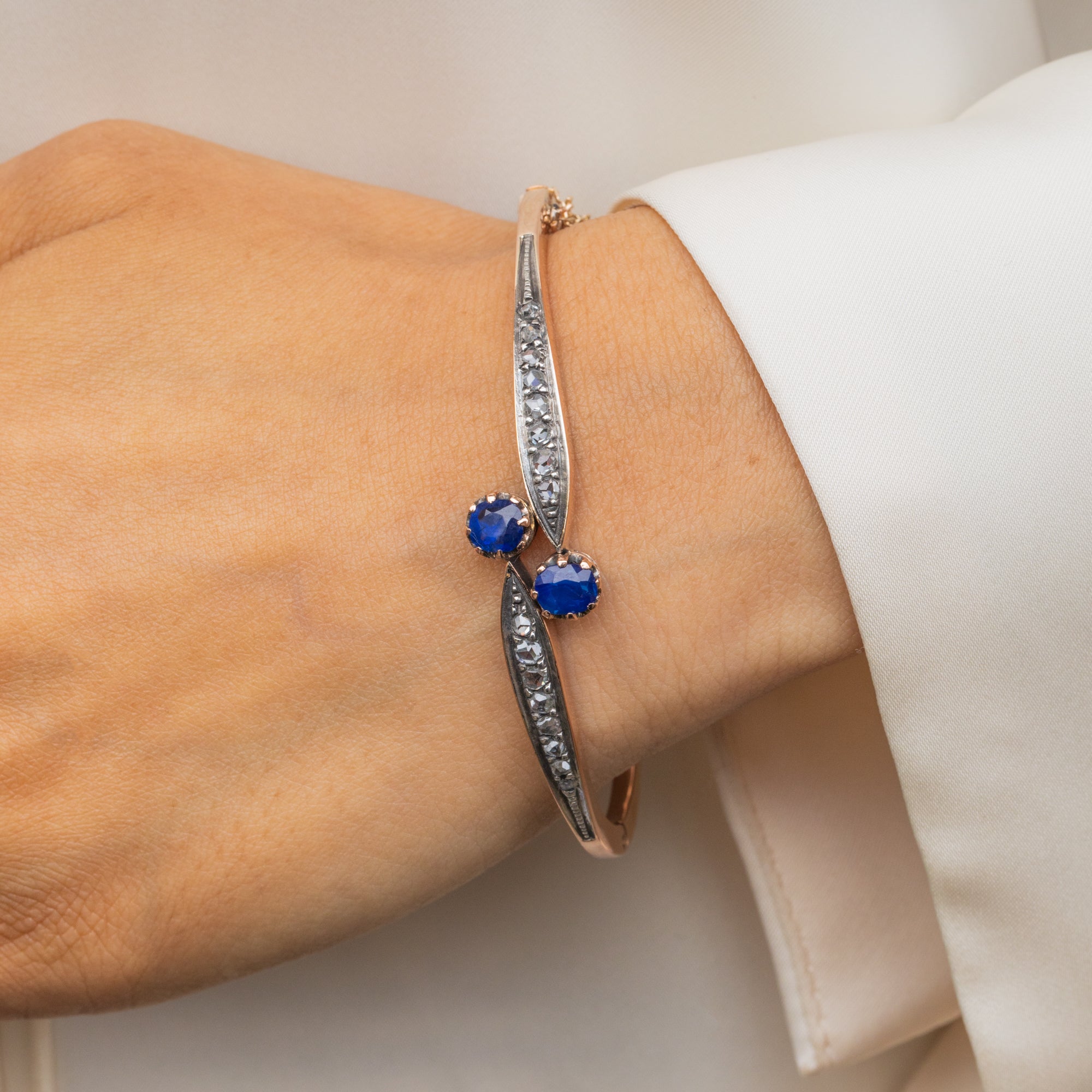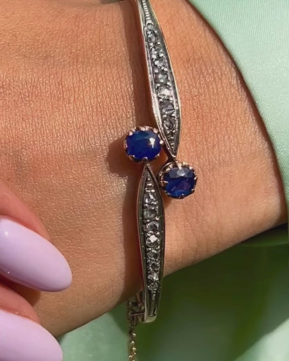 アンティーク 18ct ゴールド サファイア ダイヤモンド トワエモア バングル、0.75ct ナチュラルサファイア
