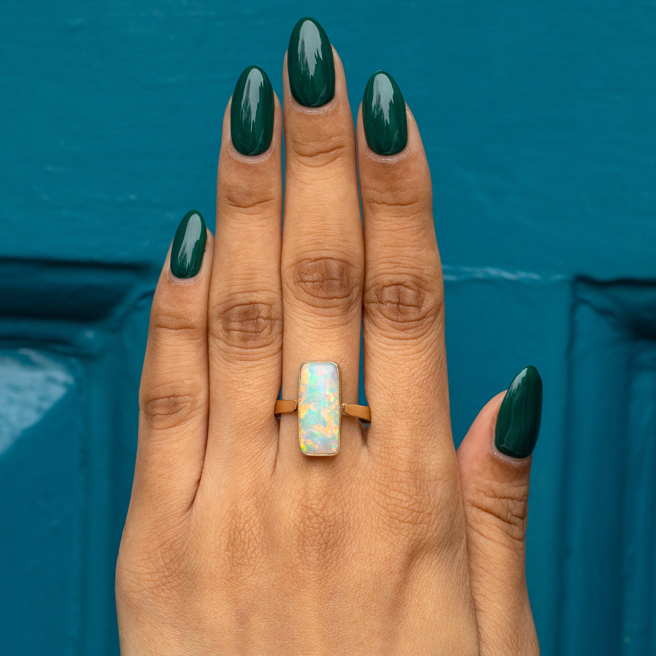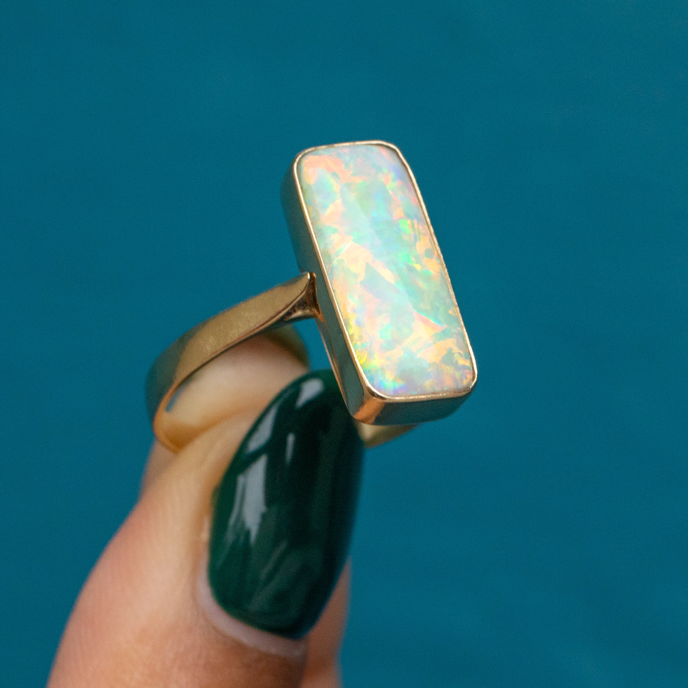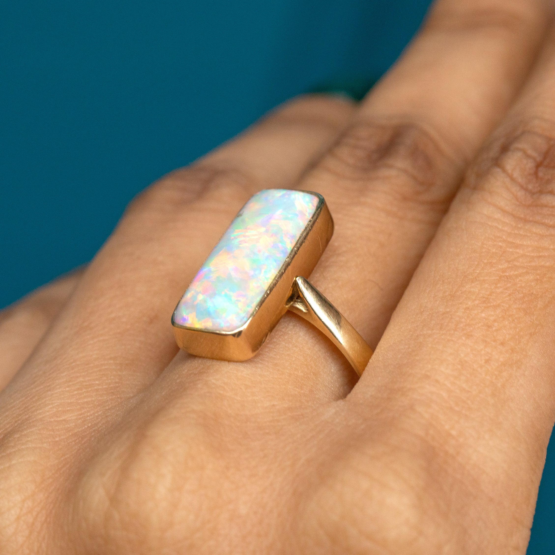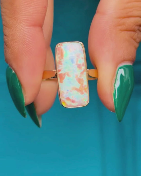 鮮やかな14カラットゴールド長方形オパールパネルリング、6.02カラットオパールダブレット