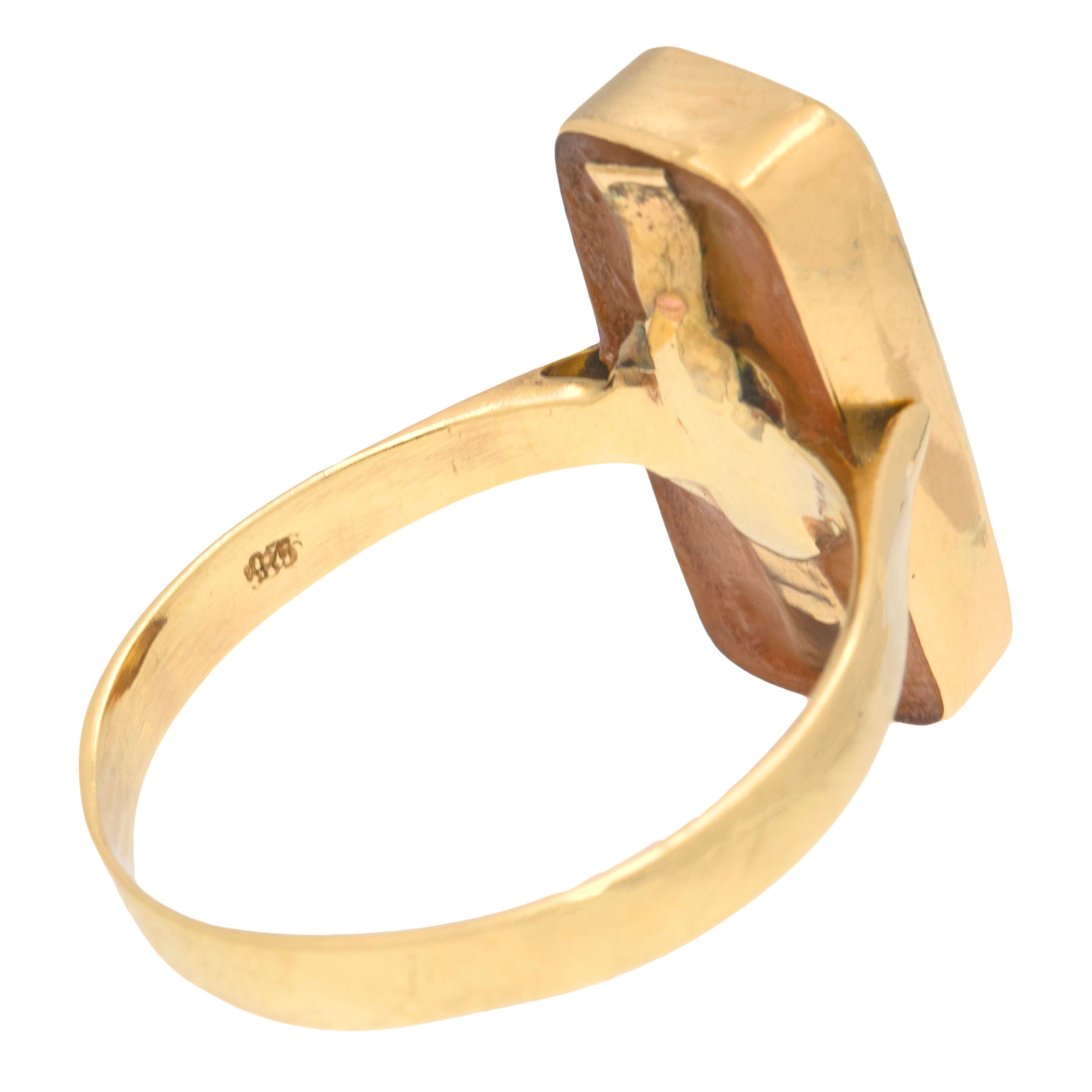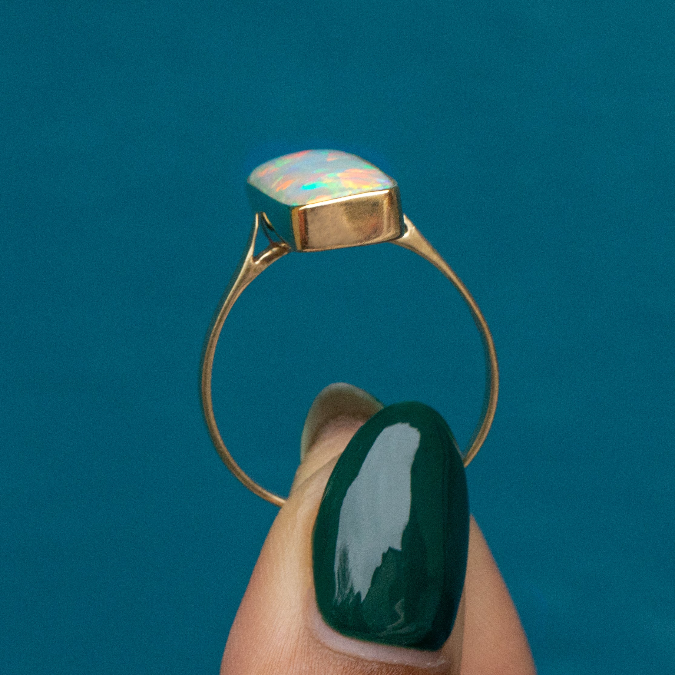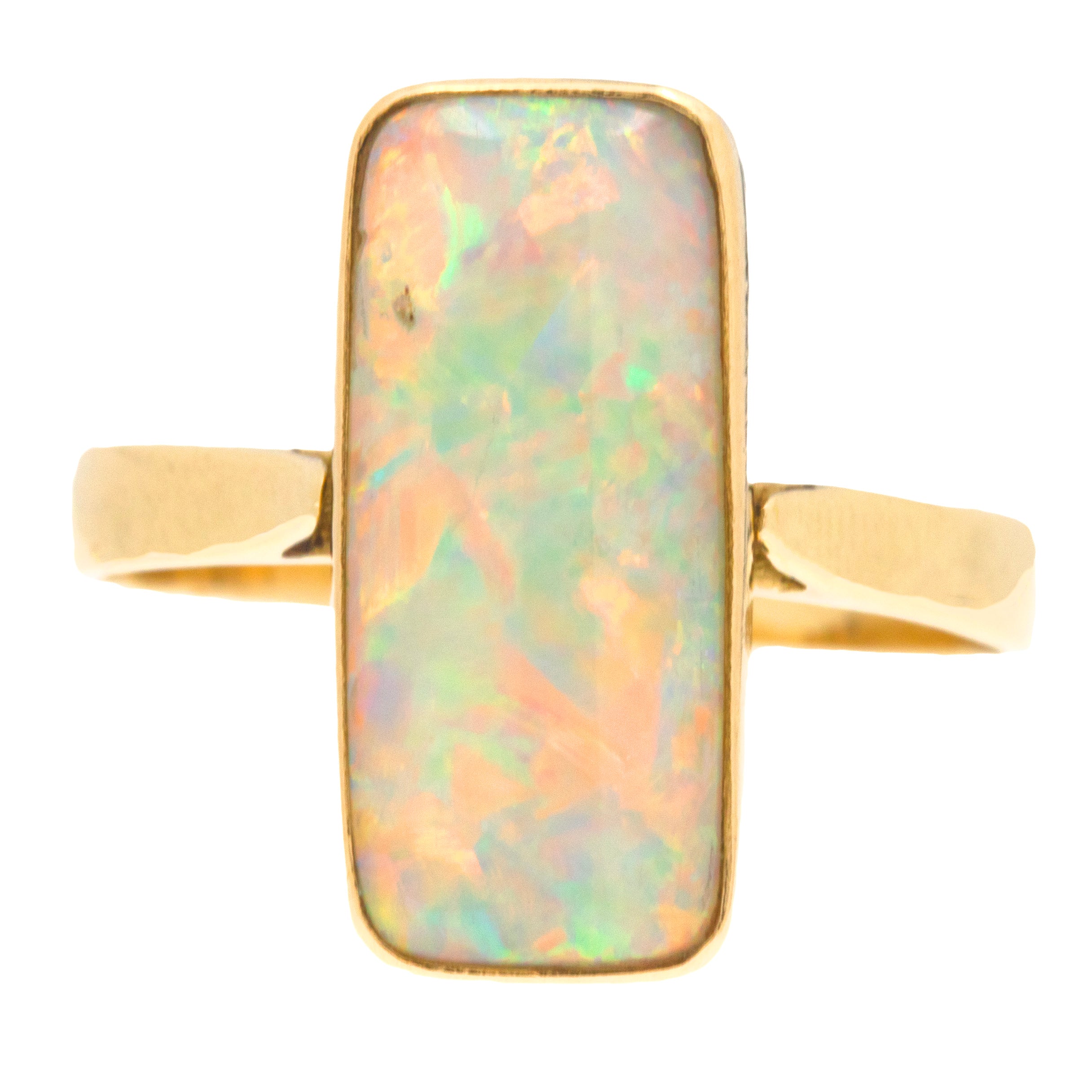 鮮やかな14カラットゴールド長方形オパールパネルリング、6.02カラットオパールダブレット