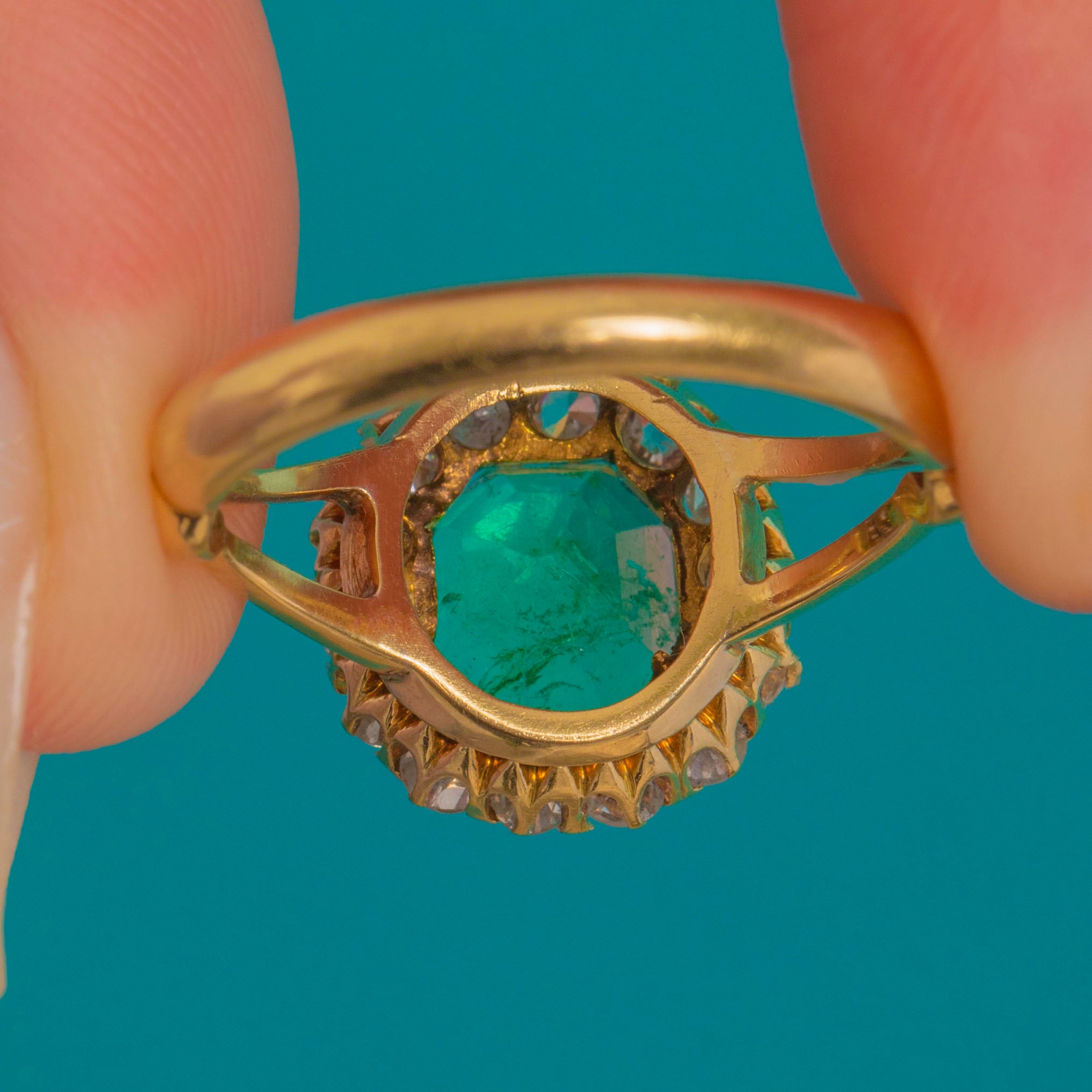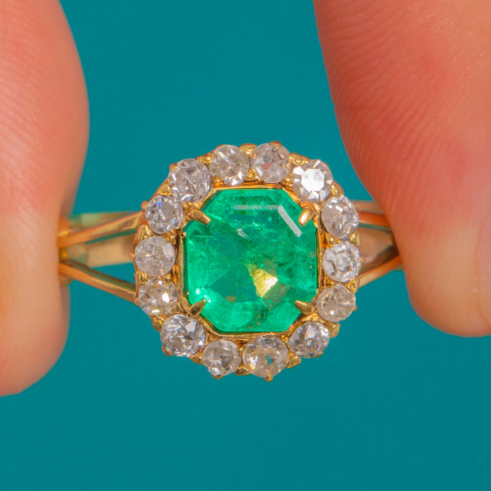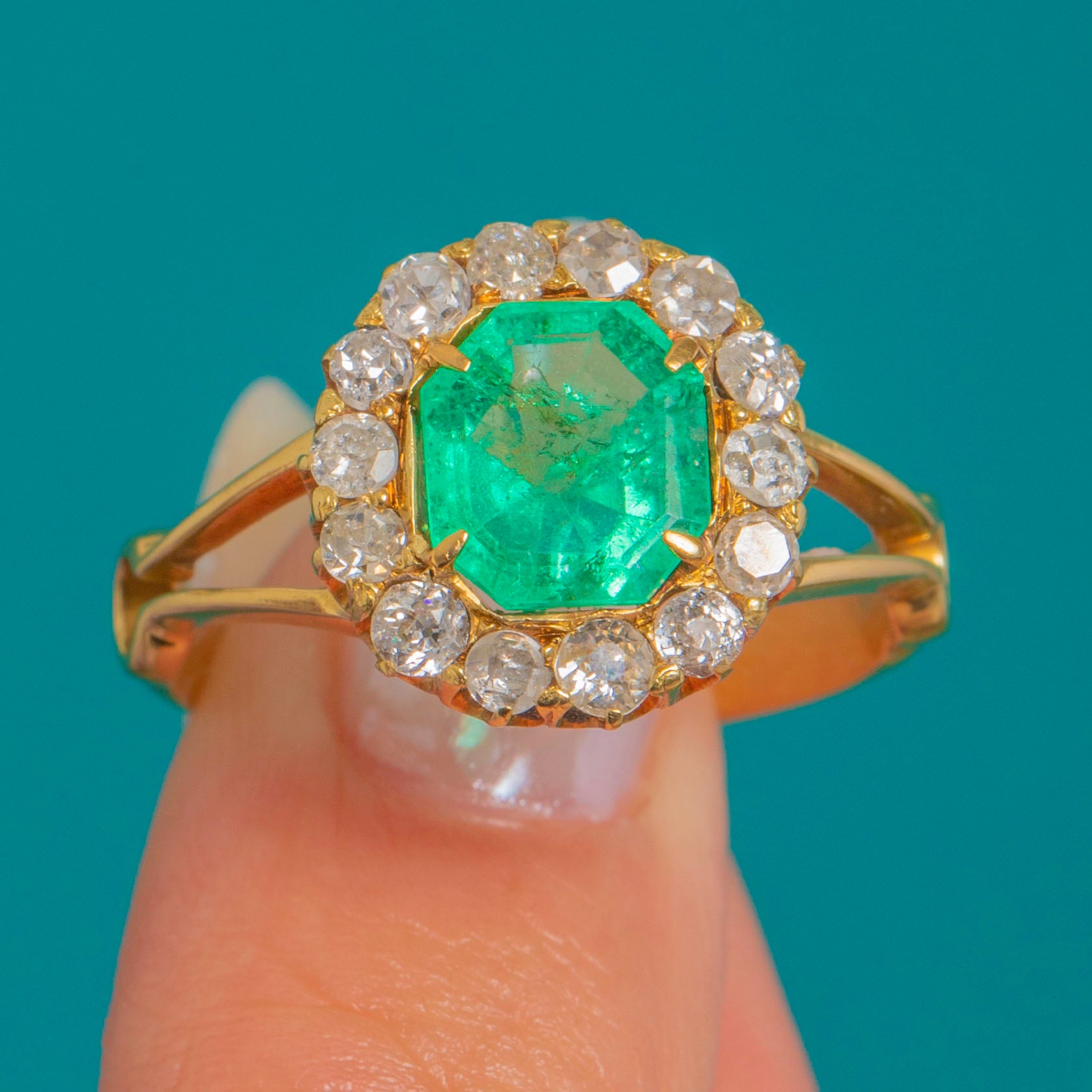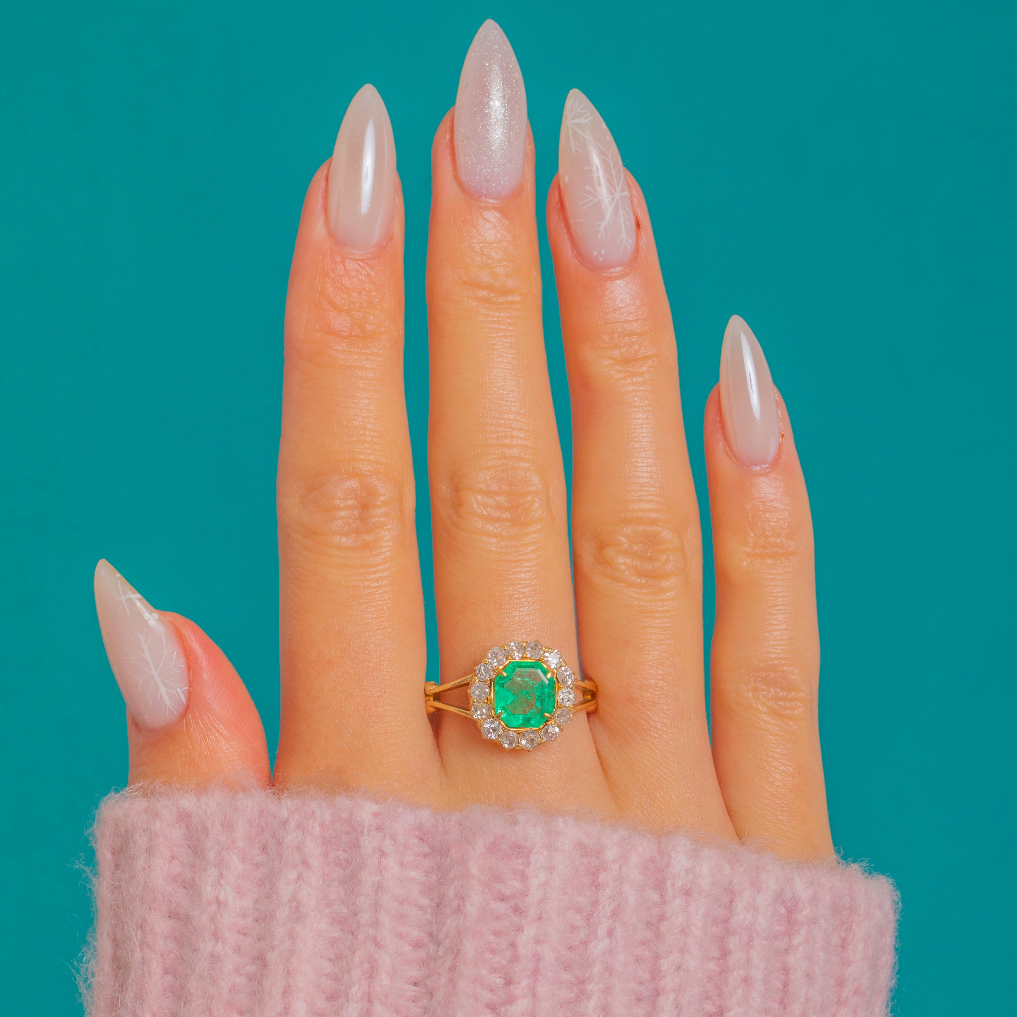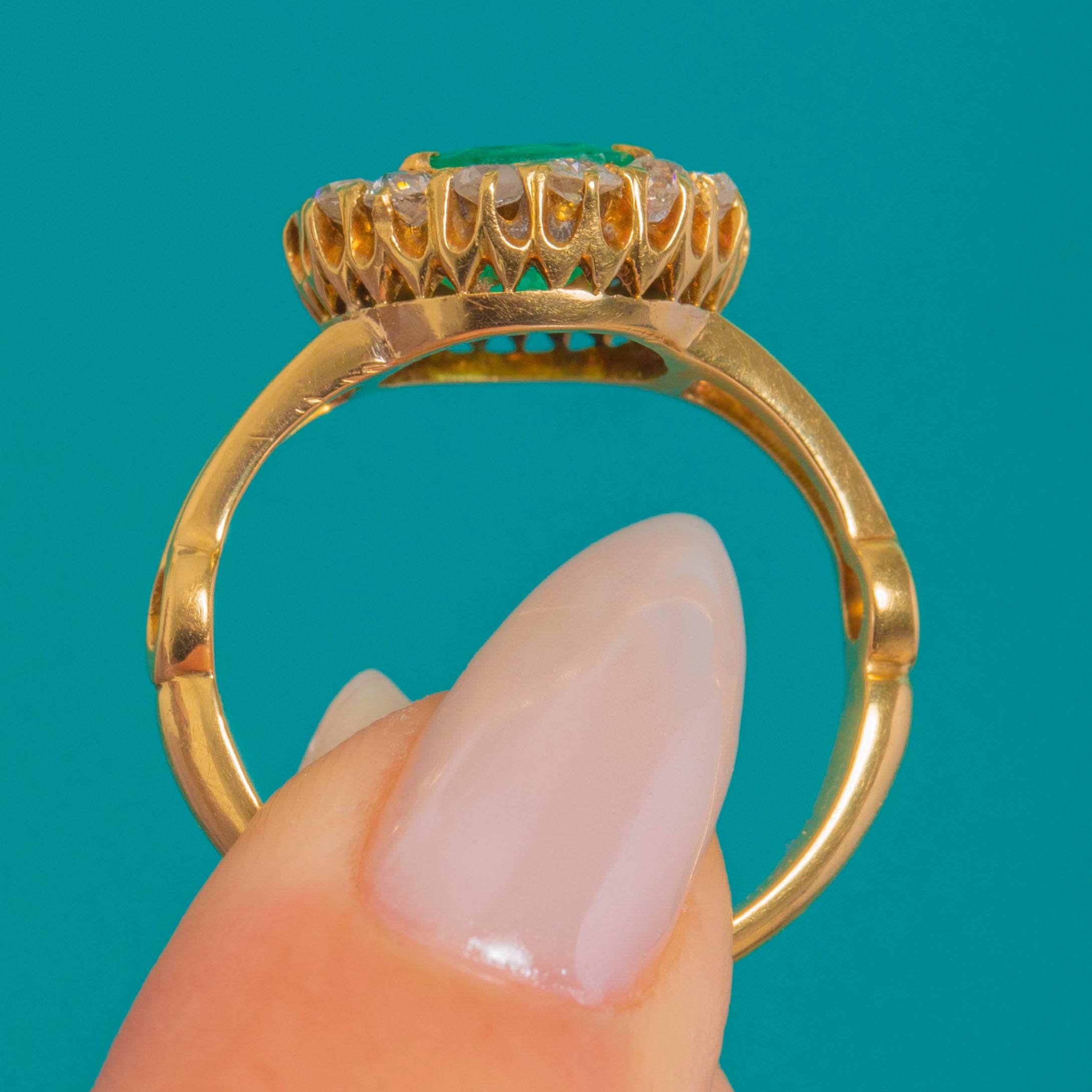A wonderfully romantic Victorian cluster ring, starring a vivid Emerald framed by a sparkling halo of old-cut Diamonds. It’s the kind of piece that feels instantly special on the hand – bold in colour, classic in silhouette, and endlessly wearable.