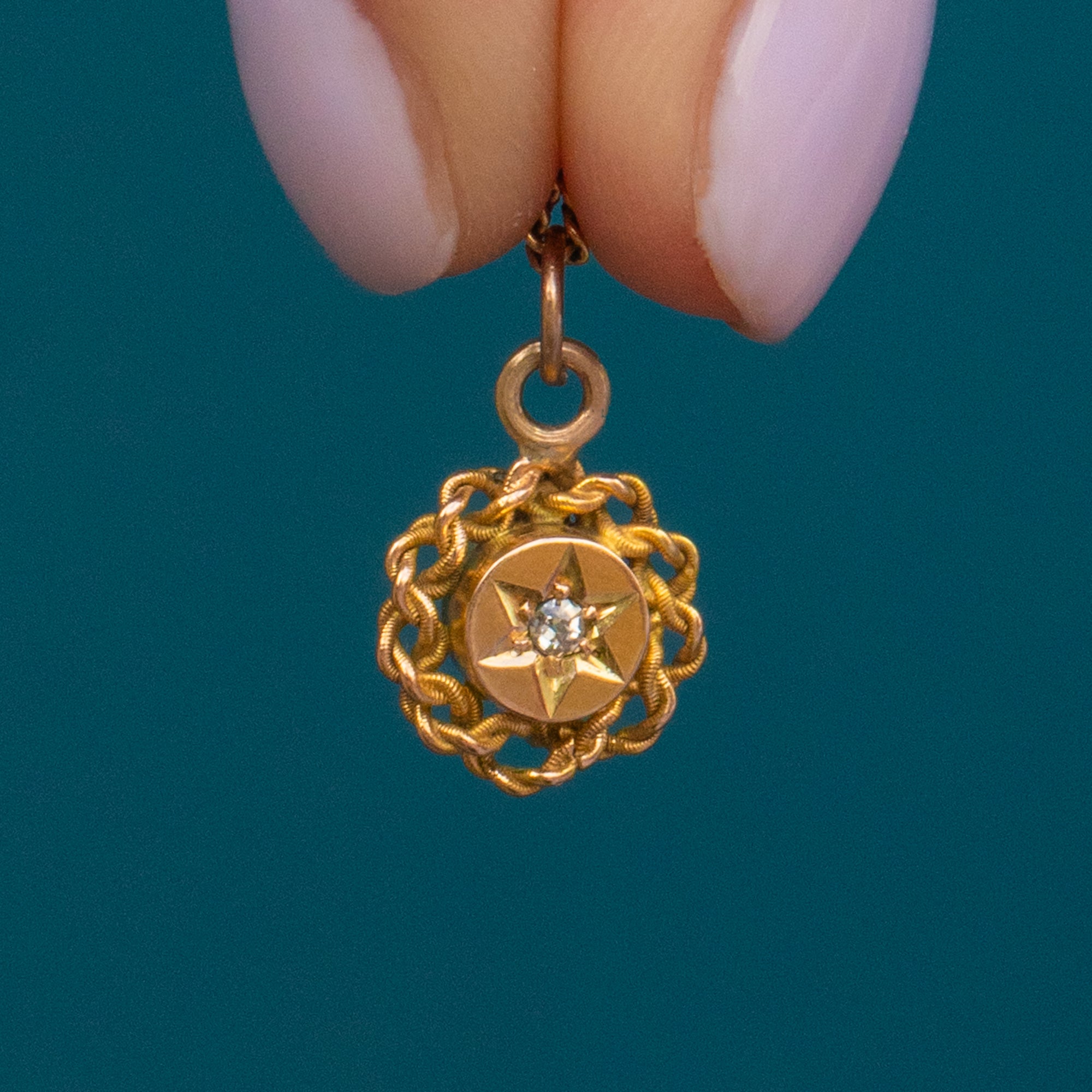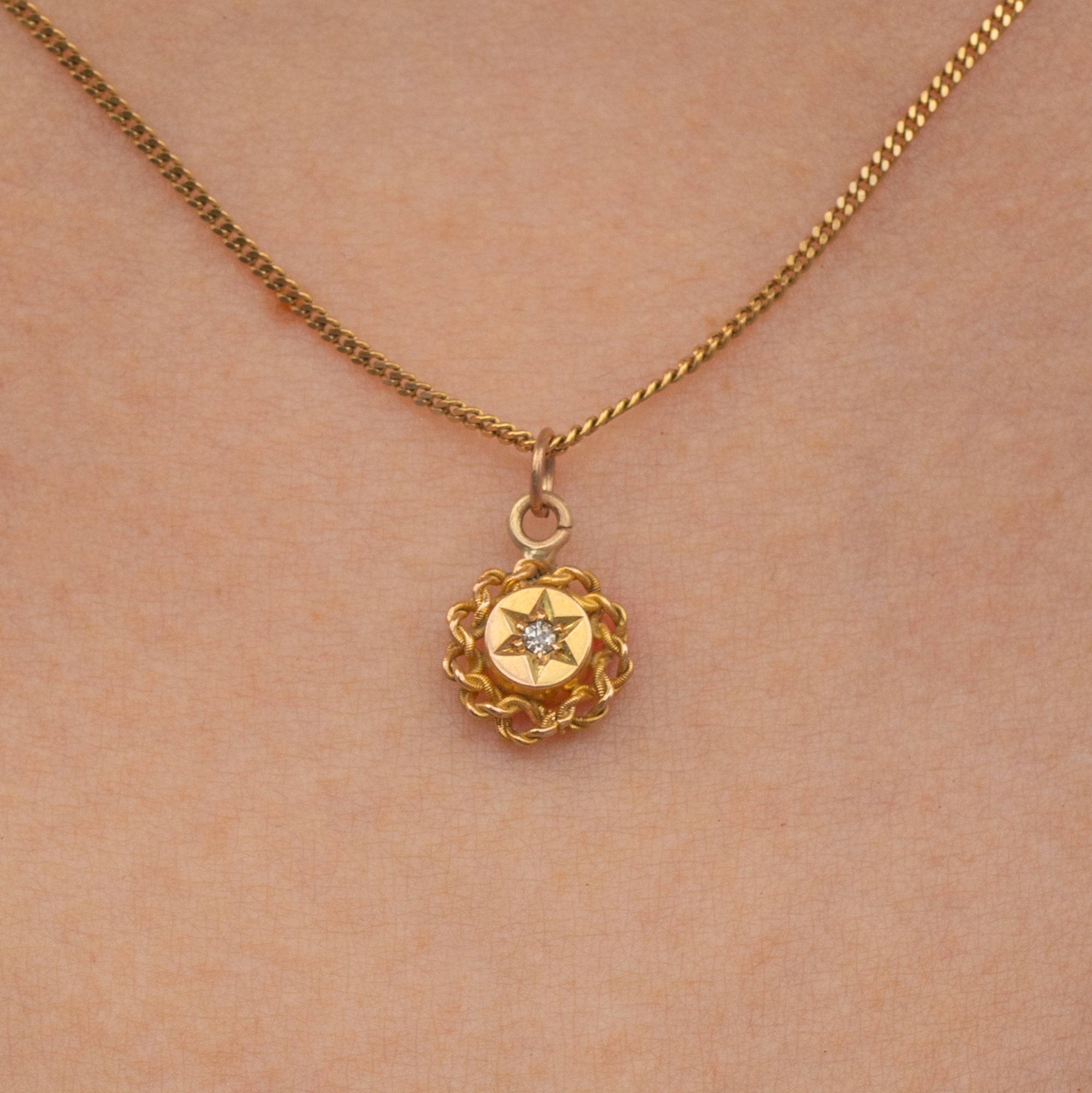 VERY GOOD. This antique 15ct Gold Etruscan round Diamond charm is in very good condition. The Diamond is secure within its setting with no damage to note. The rope details are in impeccable condition and the 15ct Gold has a richly saturated hue throughout. There is some wear on the back of the pendant from her stick pin conversion, however her fineness stamp has remained crisp. With a soldered jump-ring, you can wear it with the utmost confidence!