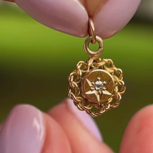 This Victorian 15ct Gold Diamond Etruscan charm will throw some undeniable antique character into your repertoire! The plaited rope border and star settings are what make this antique charm the epitome of Etruscan revival, crafted entirely from buttery 15ct Gold.