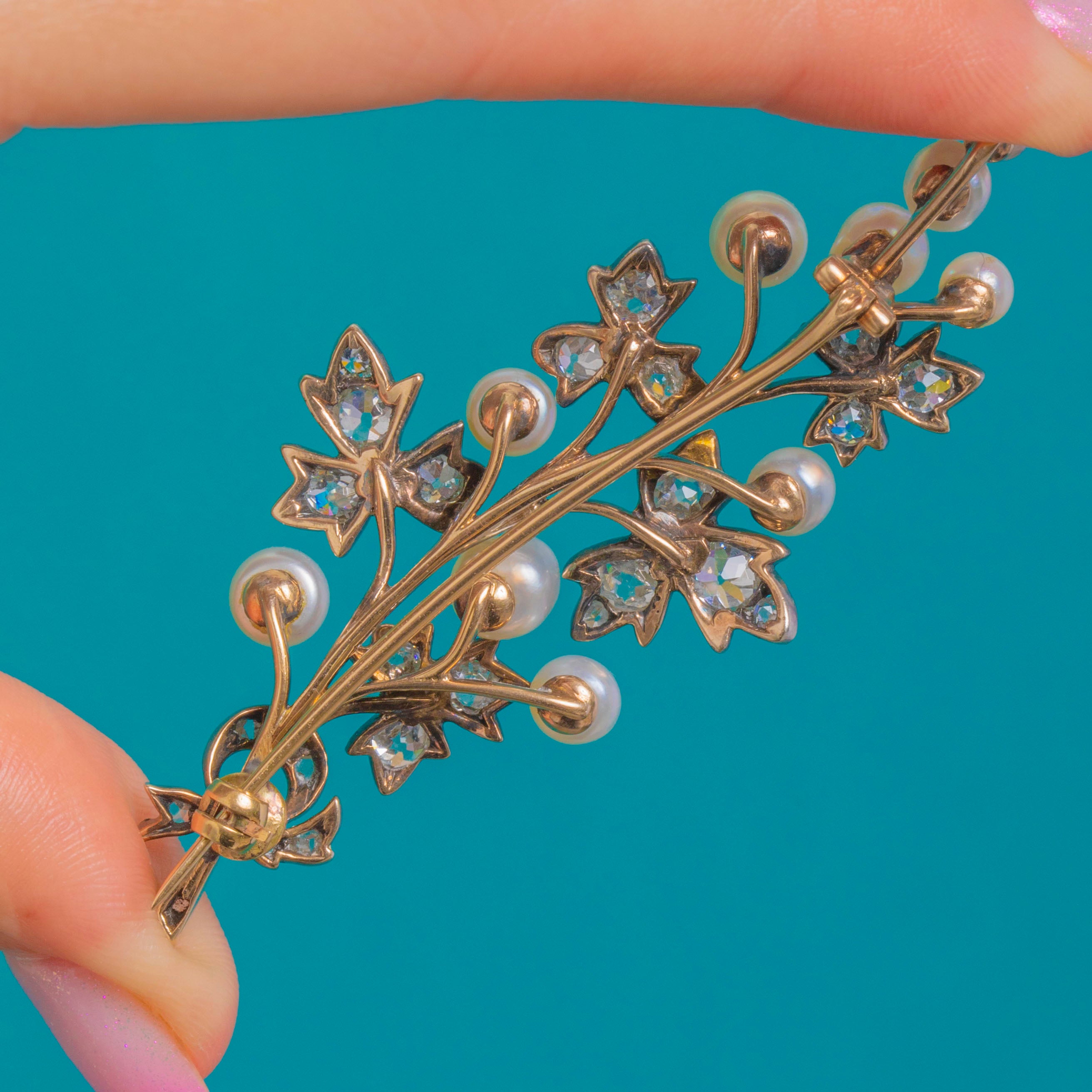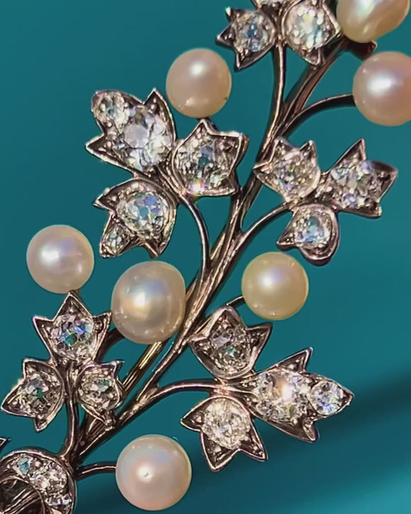 気品あふれるVictorian時代の植物モチーフブローチ。濃密な十五金を用い、銀で覆われた台座に手作業で仕立てられています。瑞々しい葉には無数のダイヤモンドが星のように煌めき、乳白色の天然真珠が朝露をまとった果実のように優雅な細い茎に寄り添います。銀と金の洗練された色調が軽やかで明るい印象を与え、細部の美しさを一層引き立てます。