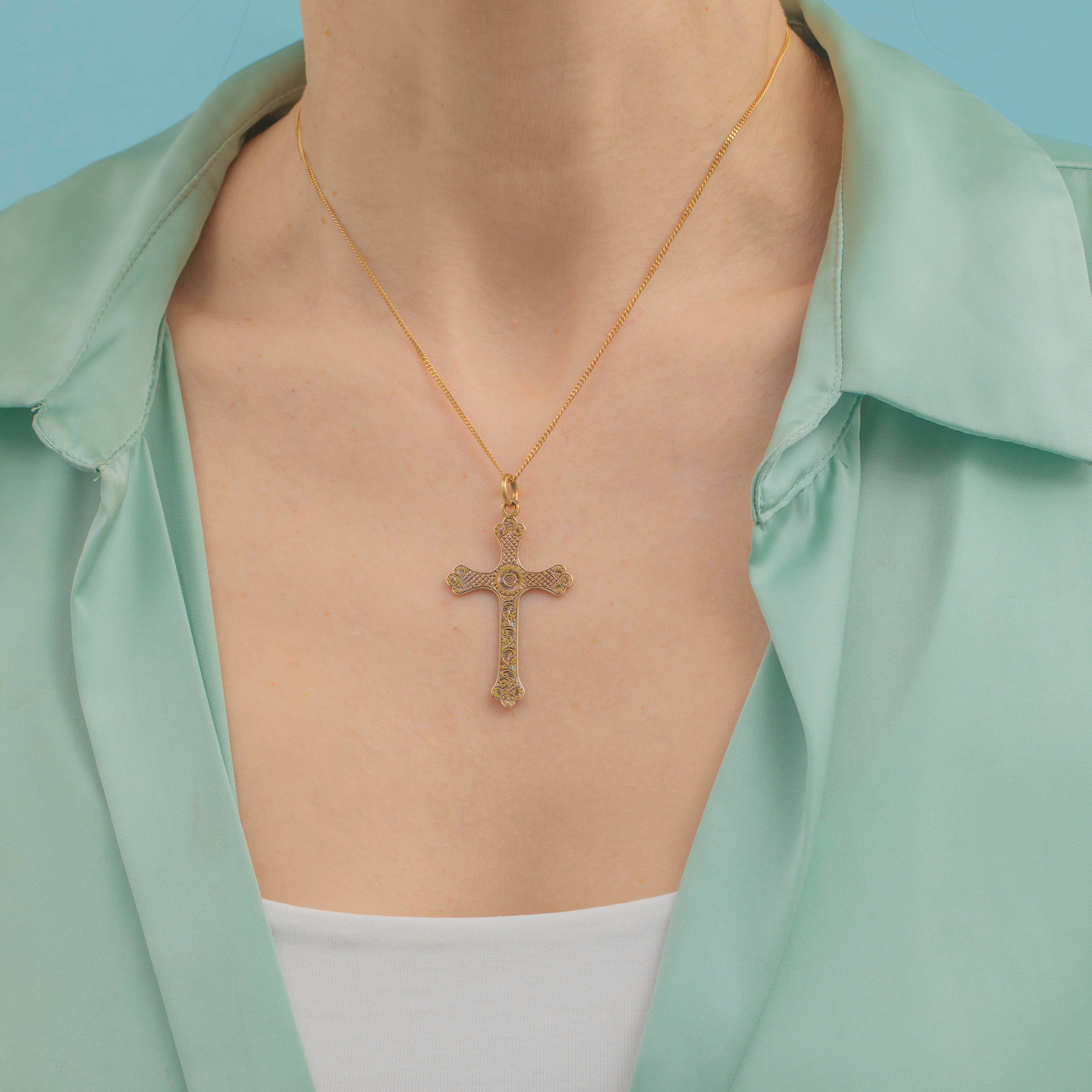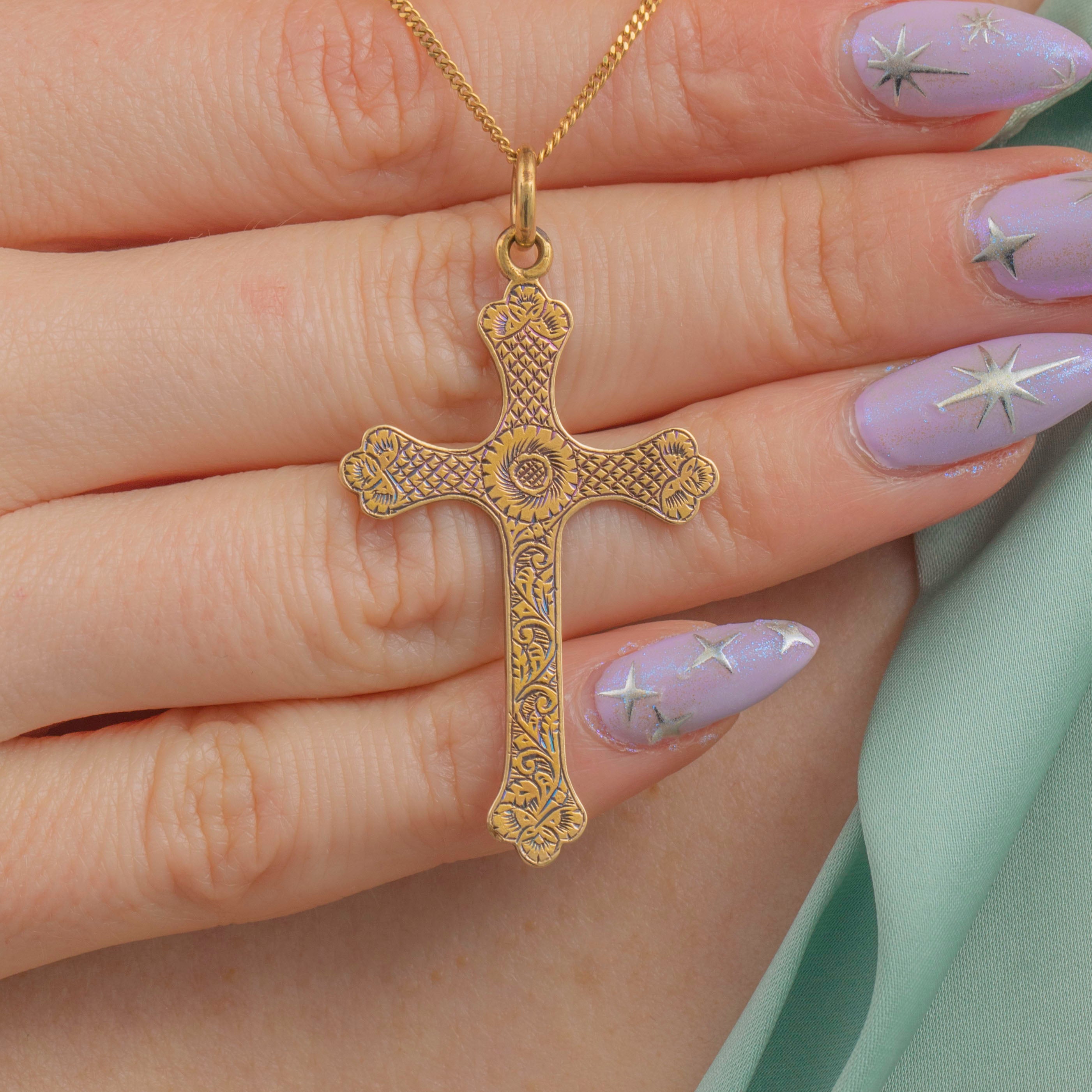 EXCELLENT. This Victorian 15ct Gold cross pendant is in excellent condition. The engravings are gorgeous on both sides and the piece has aged beautifully.