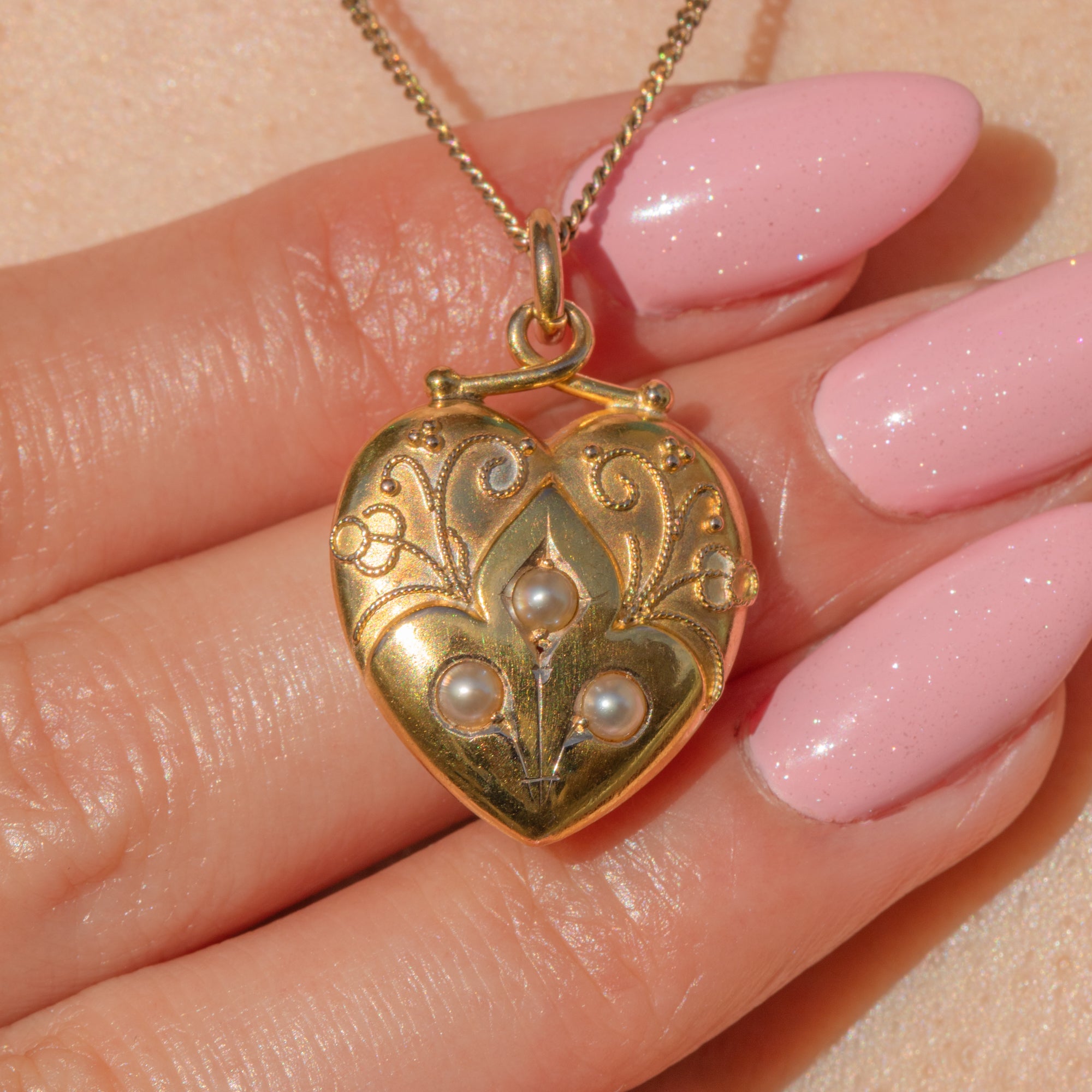 VERY GOOD-EXCELLENT: This Victorian 15ct Gold fancy Pearl heart pendant is in wonderful antique condition. The Gold is luminous and the cannetille work is fully intact. There is some general mild surface wear to the Gold, commensurate with age, but this is only noticeable under close inspection. The Pearls have a gorgeous soft pink glow and are securely set, with no wear to their nacre. The locket compartment is snug fitting so you can use it with confidence!