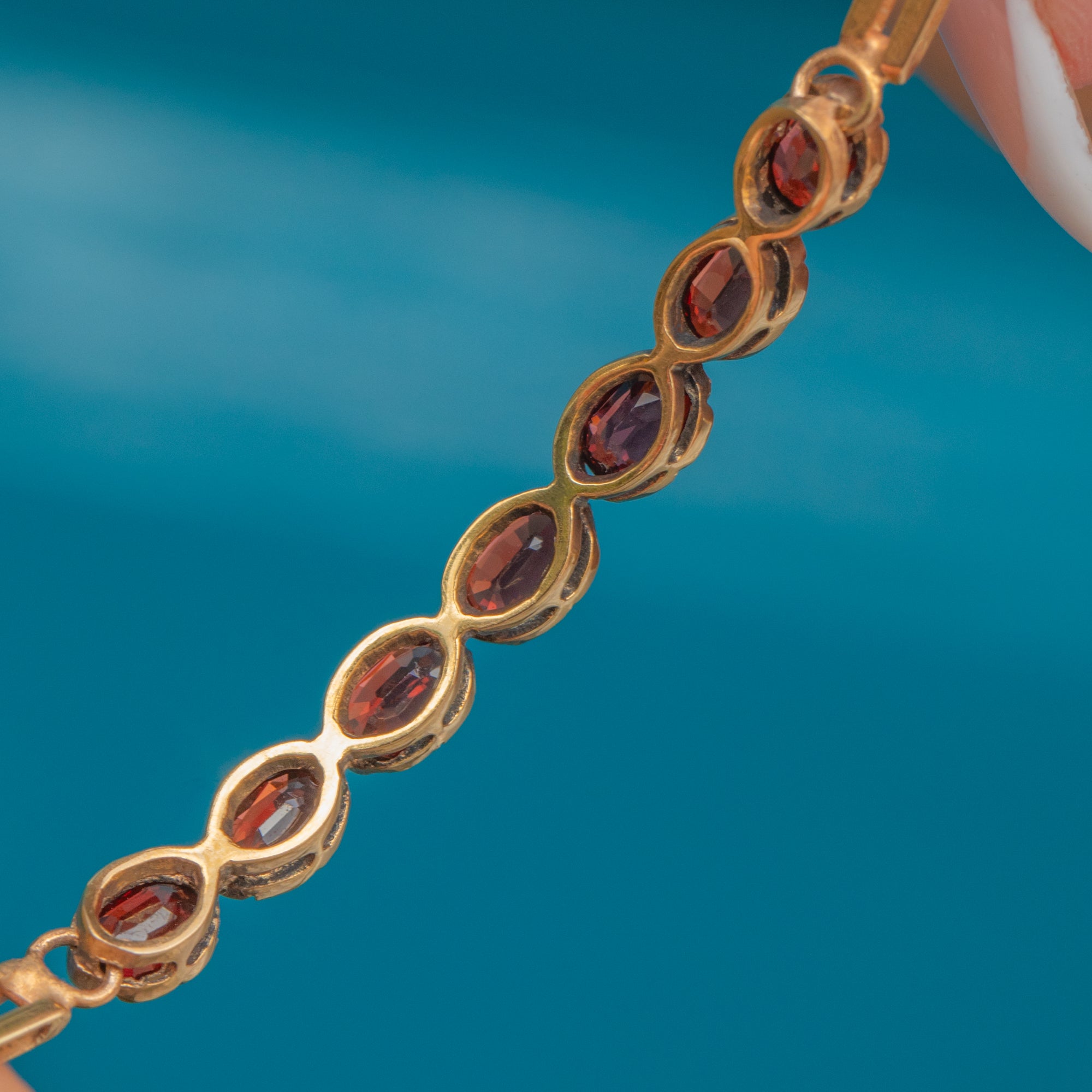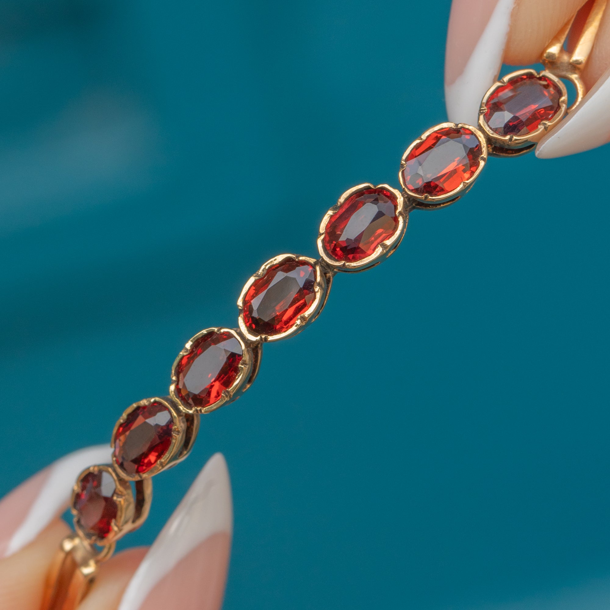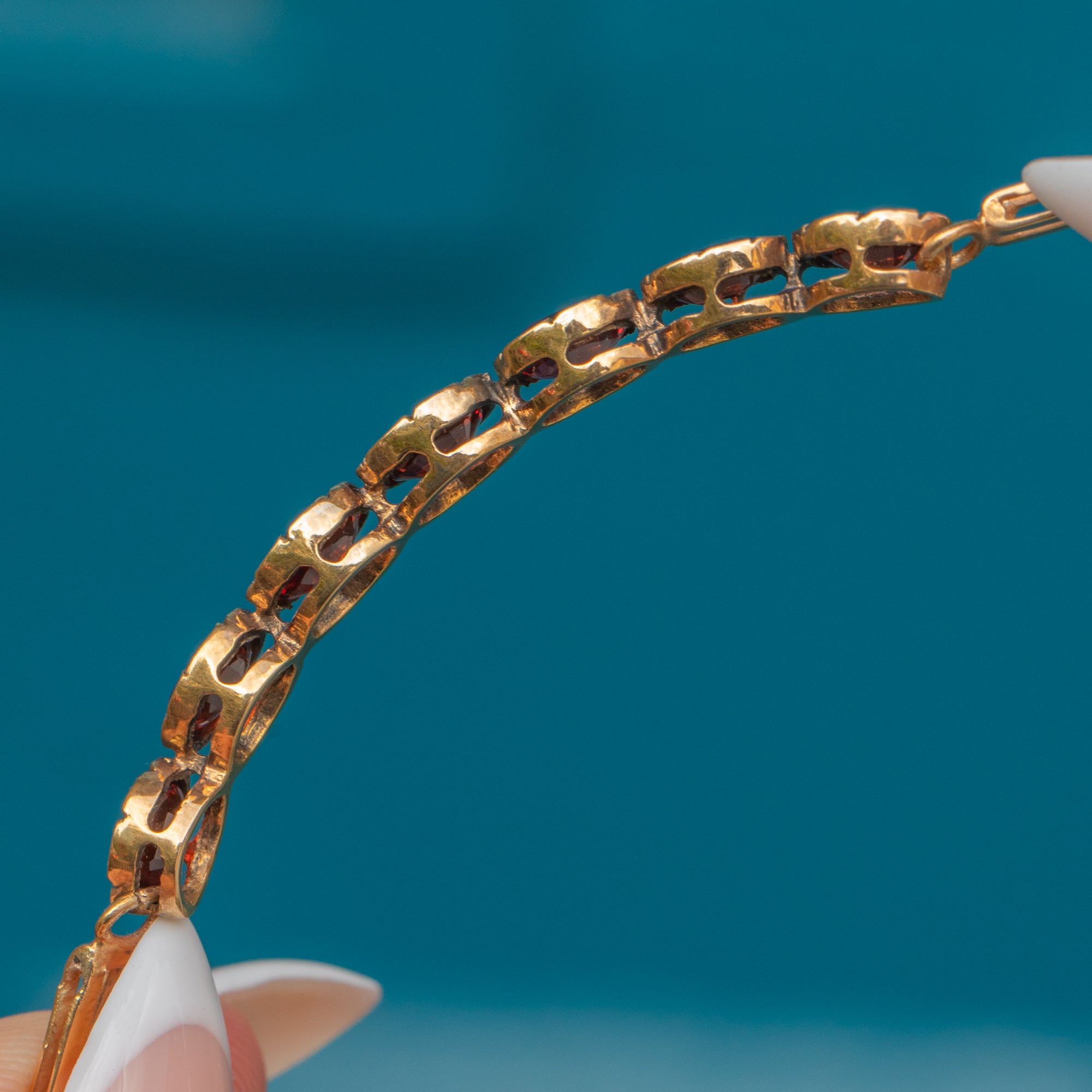 This Victorian bracelet is crafted in 15ct Gold and set with seven glowing Garnets. The stones, with their deep claret hue, are oval faceted and mounted in scalloped collet settings that catch the light beautifully.