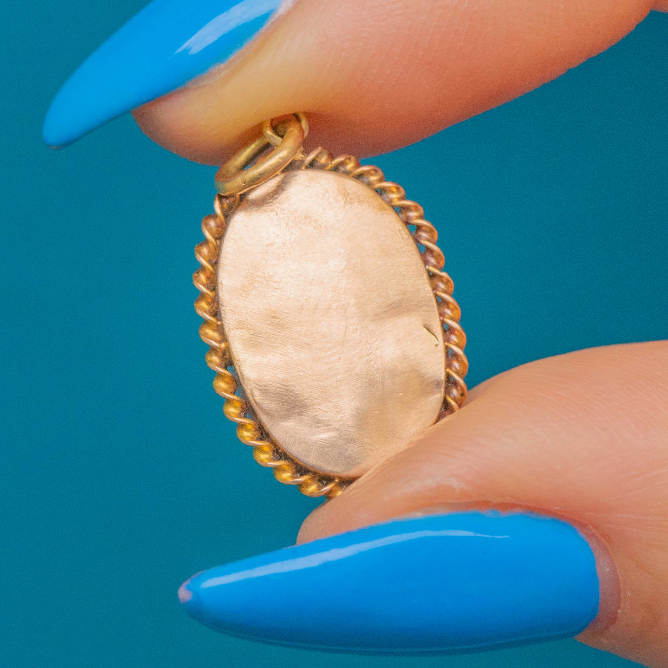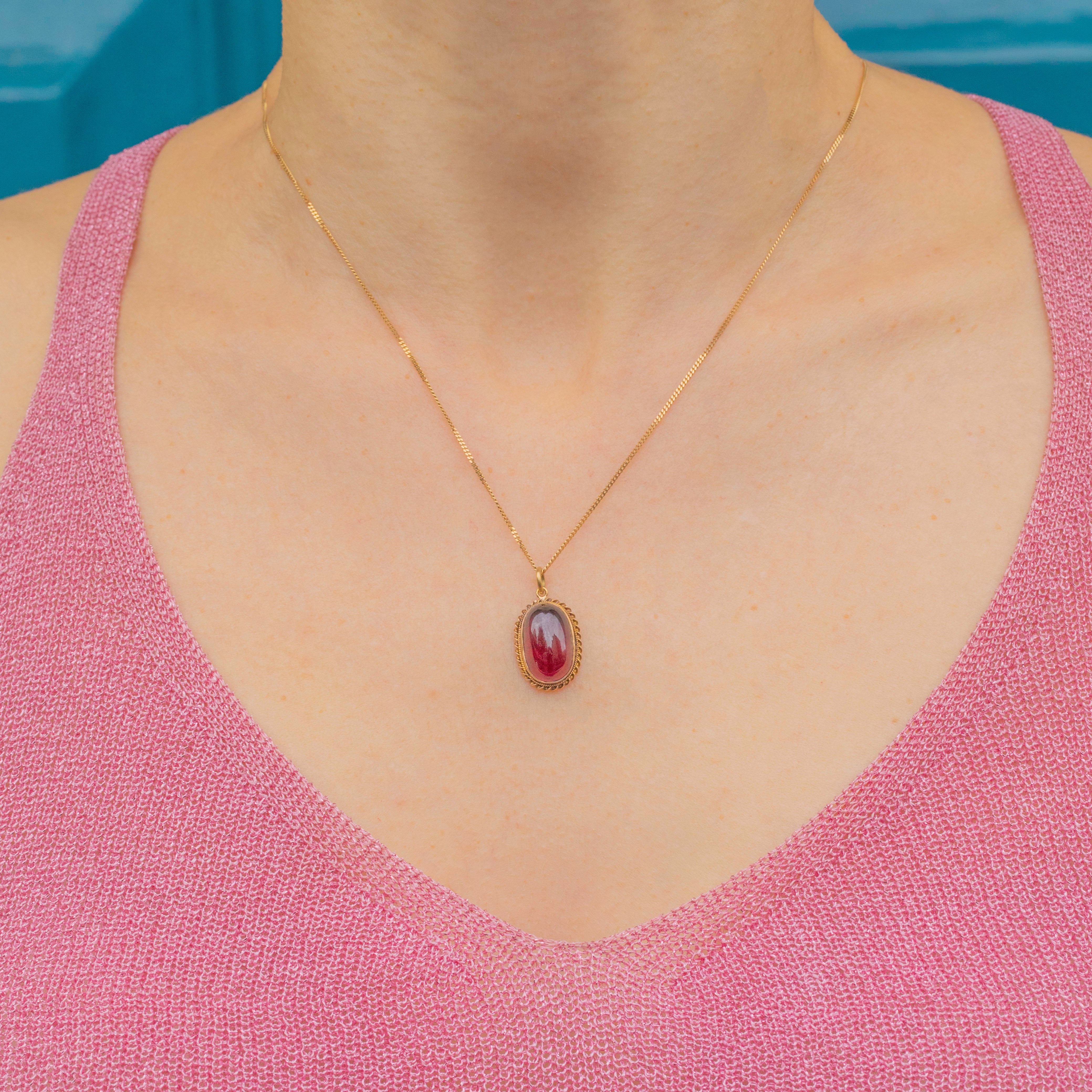 VERY GOOD. This Victorian 15ct Gold Garnet cabochon pendant is in very good condition. Her Garnet cabochon sits securely in a Gold bezel, boasting a wonderful domed profile and fiery rouge hues. We adore the chunky twisted rope border, giving her bundles of Victorian charm. There are a few minor dings on the back of the pendant, however, this can't be seen when worn so takes nothing away from her beauty. Her 9ct Gold closed back is glossy and smooth to the touch.