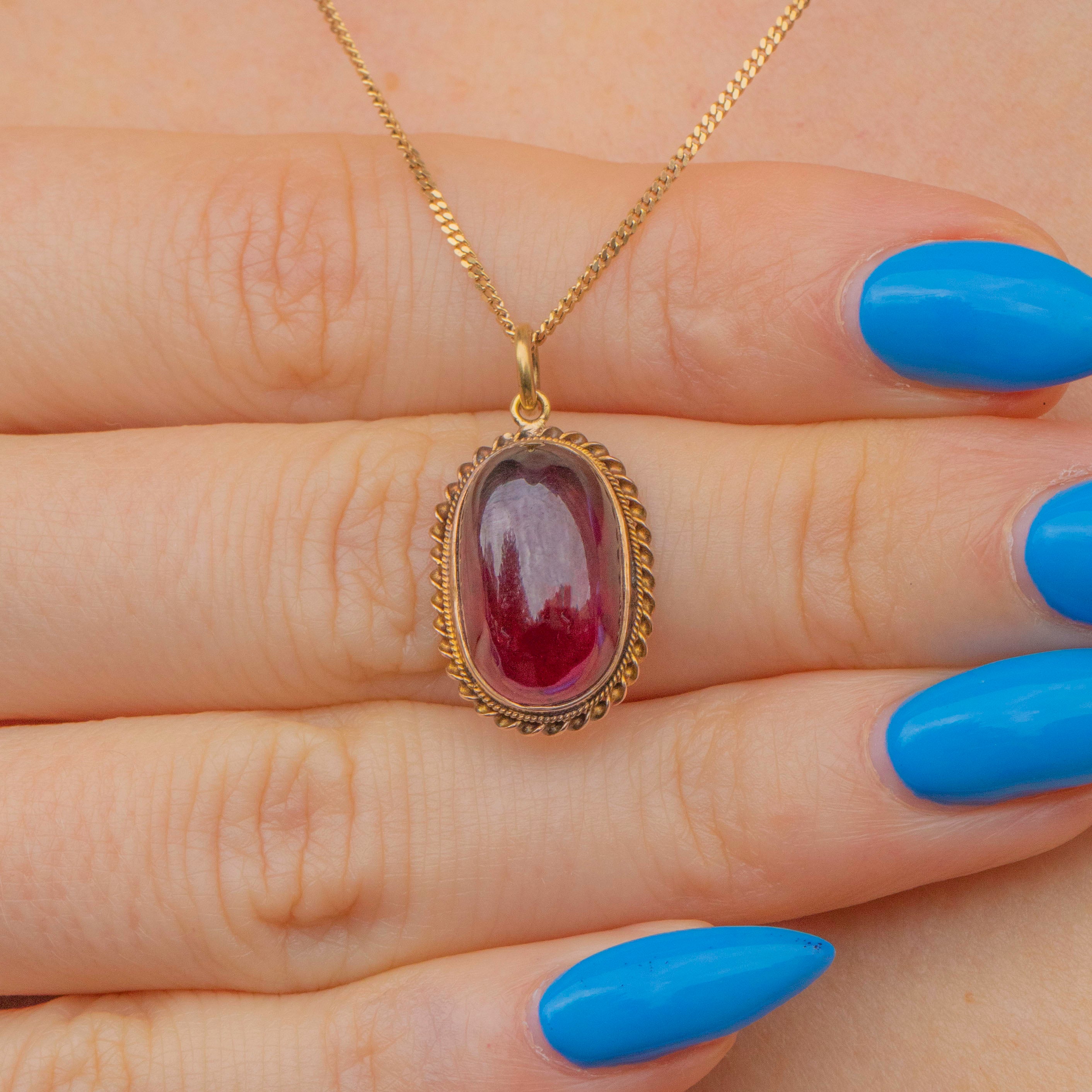 If you are looking for a pendant that packs a punch, then look no further than this Victorian 15ct Gold Garnet cabochon pendant! The smoothly cut 5.95ct Garnet boasts a delicious dark merlot red with flashes of crimson as the light hits.