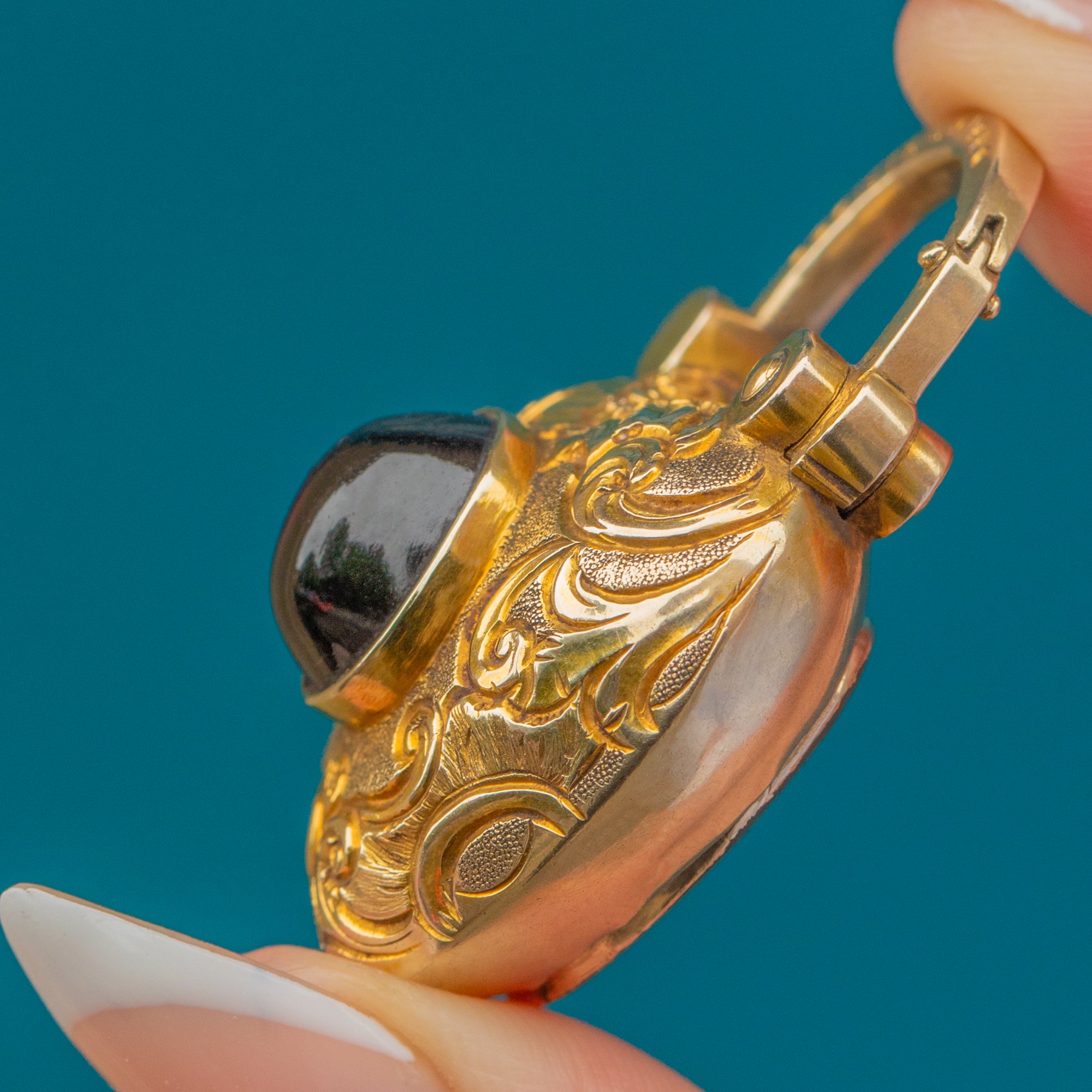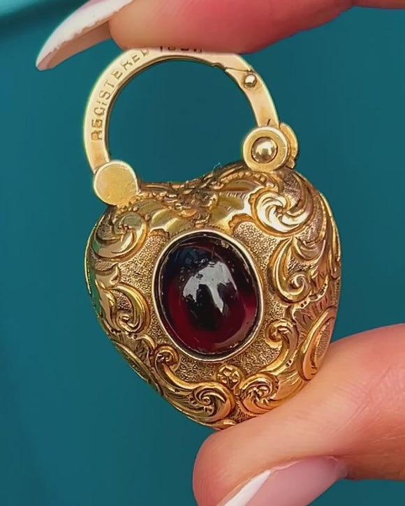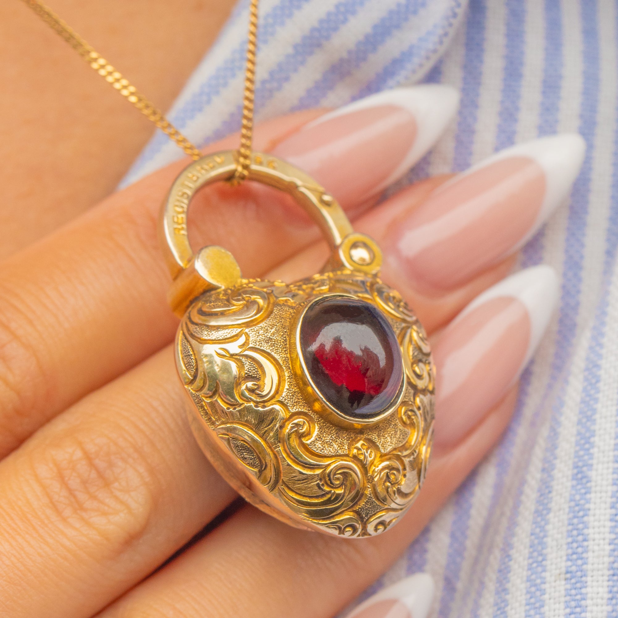 This antique heart padlock is as romantic as it is practical, a perfect symbol of everlasting love. Crafted in richly hued 15ct Gold, the padlock is adorned with ornate chased scrollwork and set with a glowing 1.62ct Garnet cabochon, displaying a deep, juicy hue that shimmers when it catches the light.