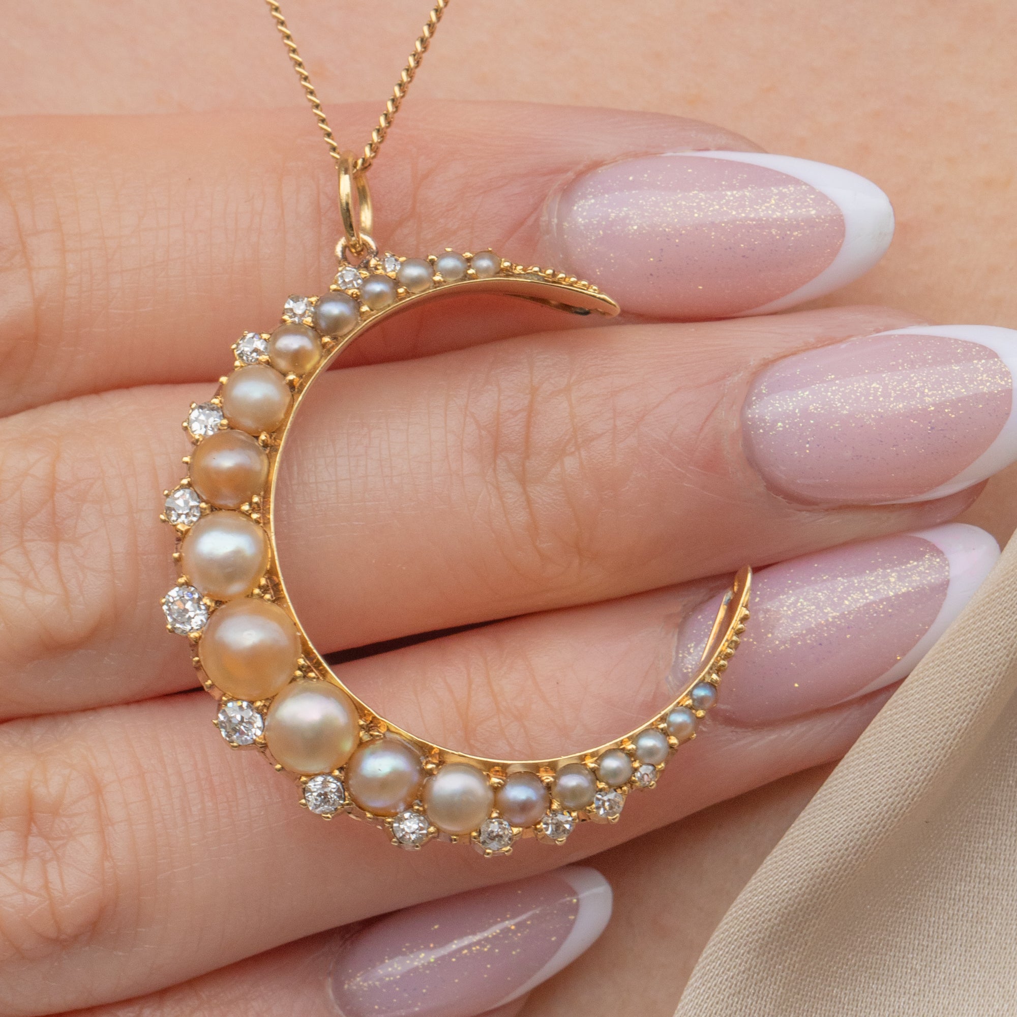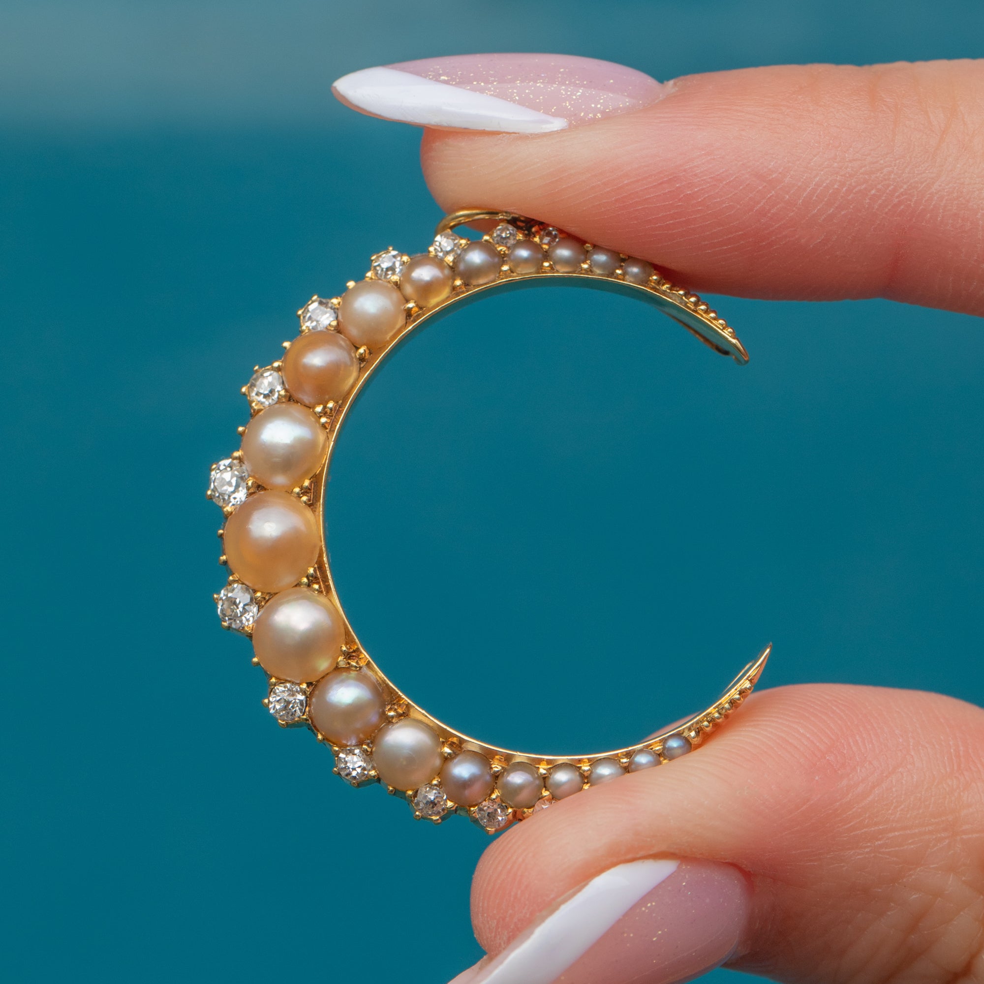 Rich in splendour, this Victorian 15ct Gold Pearl & Diamond crescent moon pendant will make a standout addition to your antique jewellery collection! Crafted from rare and saturated 15ct Gold, the striking crescent moon form is inlaid with champagne-hued Pearls and a sprinkling of scintillating Diamonds.