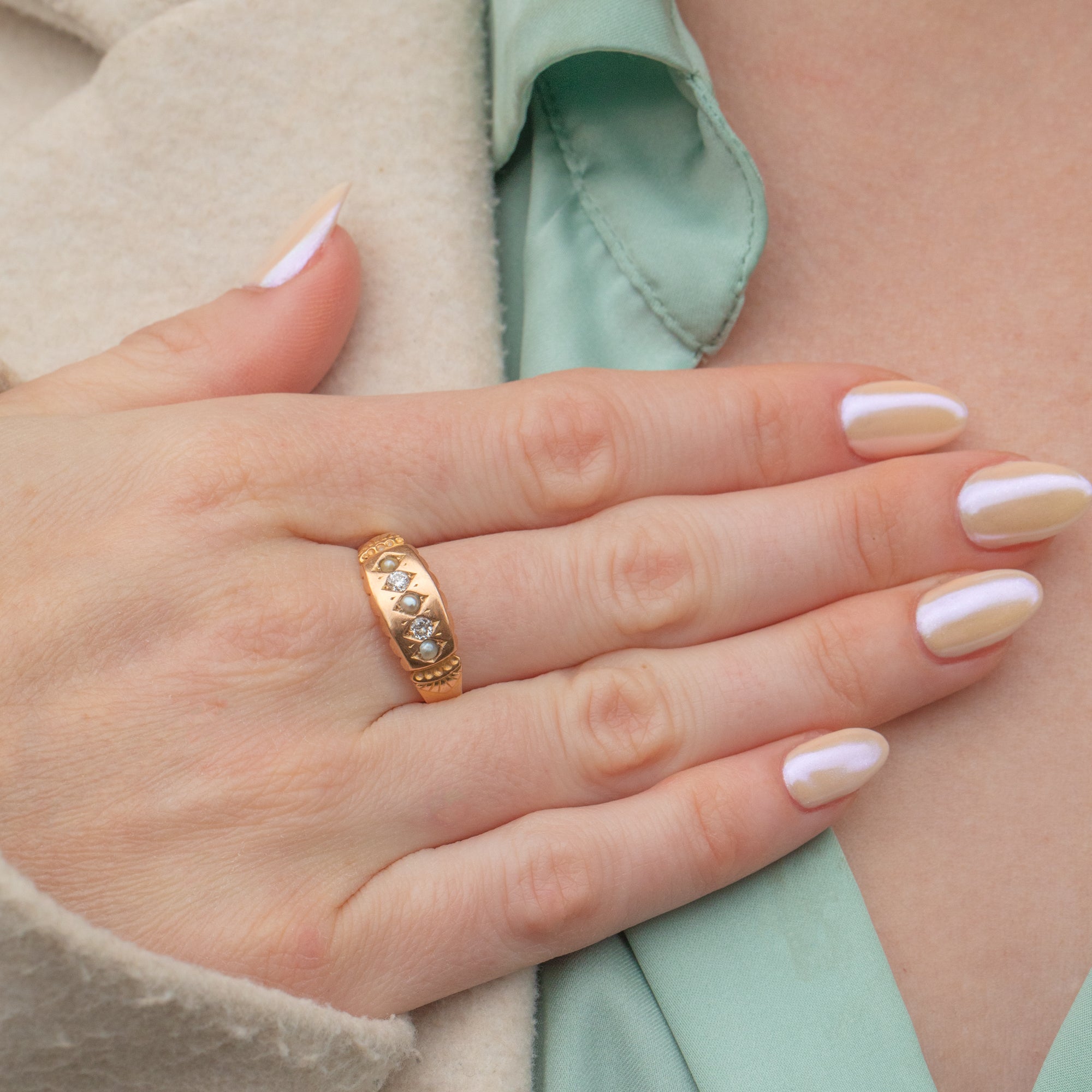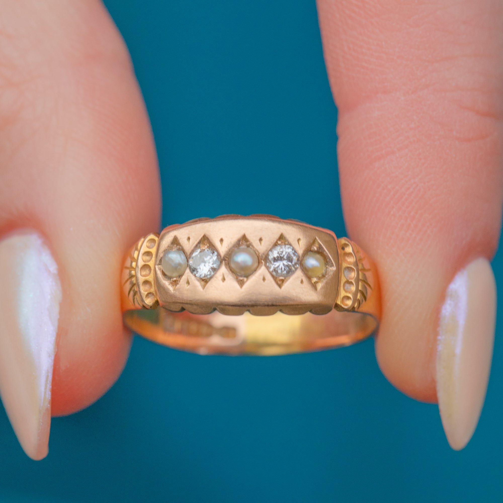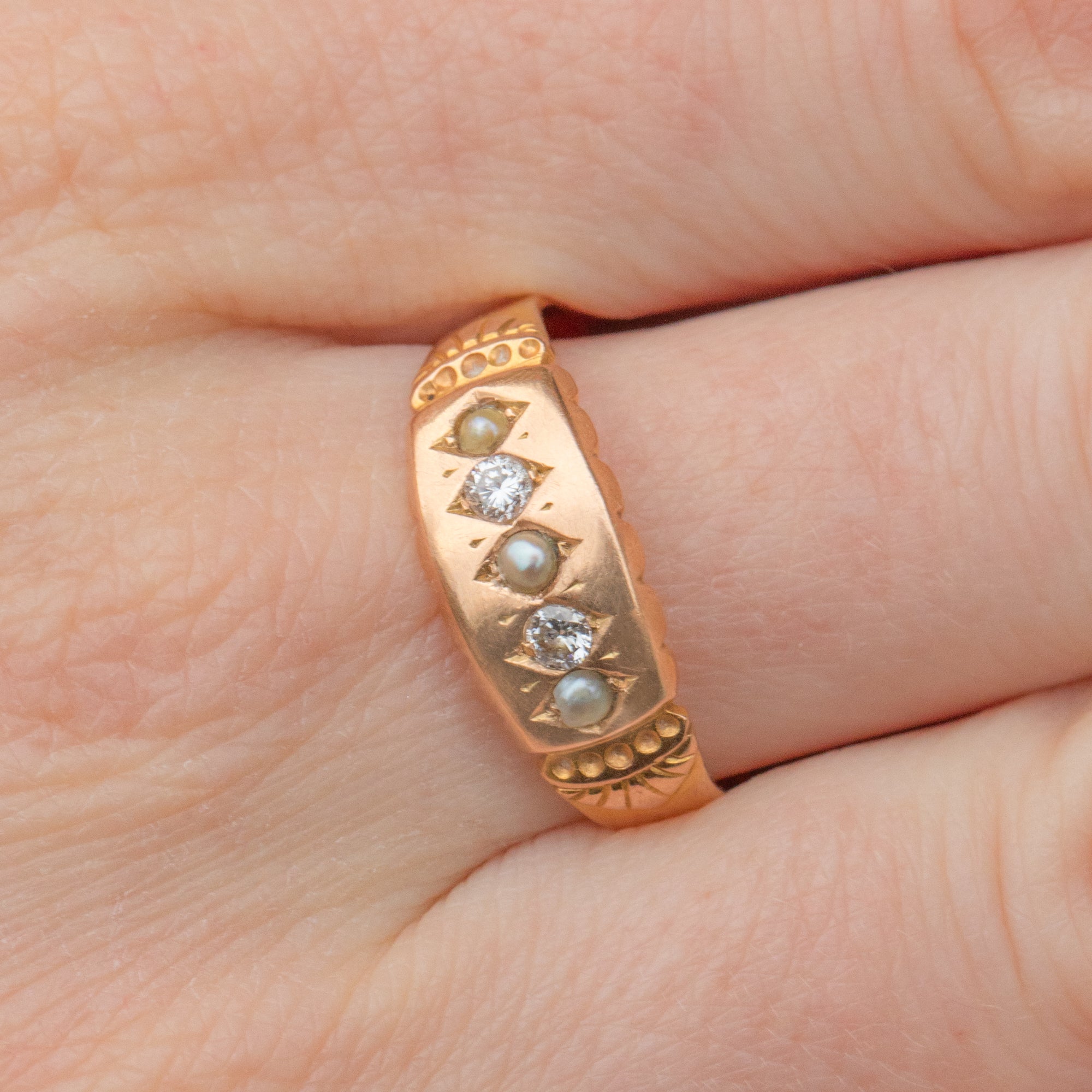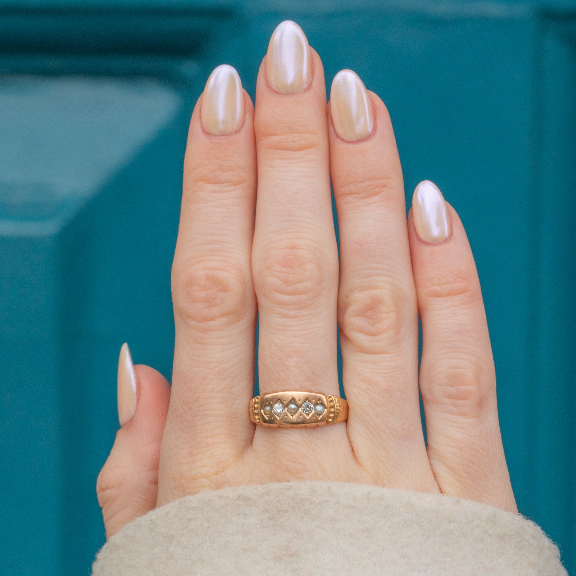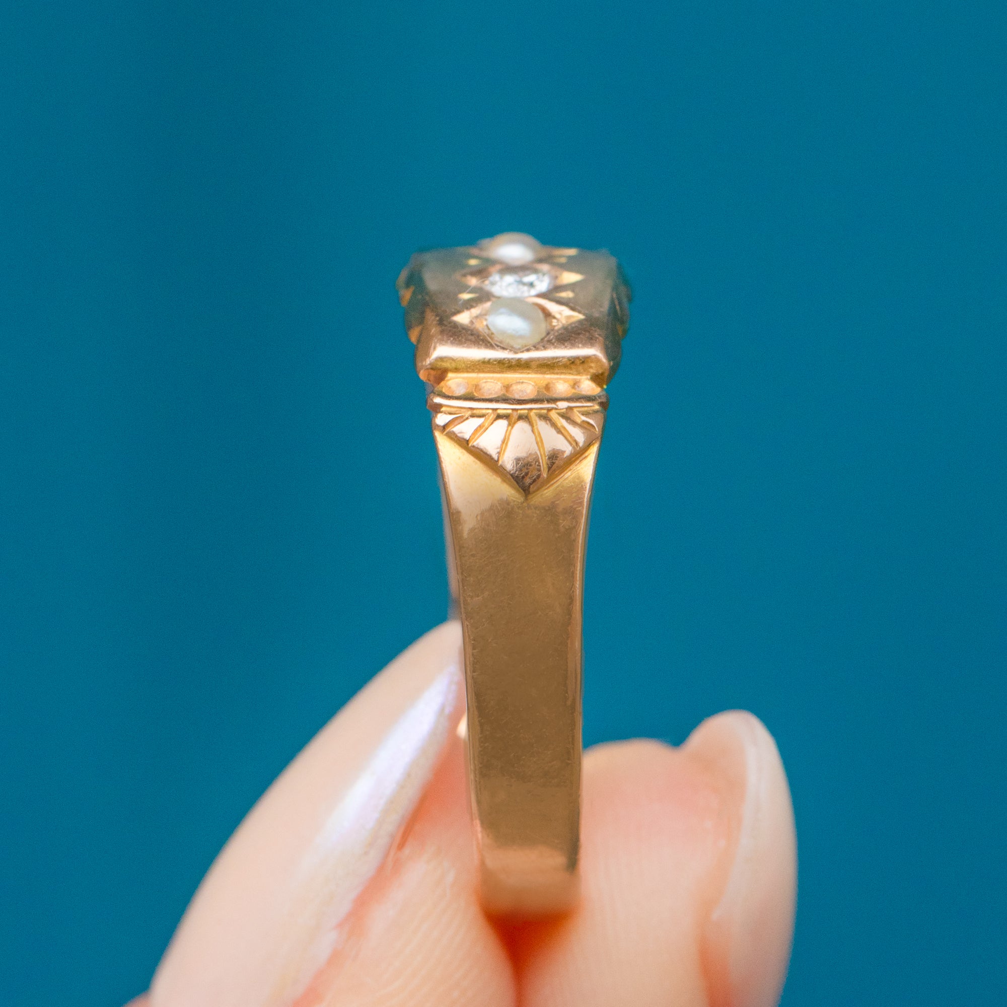Victorian 15ct Gold Pearl Diamond Gypsy Ring, c.1864