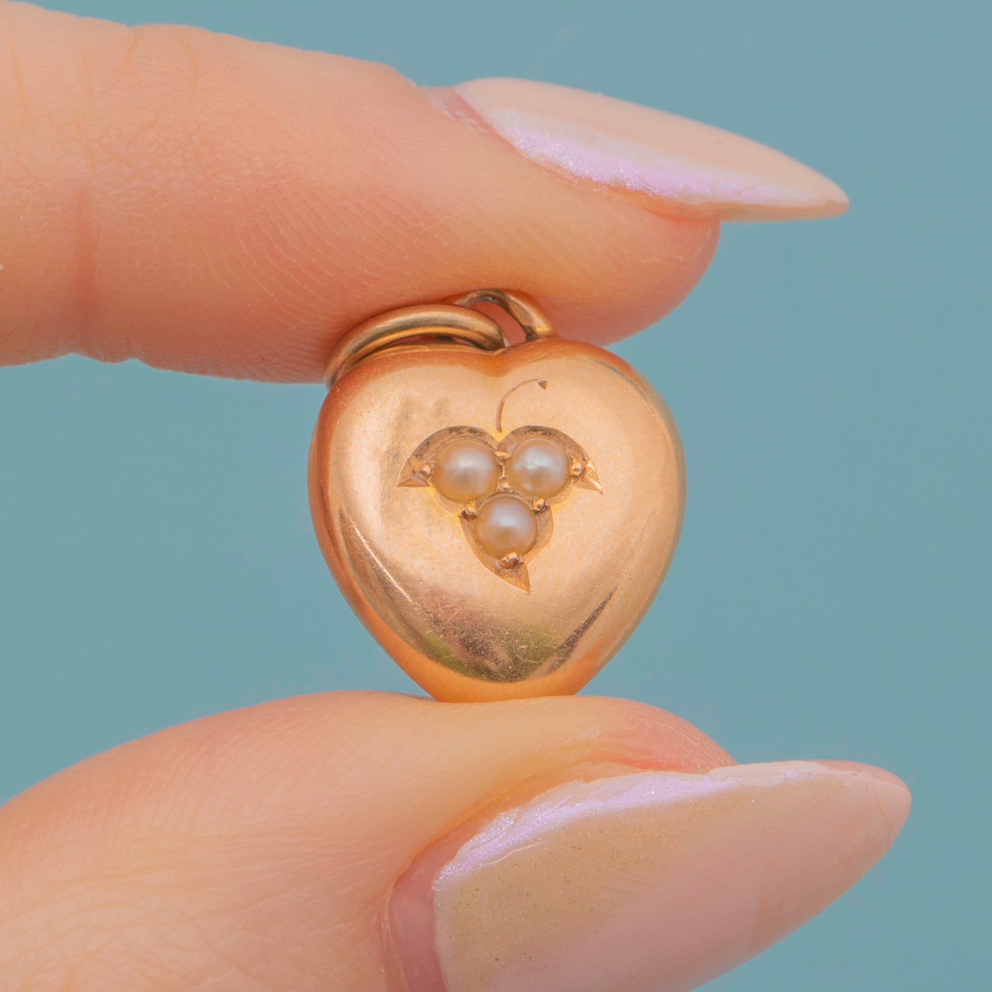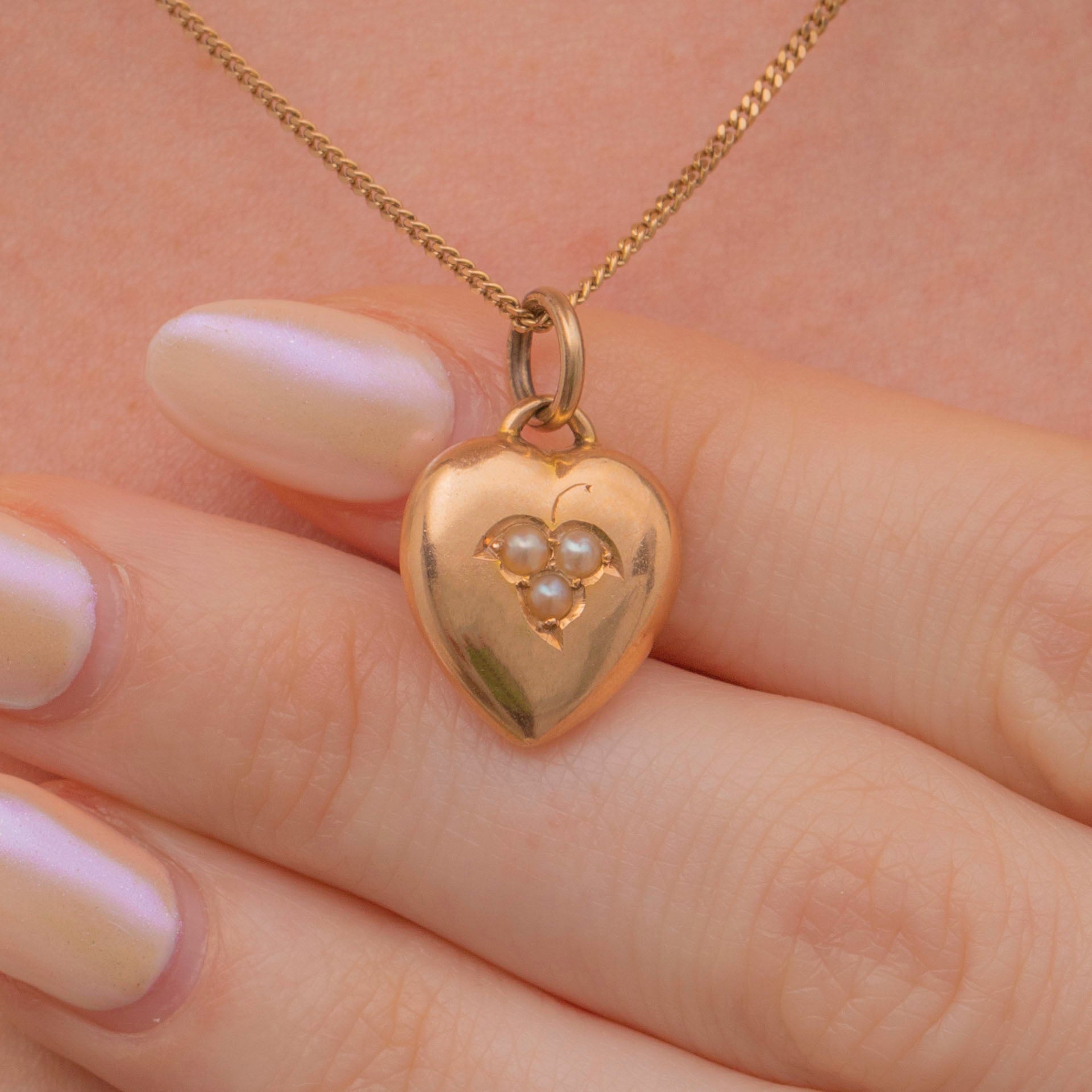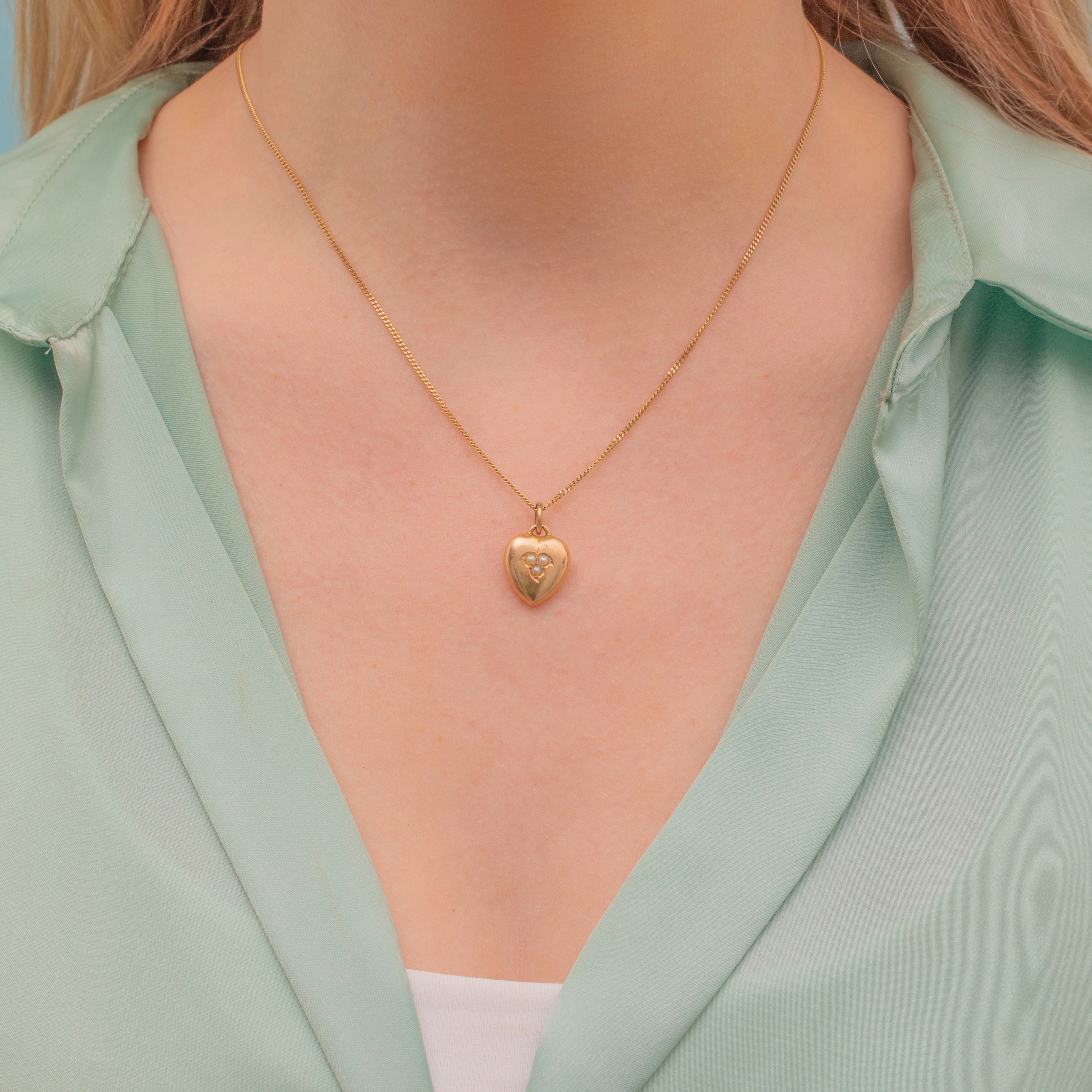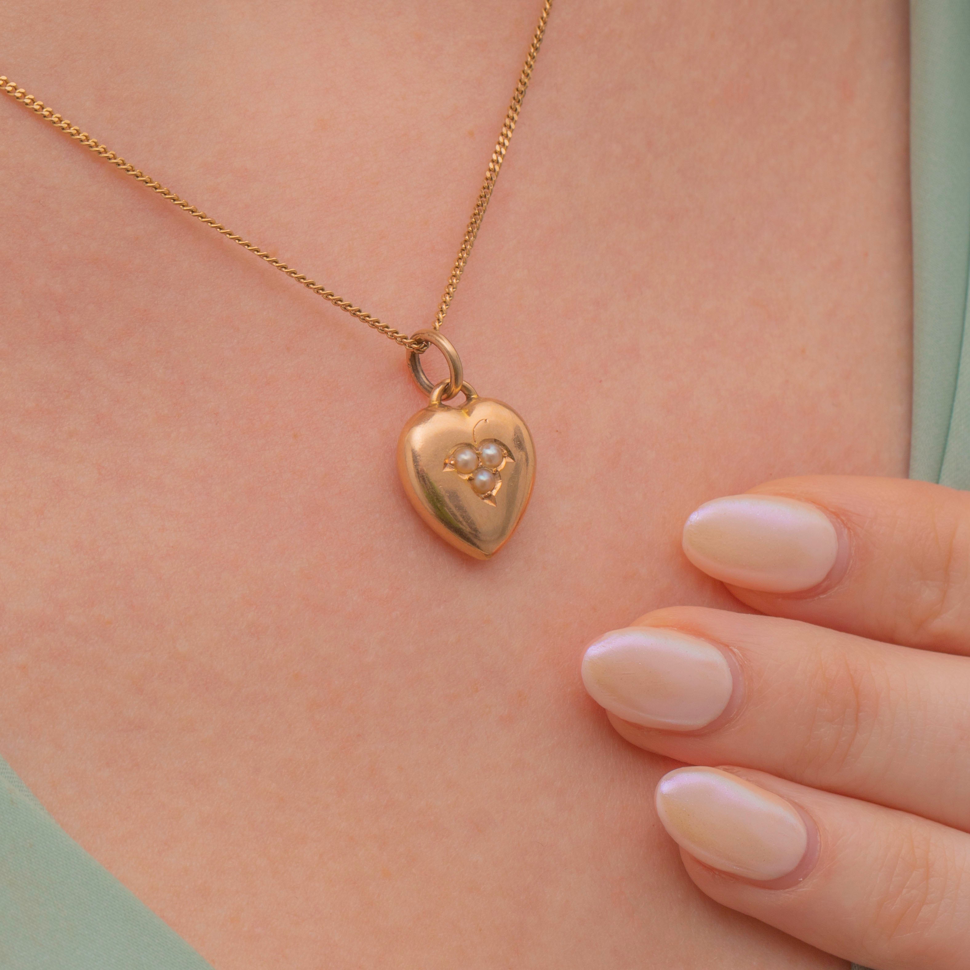 EXCELLENT. A wonderful Victorian 15ct Gold Pearl puffy heart pendant in excellent condition! The Gold is smooth, has a great shine and a soft pale rose tone. The Pearls are nestled snugly and secure within its setting, so you can wear this piece with the utmost confidence!