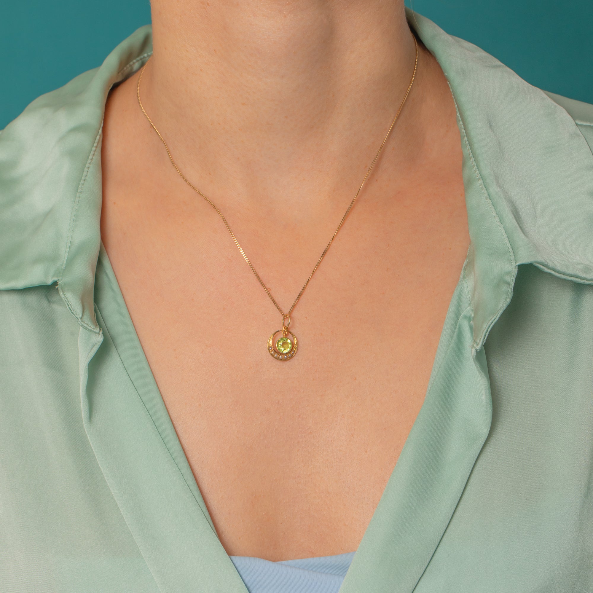 EXCELLENT: The Peridot is bright and lively with no visible wear. The Pearls are well-matched and securely set. The Gold shows only the lightest signs of age, beautifully preserved throughout.