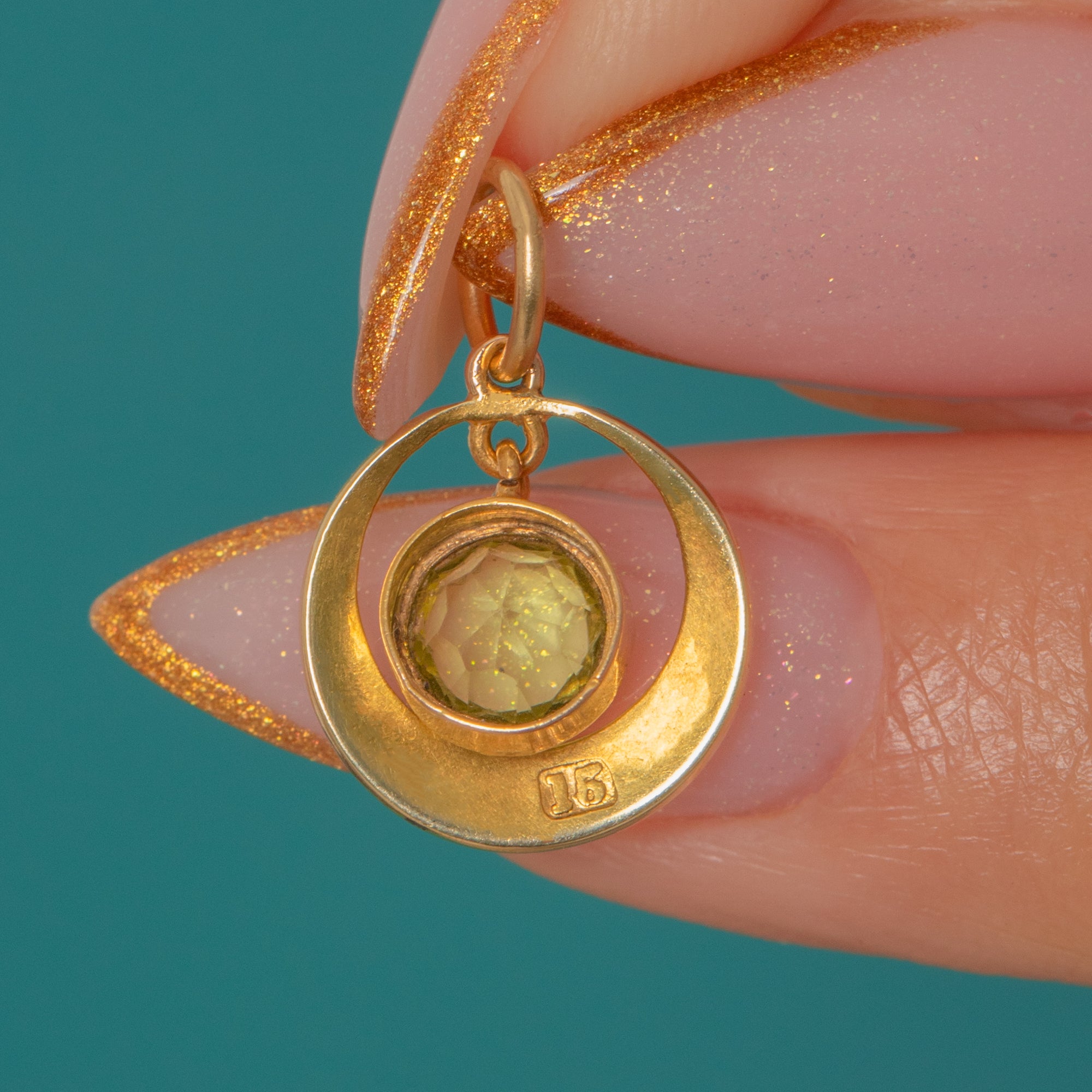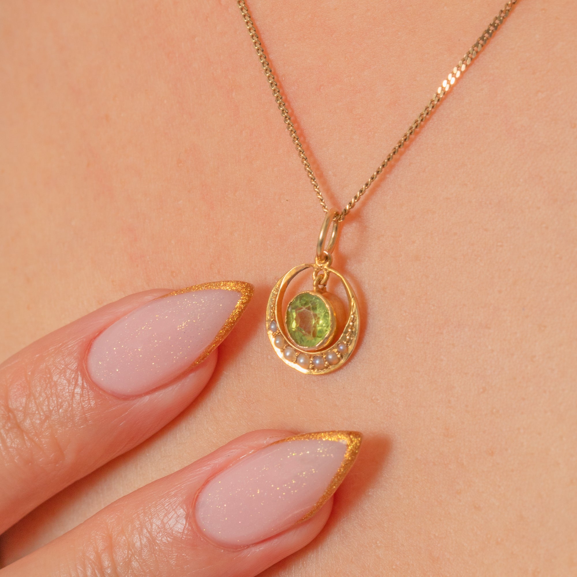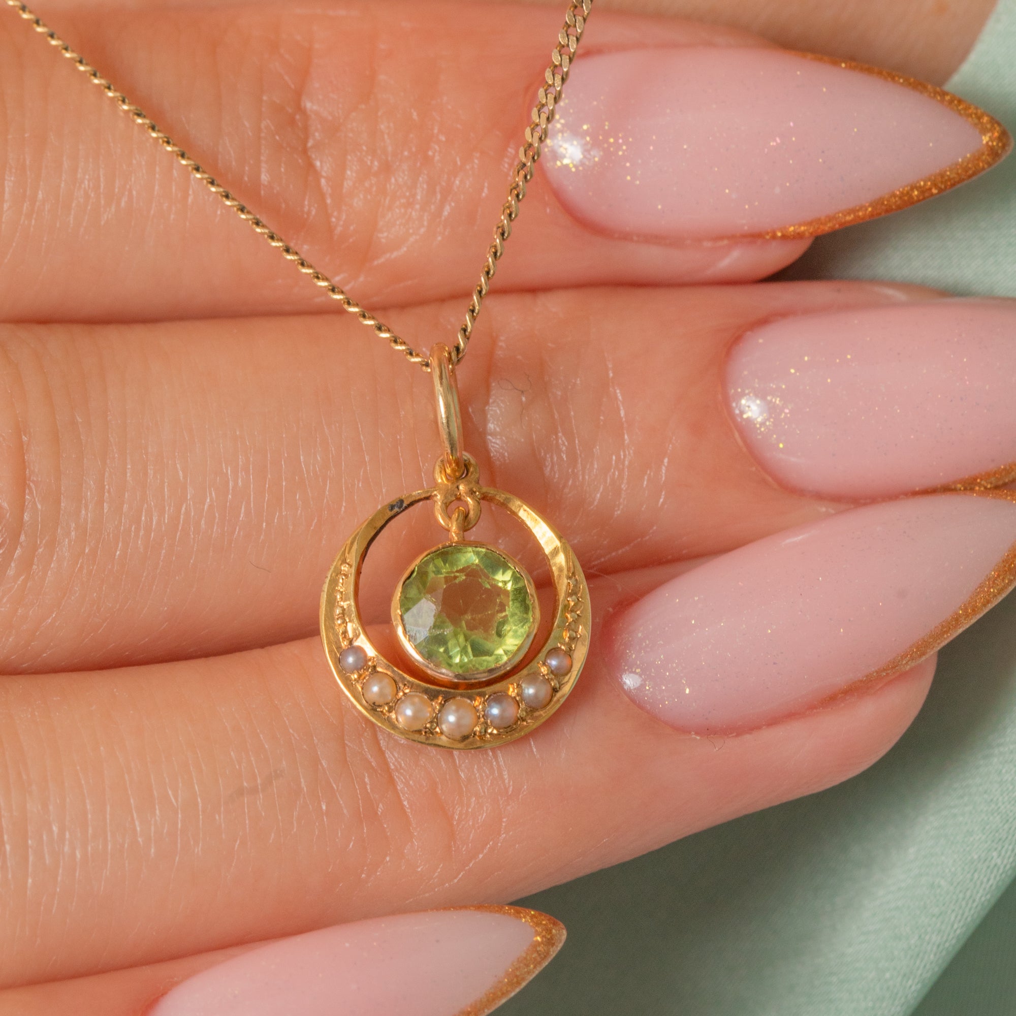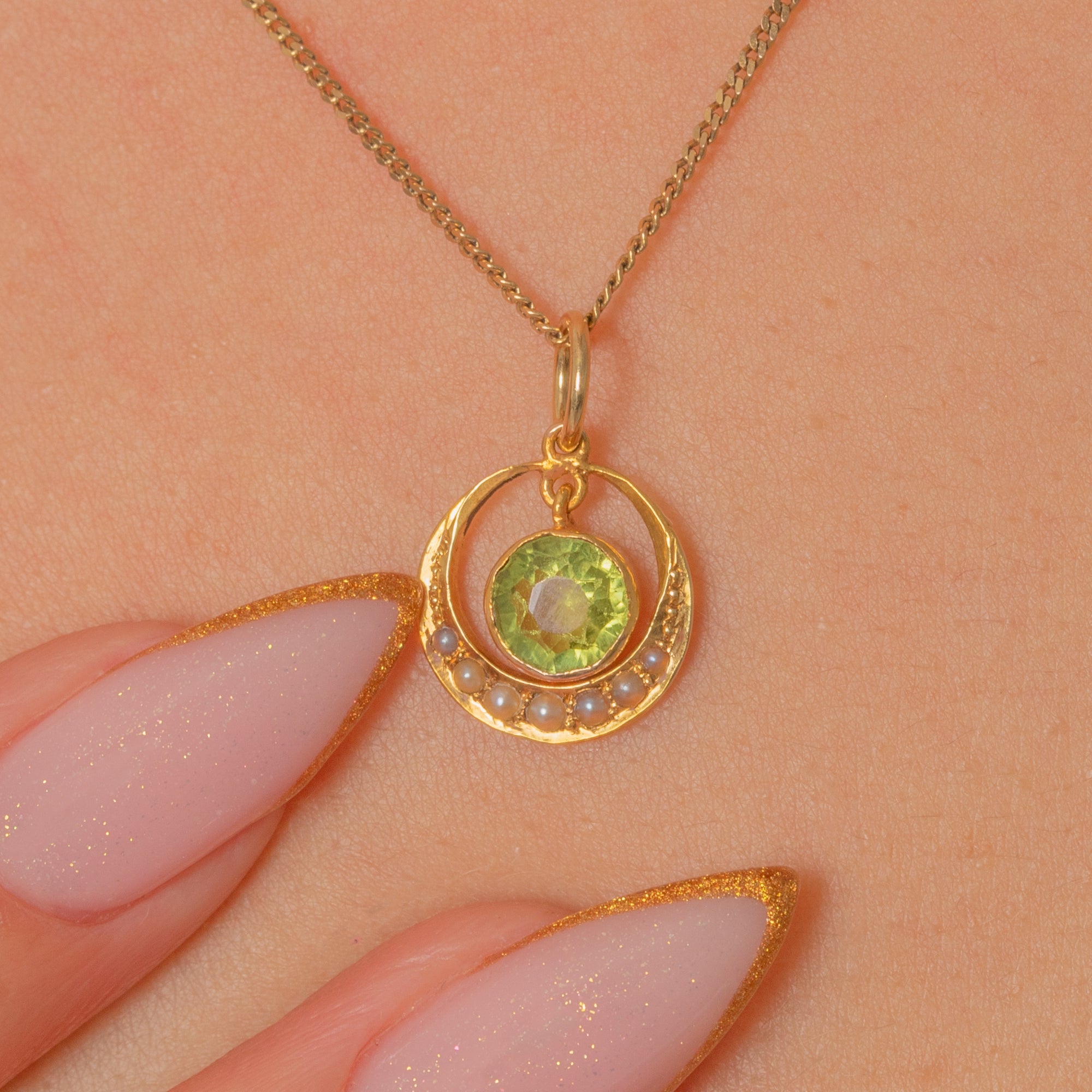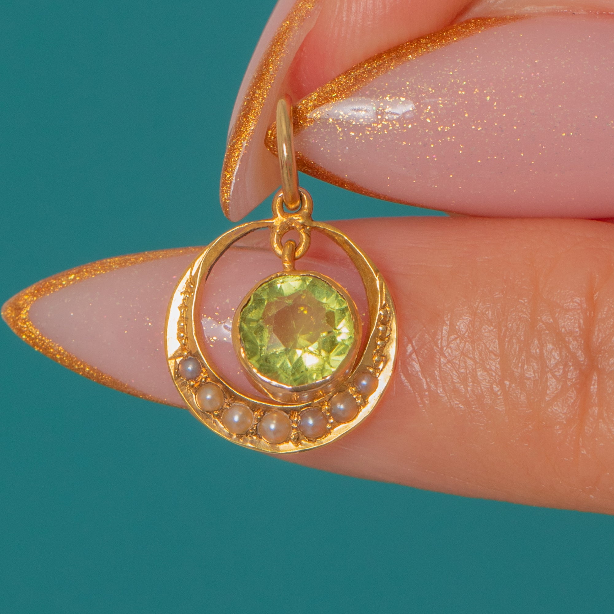 This delightful Victorian charm features a bright green Peridot surrounded by a halo of creamy natural Seed Pearls, all set in rich 15ct Gold. The design captures the soft romance and refined detail typical of late 19th-century jewellery, with the Peridot’s fresh, zesty hue beautifully offset by the gentle glow of the Pearls.