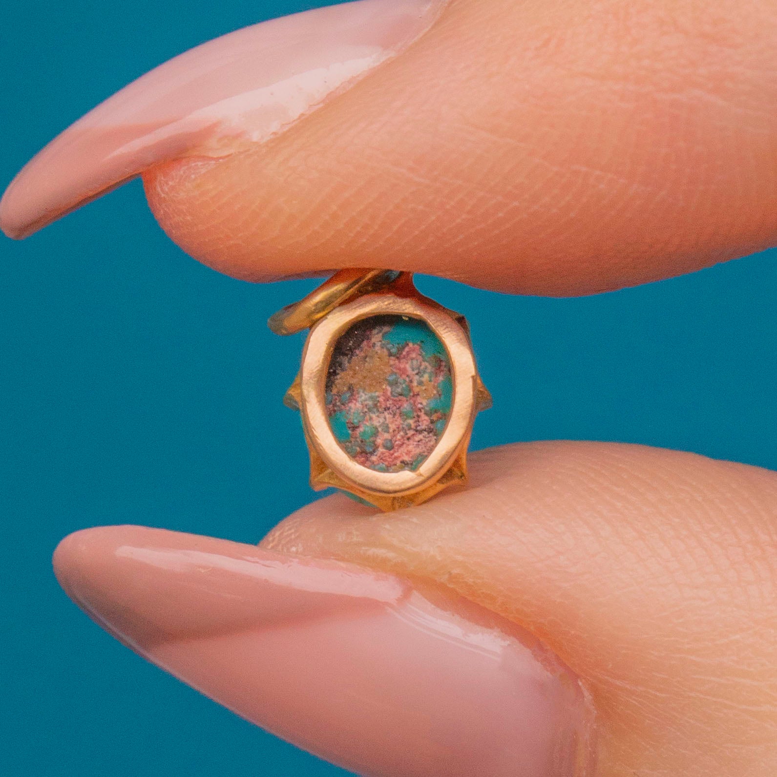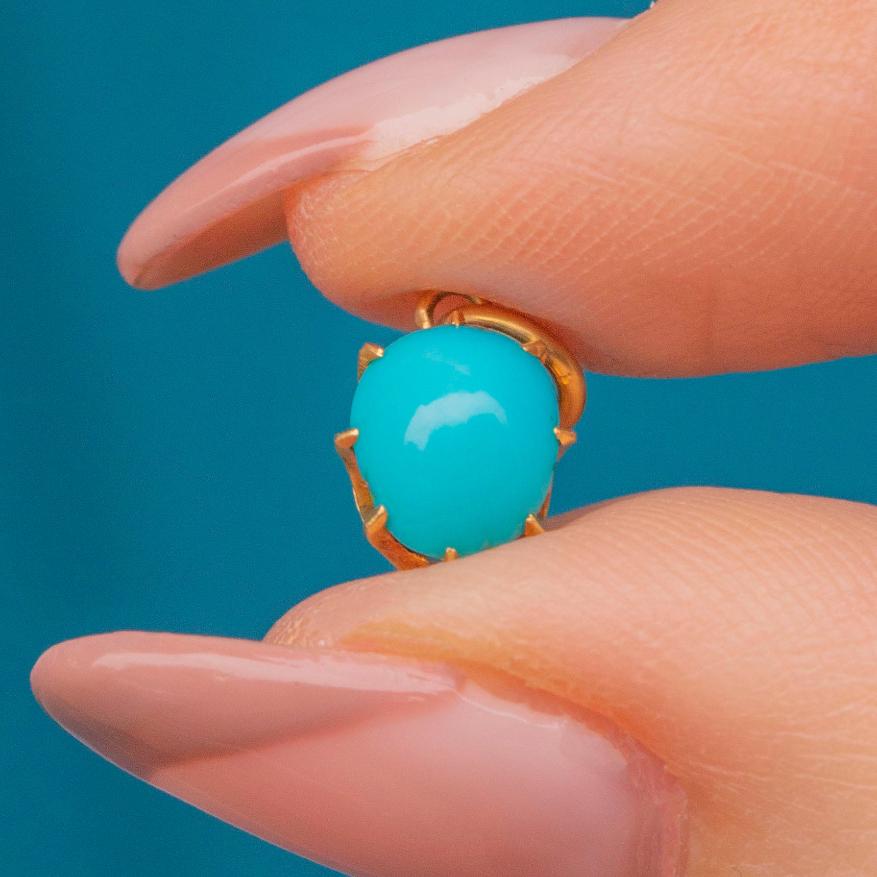 EXCELLENT. This Victorian 15ct Gold Persian Turquoise charm is in excellent condition. The Turquoise cabochon is smoothly domed, free from nibbles or scuffs, and securely held within its claws. The natural matrix is visible at the back, adding to its antique charm. The Gold is buttery and the jump ring is securely affixed, allowing you to enjoy this cute antique Turquoise charm with confidence!