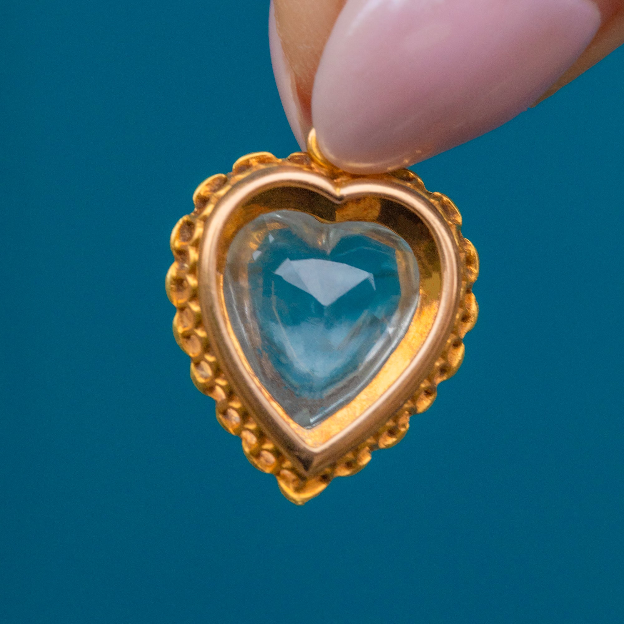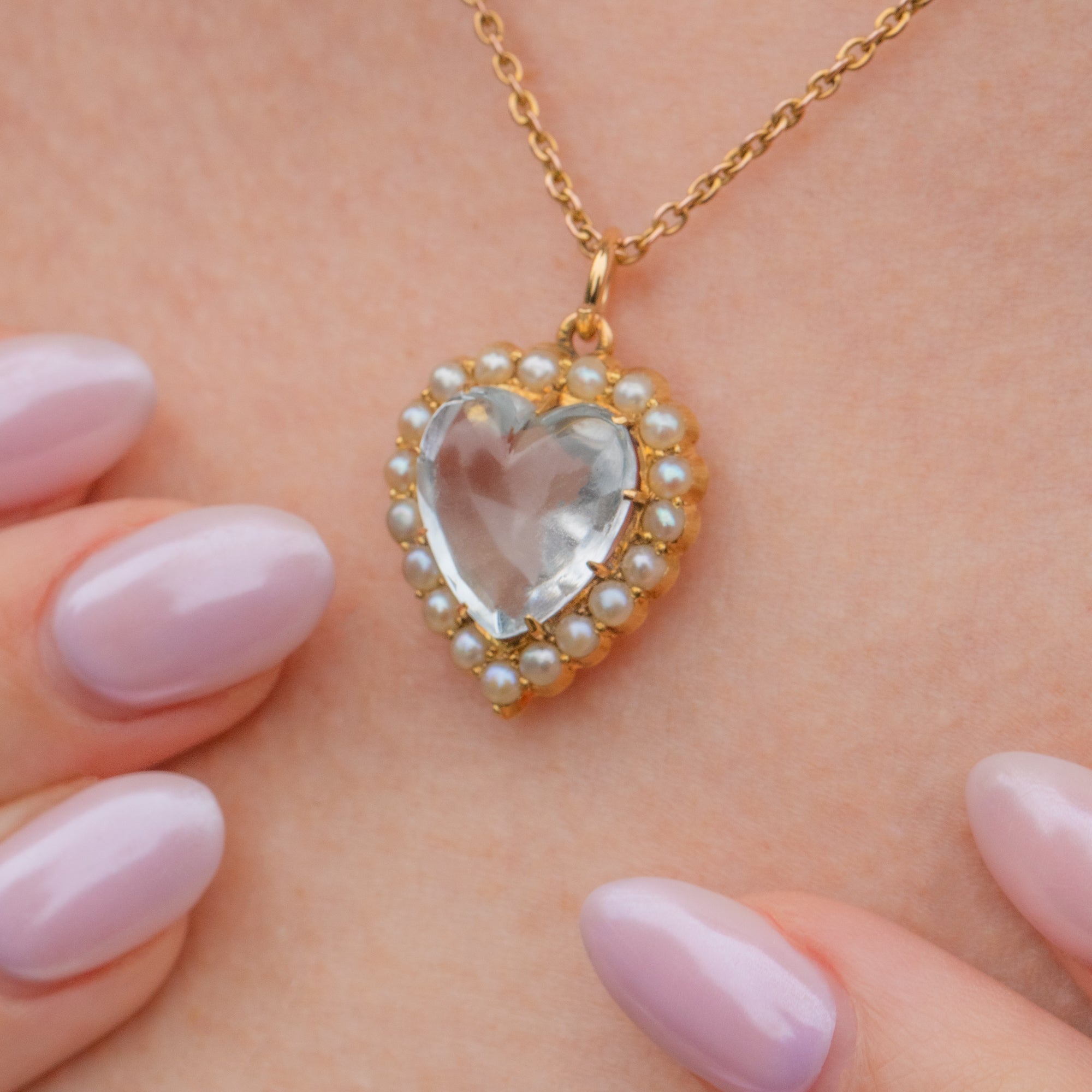 VERY GOOD. This Victorian 15ct Gold Rock Crystal Pearl heart pendant is in very good condition. The Rock Crystal has great form and sits securely within the claw settings. Although there is some subtle wear to the cabochon cut front, the different cut types creates a fabulous display in the light. Each Pearl is uniform and secure, displaying no damage to note. The Gold has a rich saturation throughout and is well formed allowing you to wear this pendant with confidence!